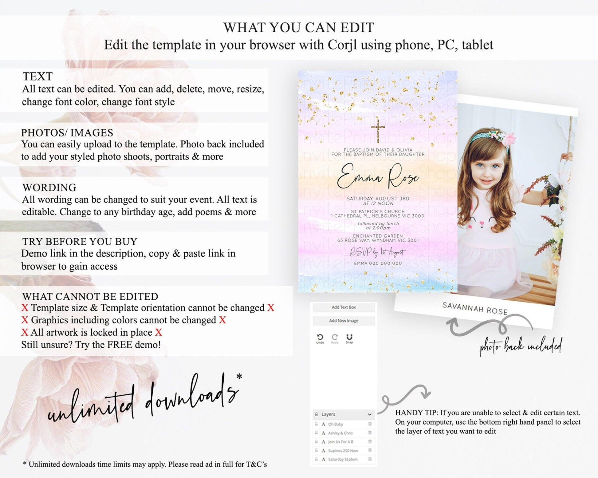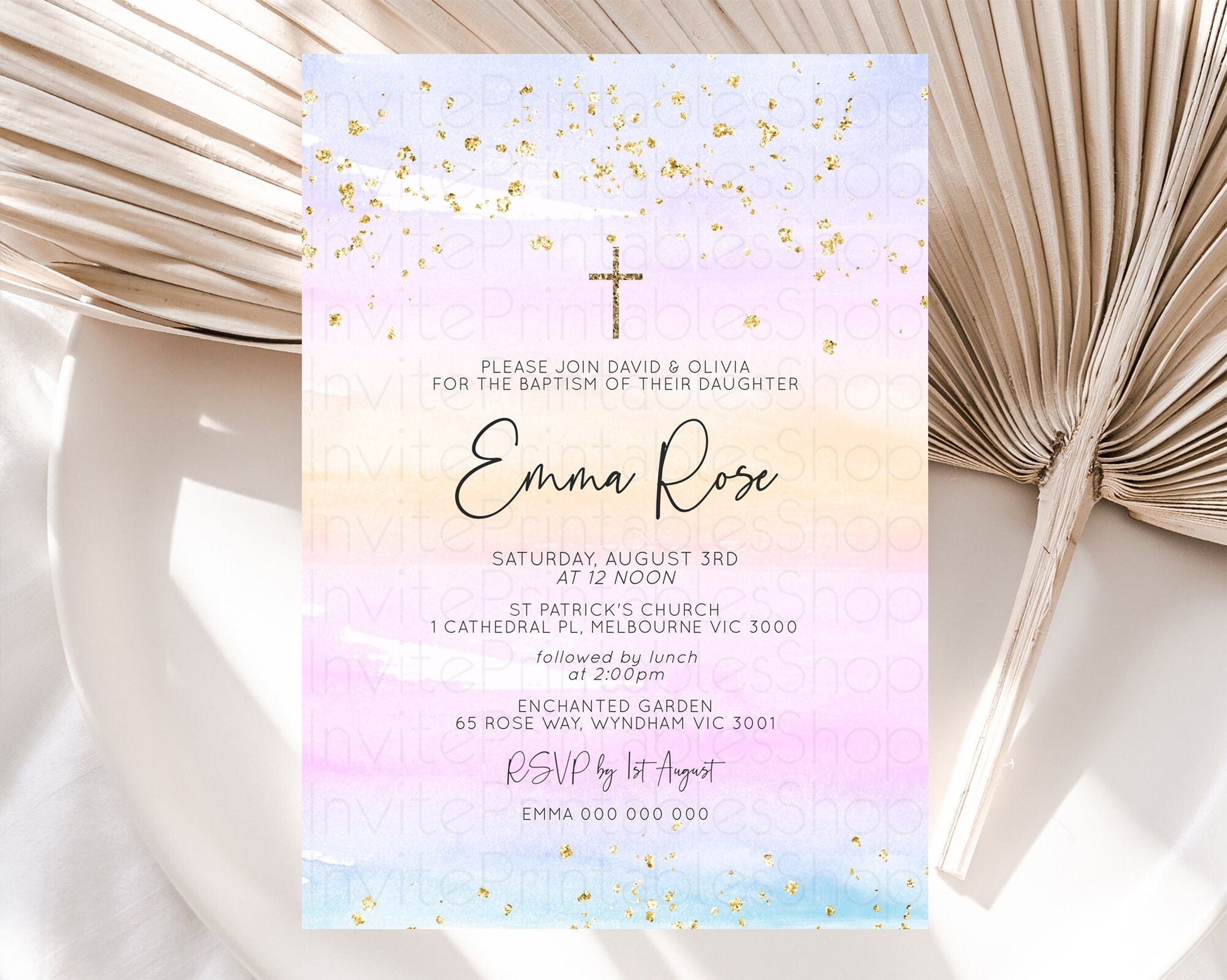 Pastel Baptism Invitation Pastel Colors Watercolor Baptism 1st Birthday Party Gold Ombre Pastel Rainbow Christening Holy Communion D10594