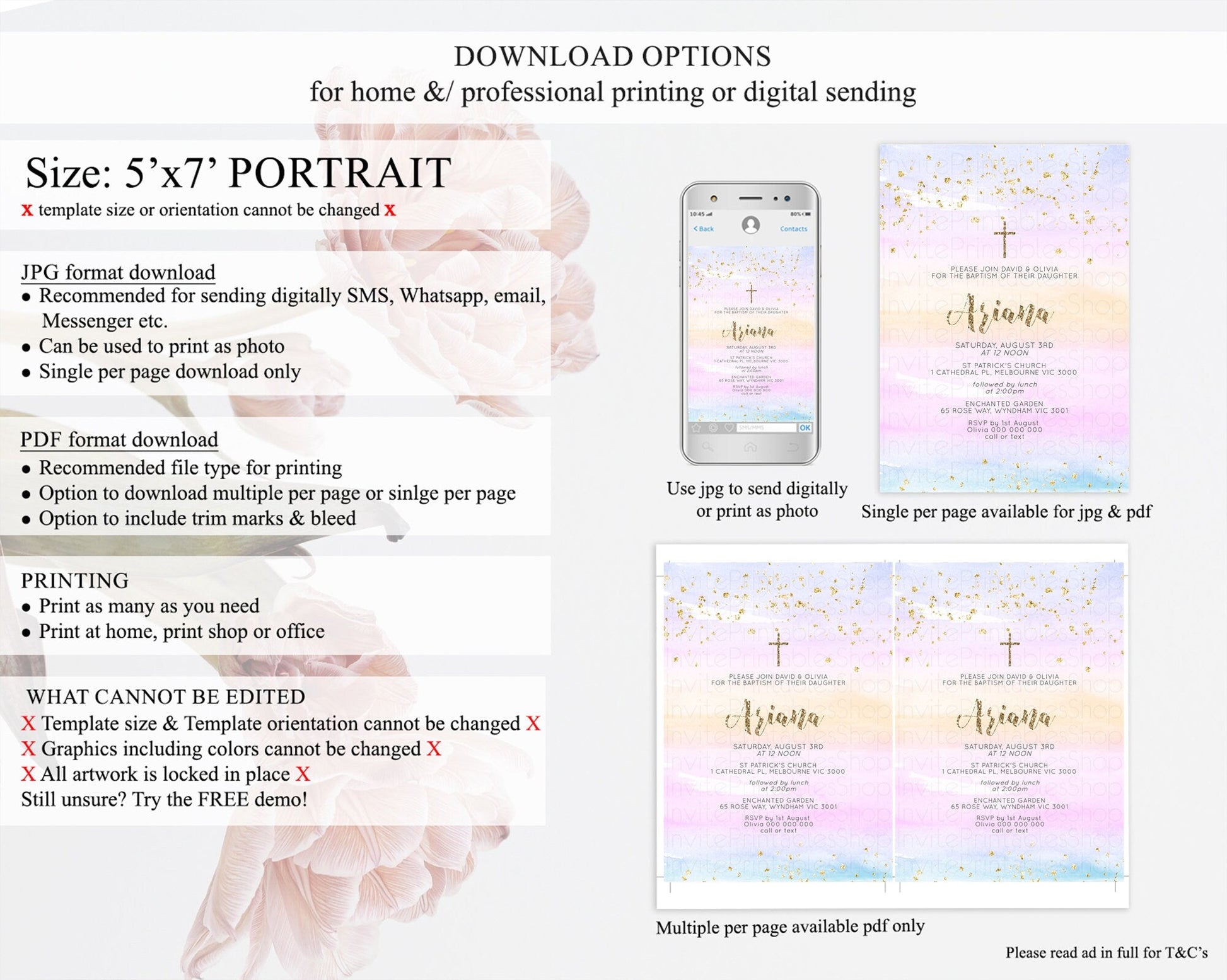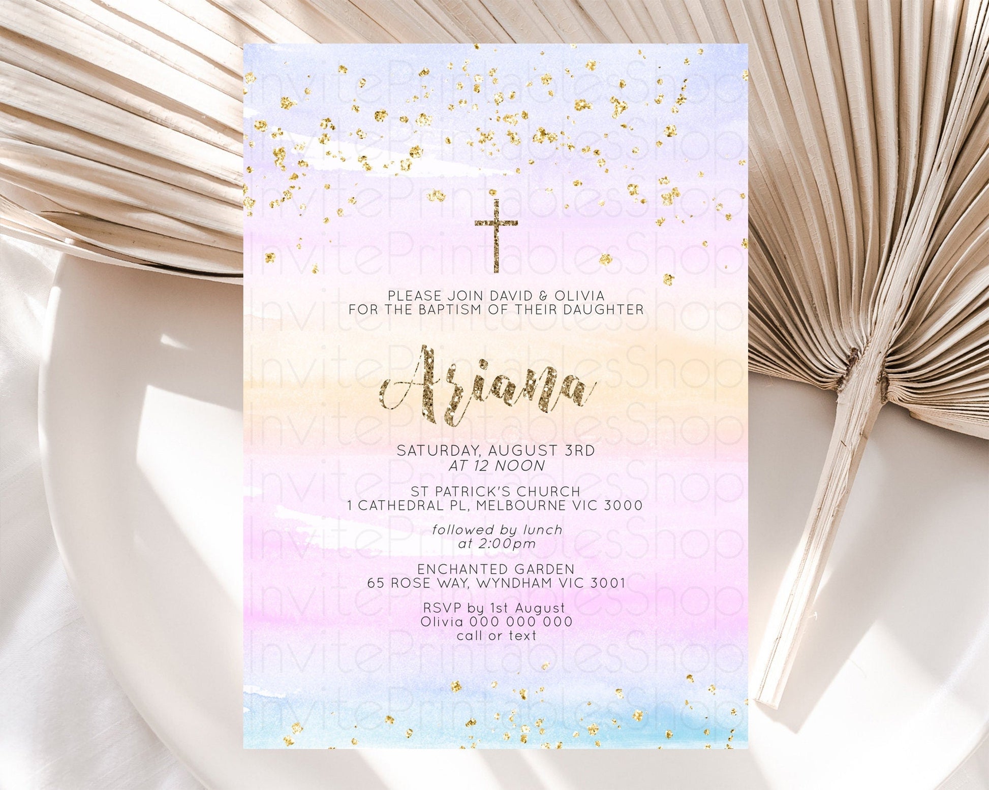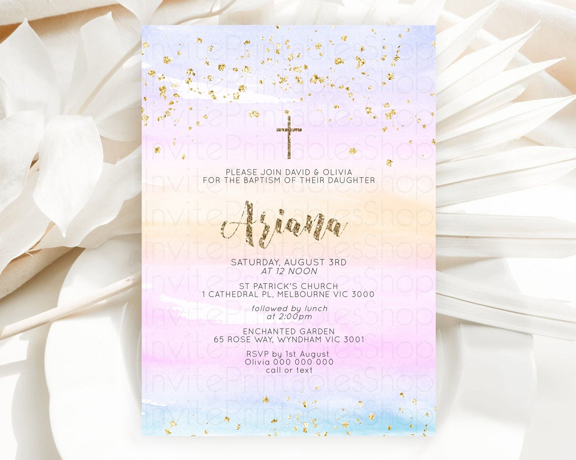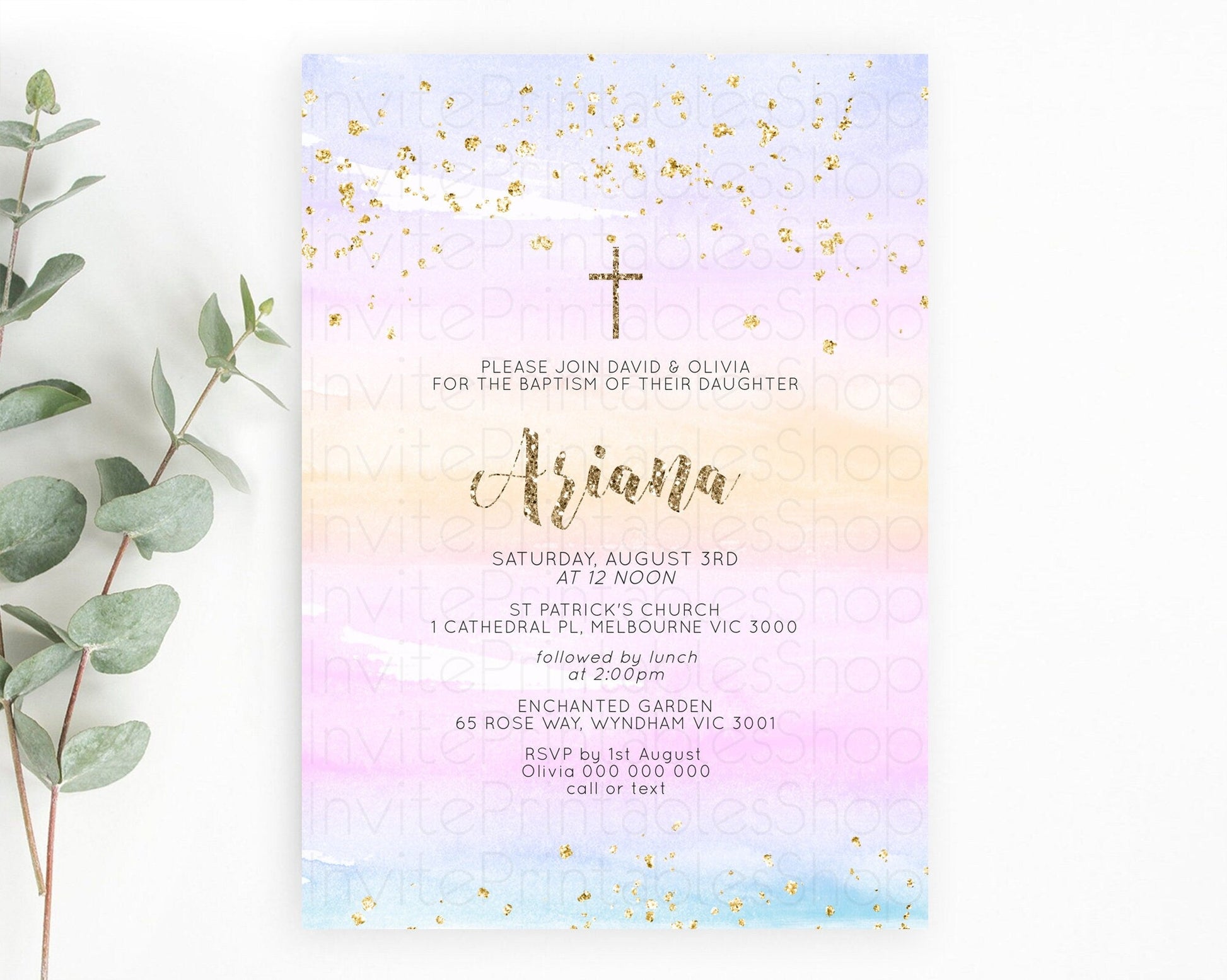 Pastel Baptism Invitation Pastel Colors Watercolor Baptism 1st Birthday Party Gold Ombre Pastel Rainbow Christening Holy Communion D10595