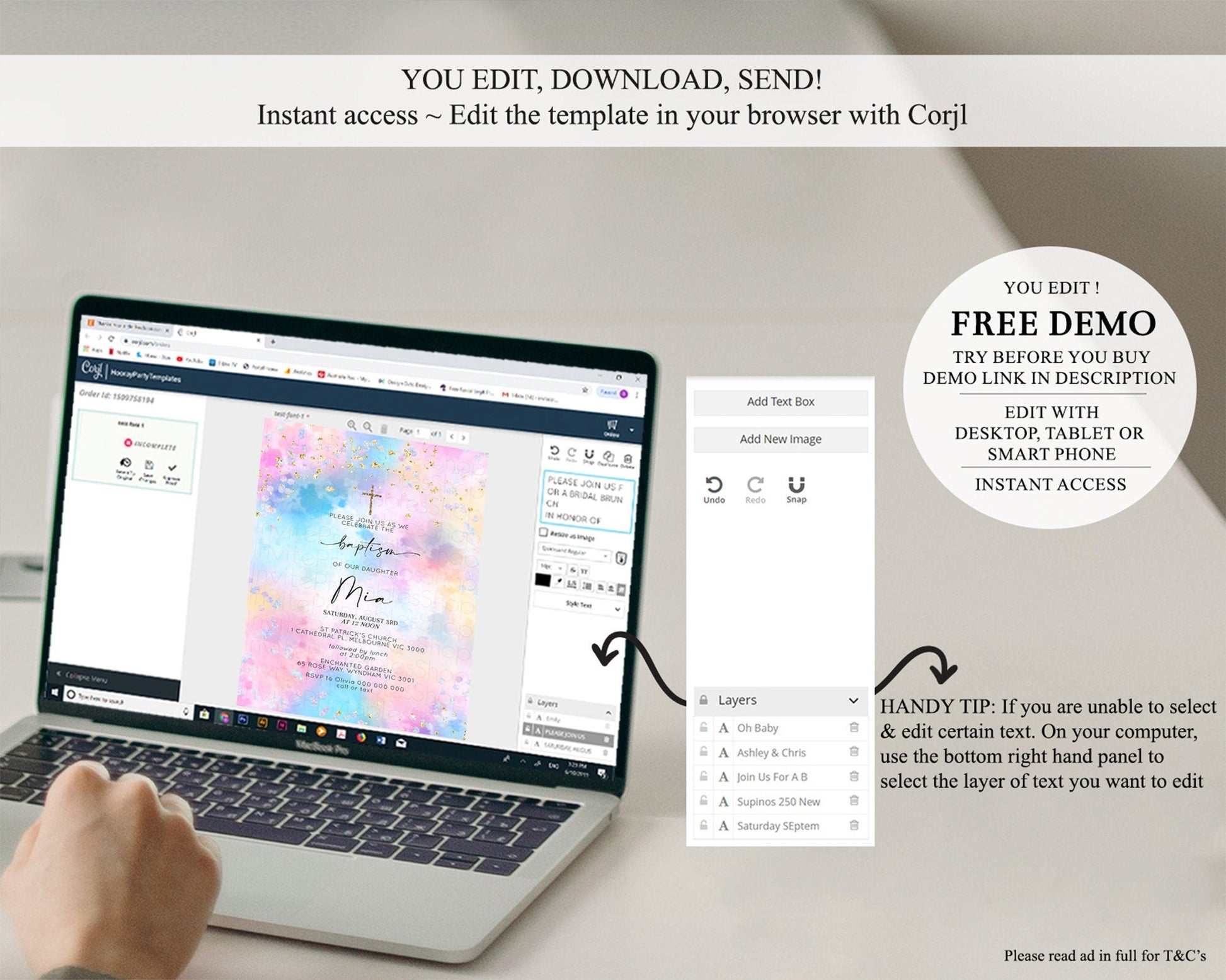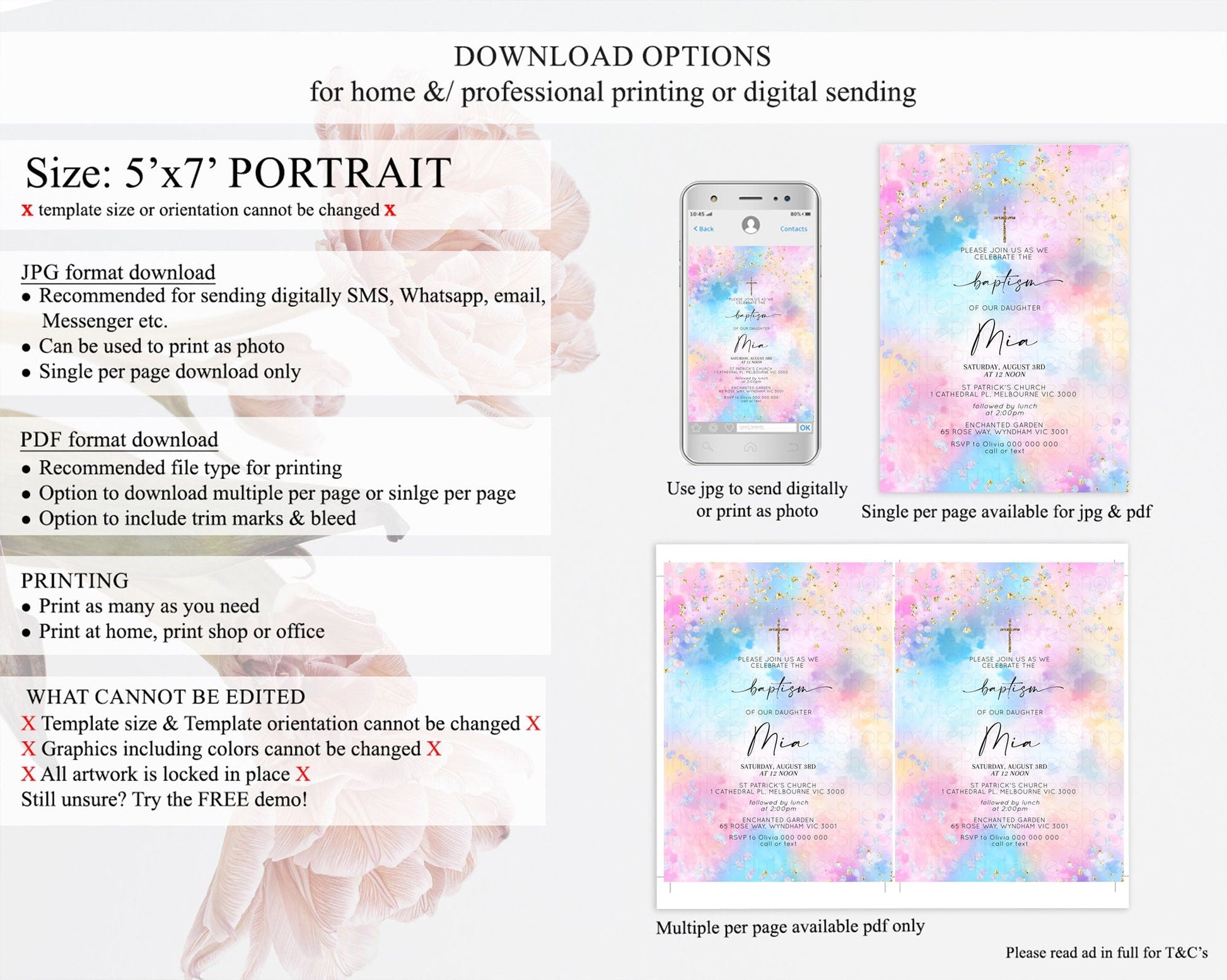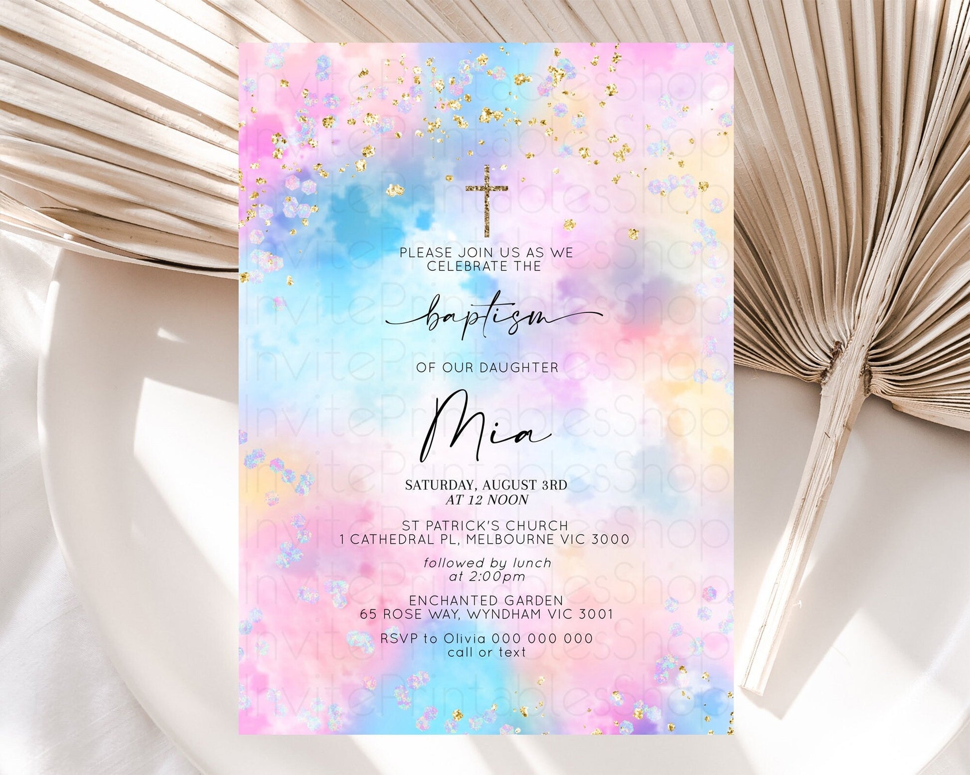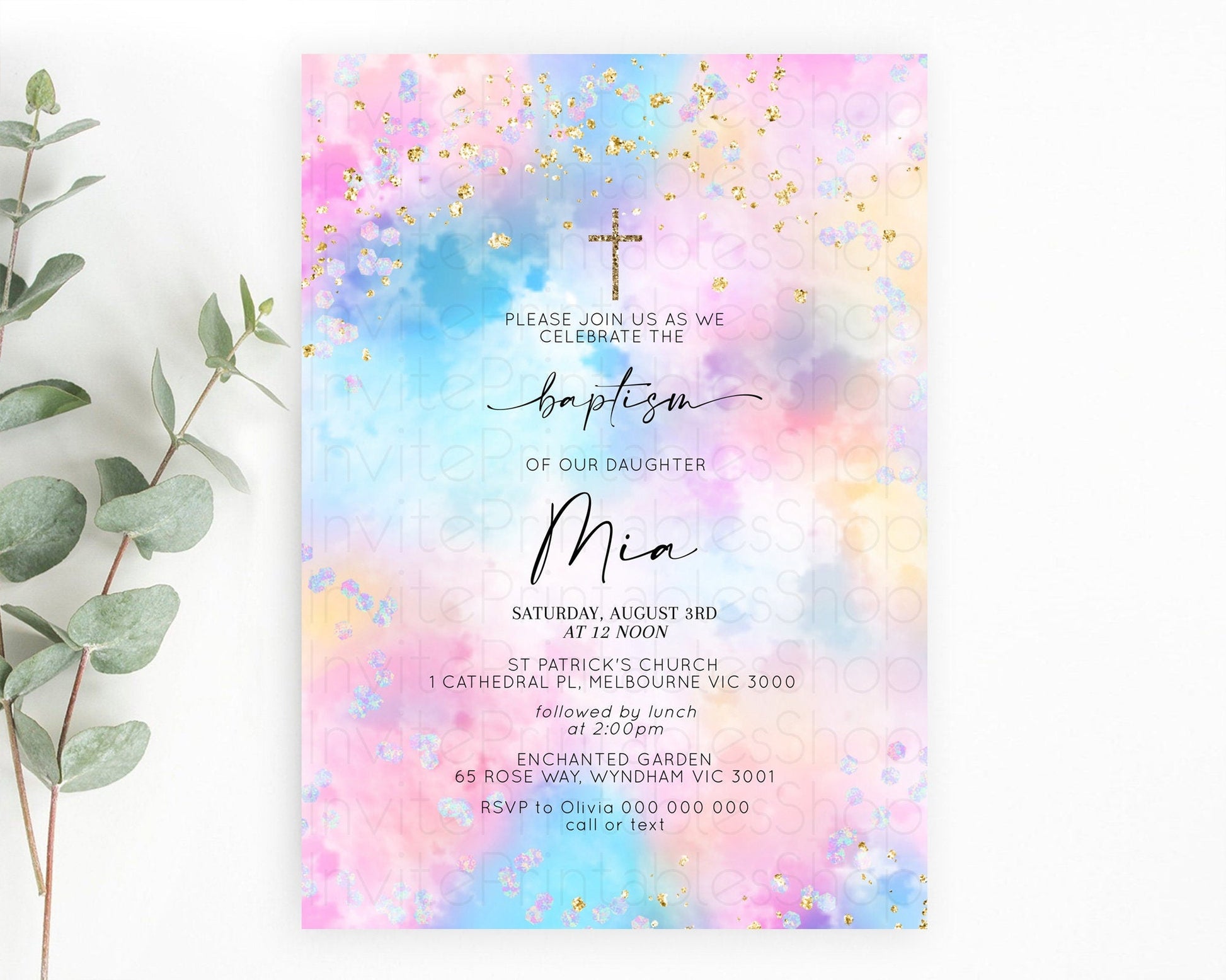 Pastel Baptism Invitation Pastel Colors Watercolor Baptism 1st Birthday Party Gold Ombre Pastel Rainbow Christening Holy Communion D10607