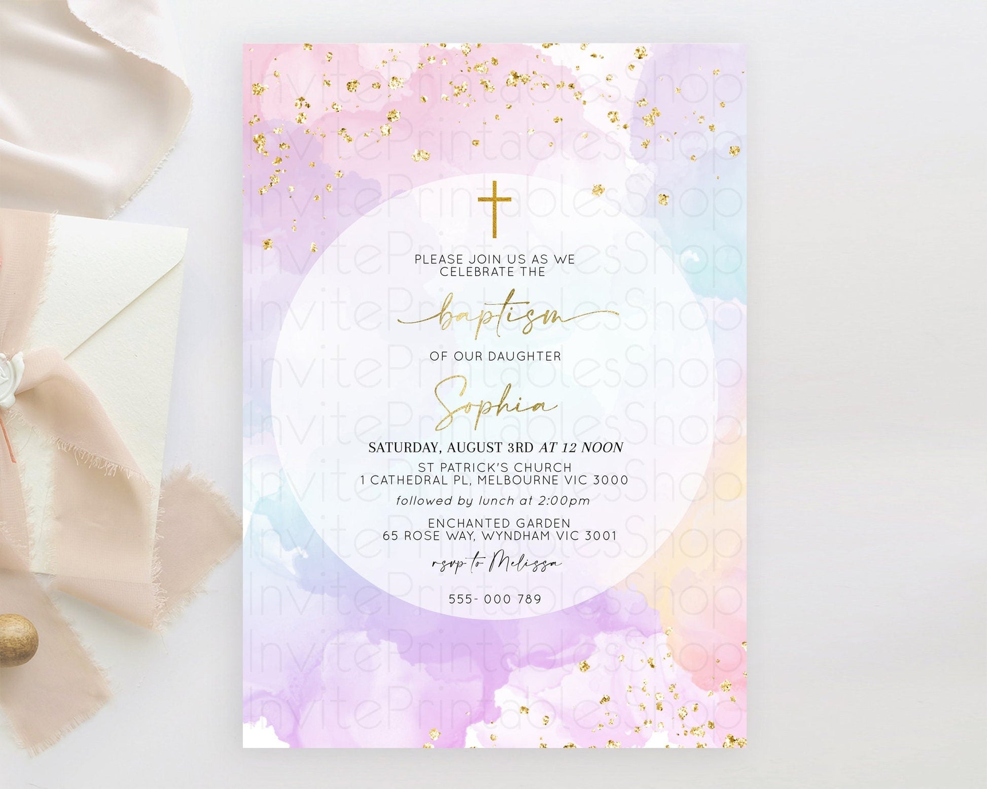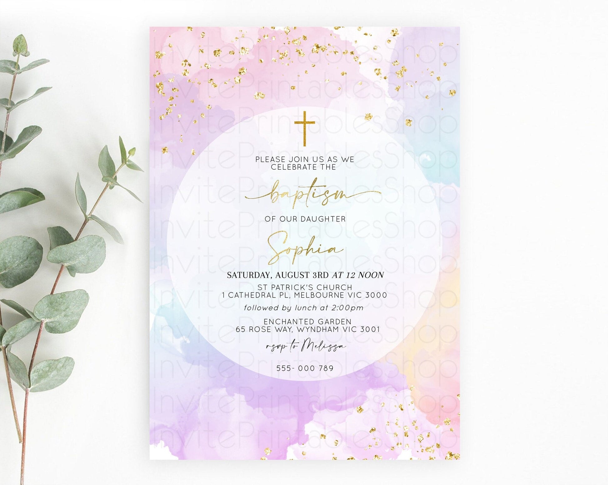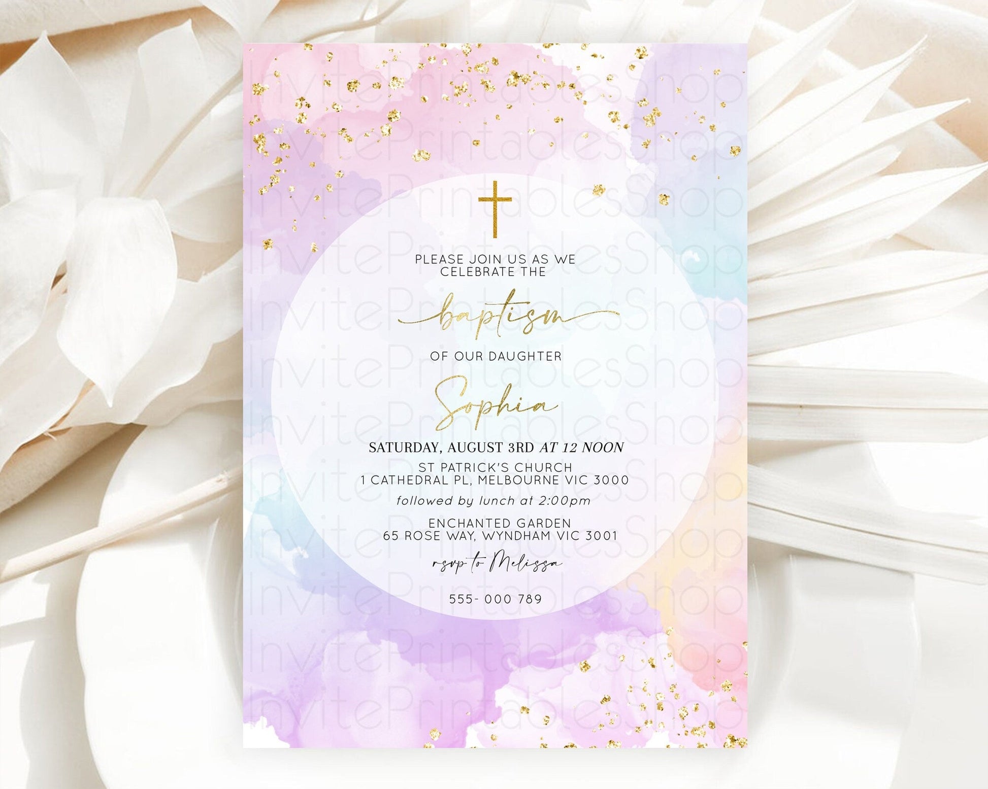 Pastel Baptism Invitation Pastel Colors Watercolor Baptism 1st Birthday Party Gold Ombre Pastel Rainbow Christening Holy Communion D10623