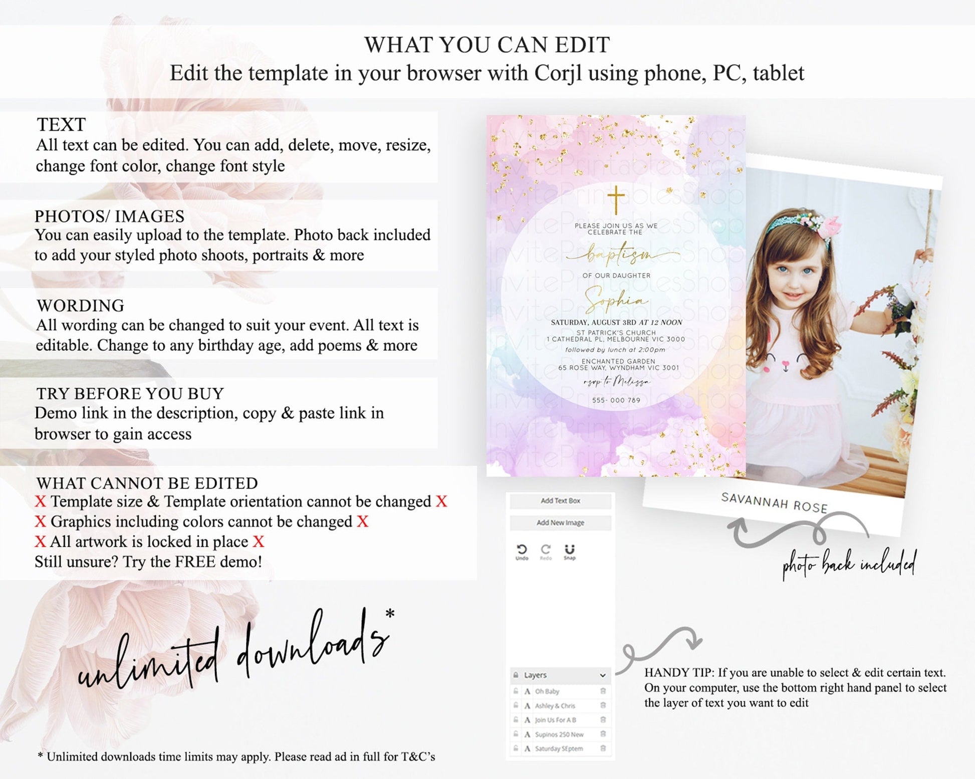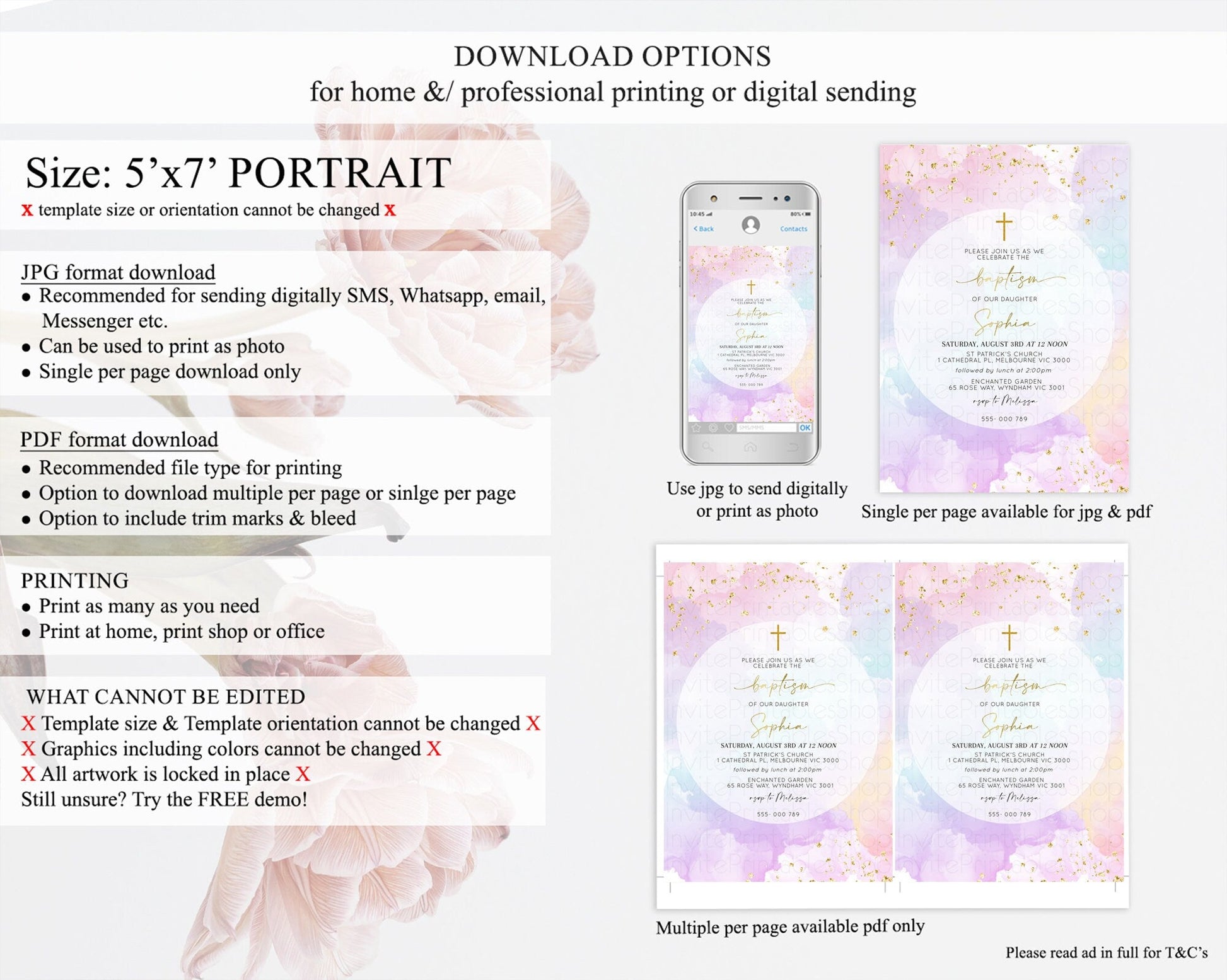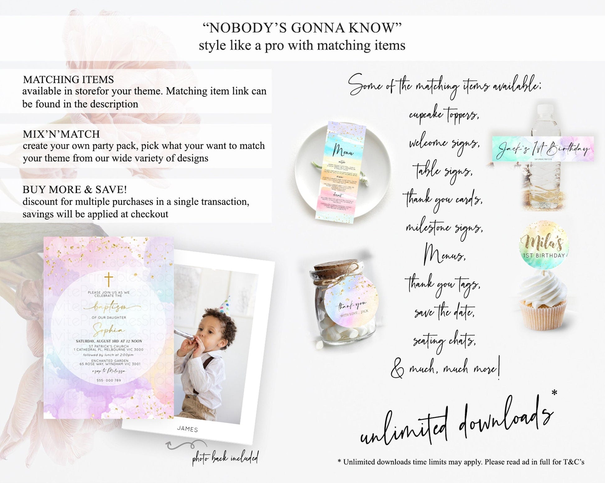 Pastel Baptism Invitation Pastel Colors Watercolor Baptism 1st Birthday Party Gold Ombre Pastel Rainbow Christening Holy Communion D10623
