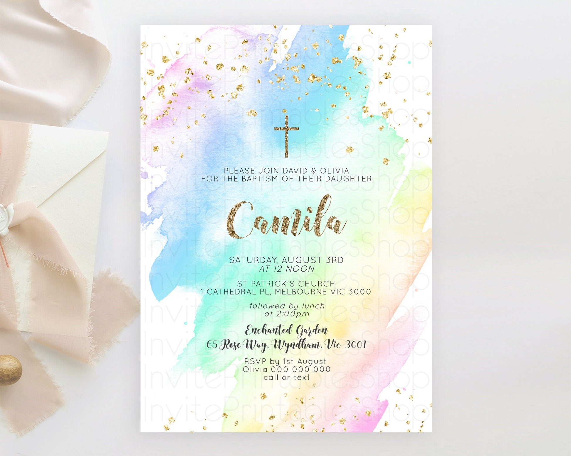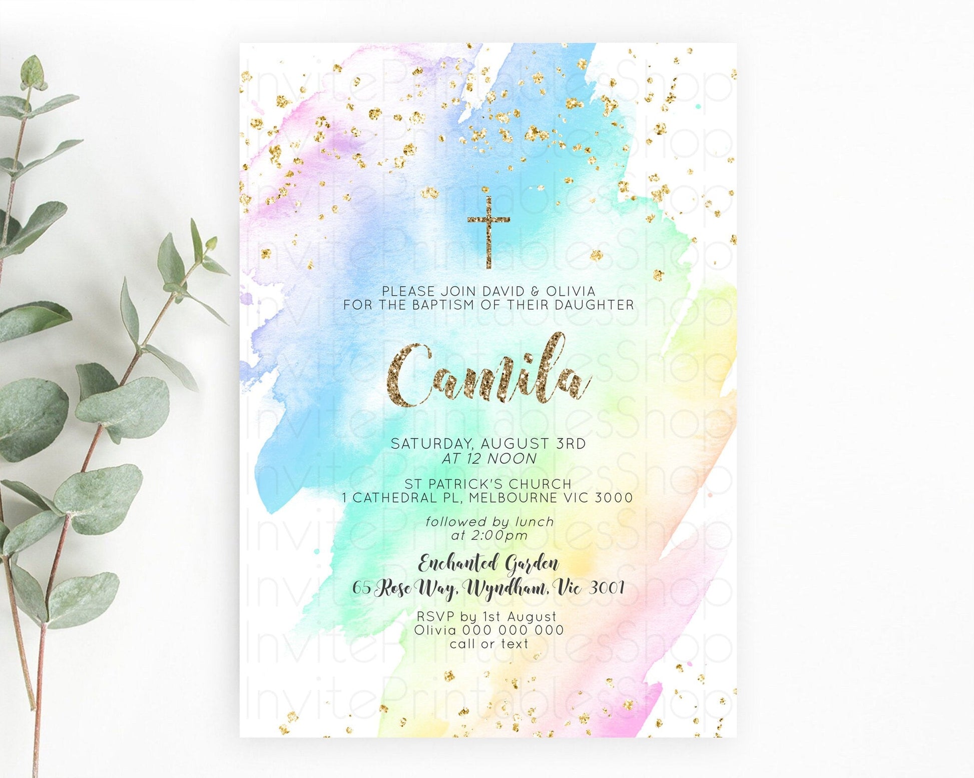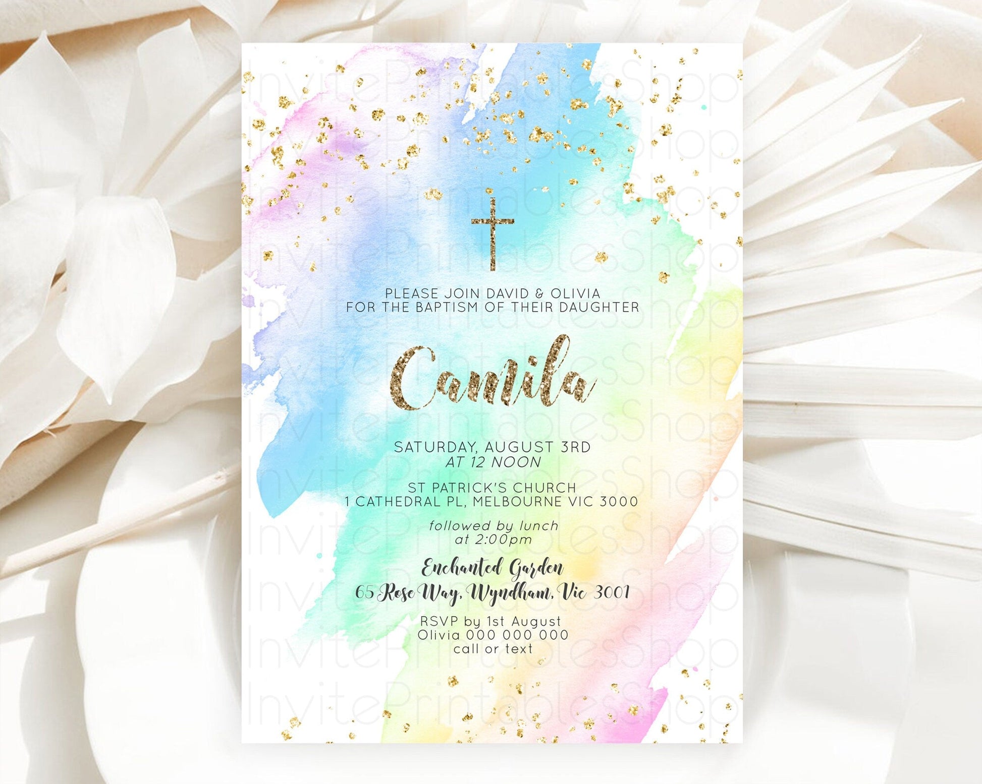 Pastel Baptism Invitation Pastel Colors Watercolor Baptism 1st Birthday Party Gold Ombre Pastel Rainbow Christening Holy Communion D10637