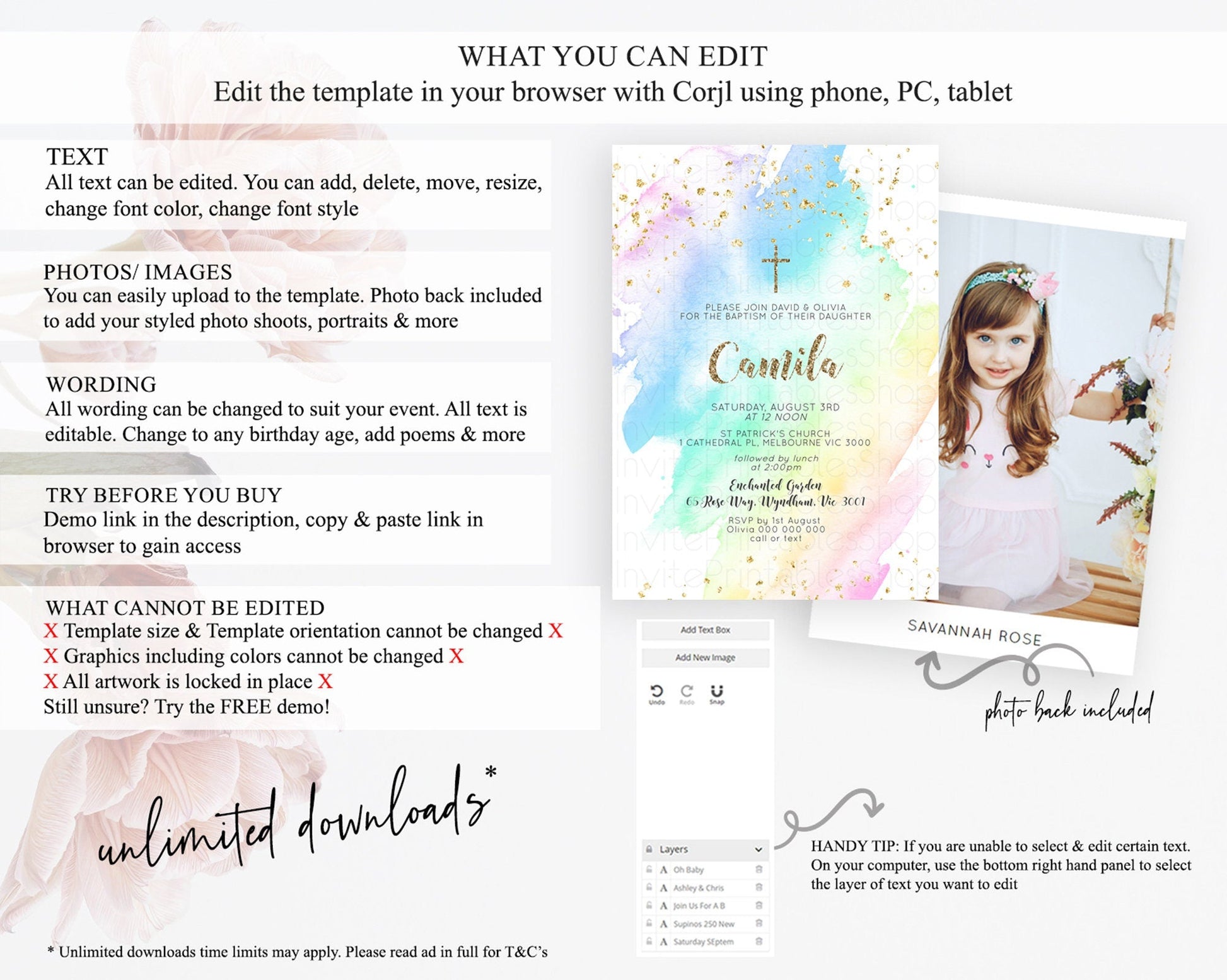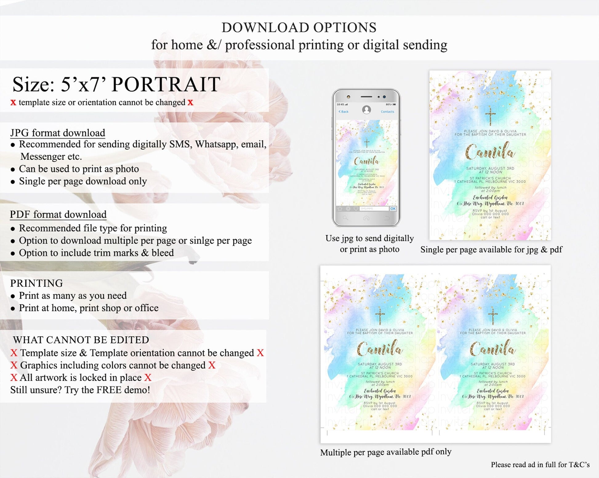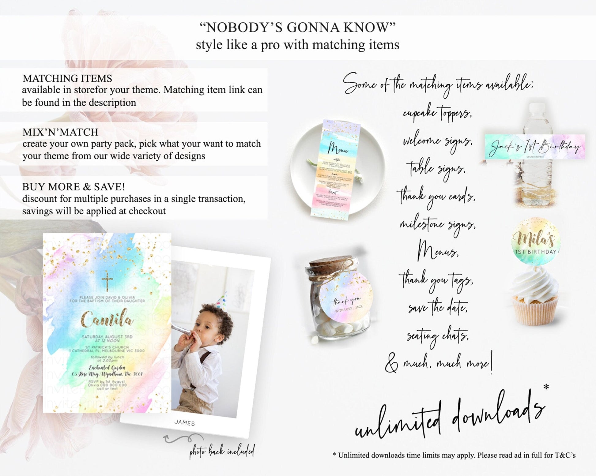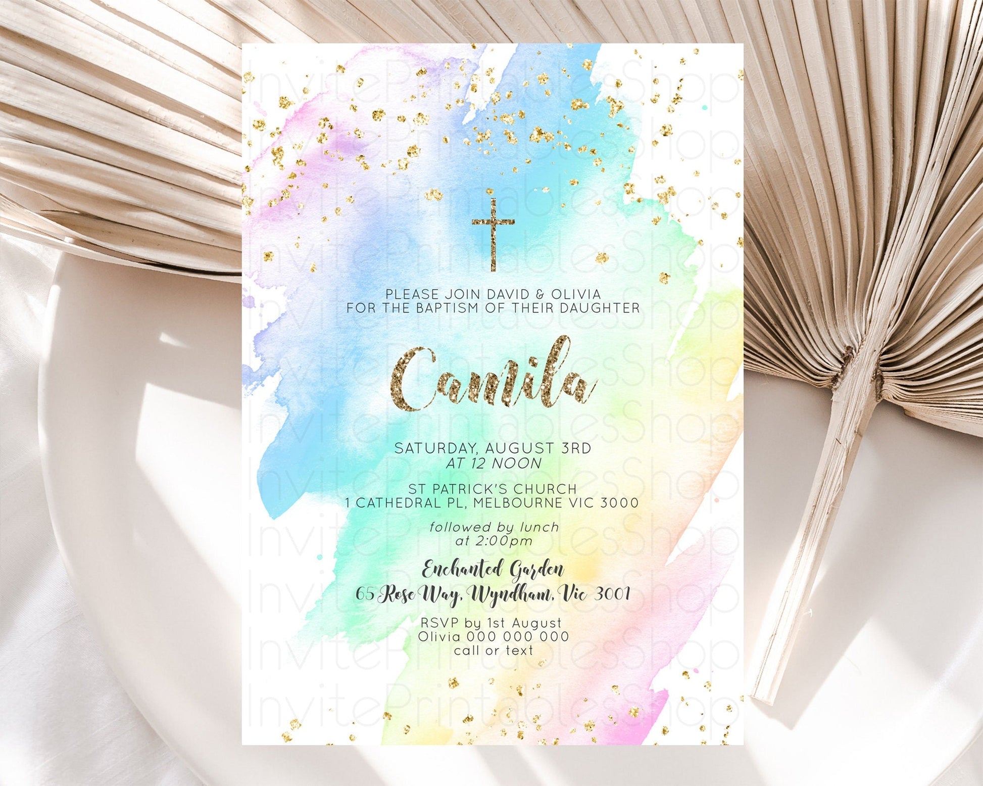 Pastel Baptism Invitation Pastel Colors Watercolor Baptism 1st Birthday Party Gold Ombre Pastel Rainbow Christening Holy Communion D10637