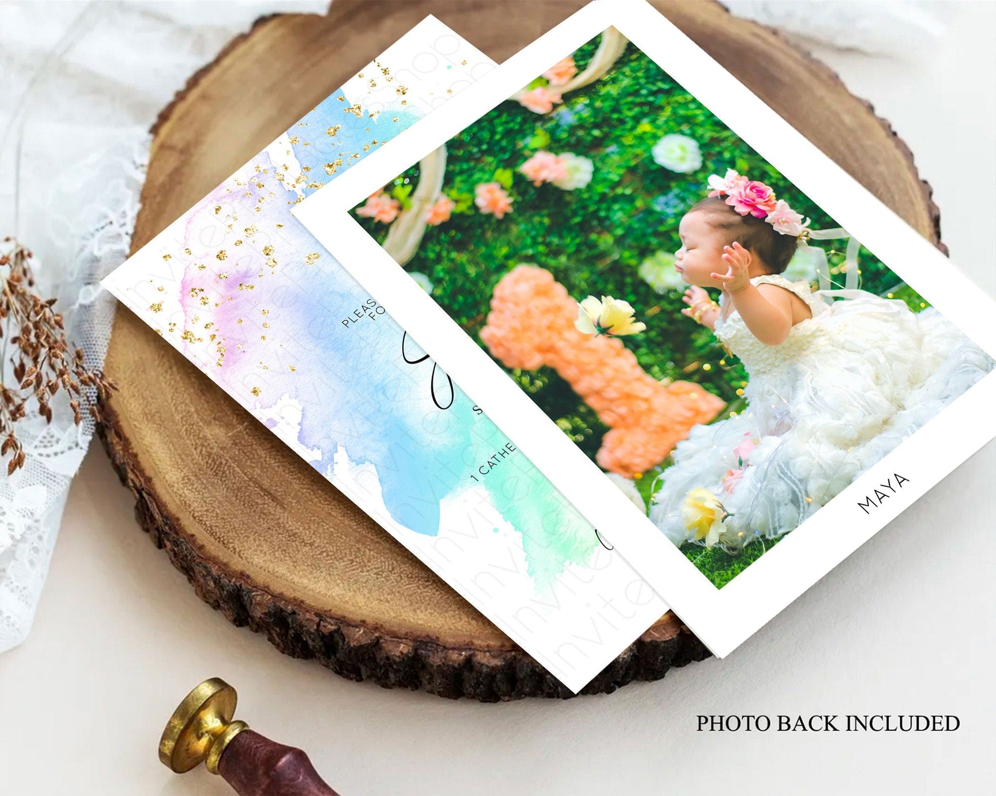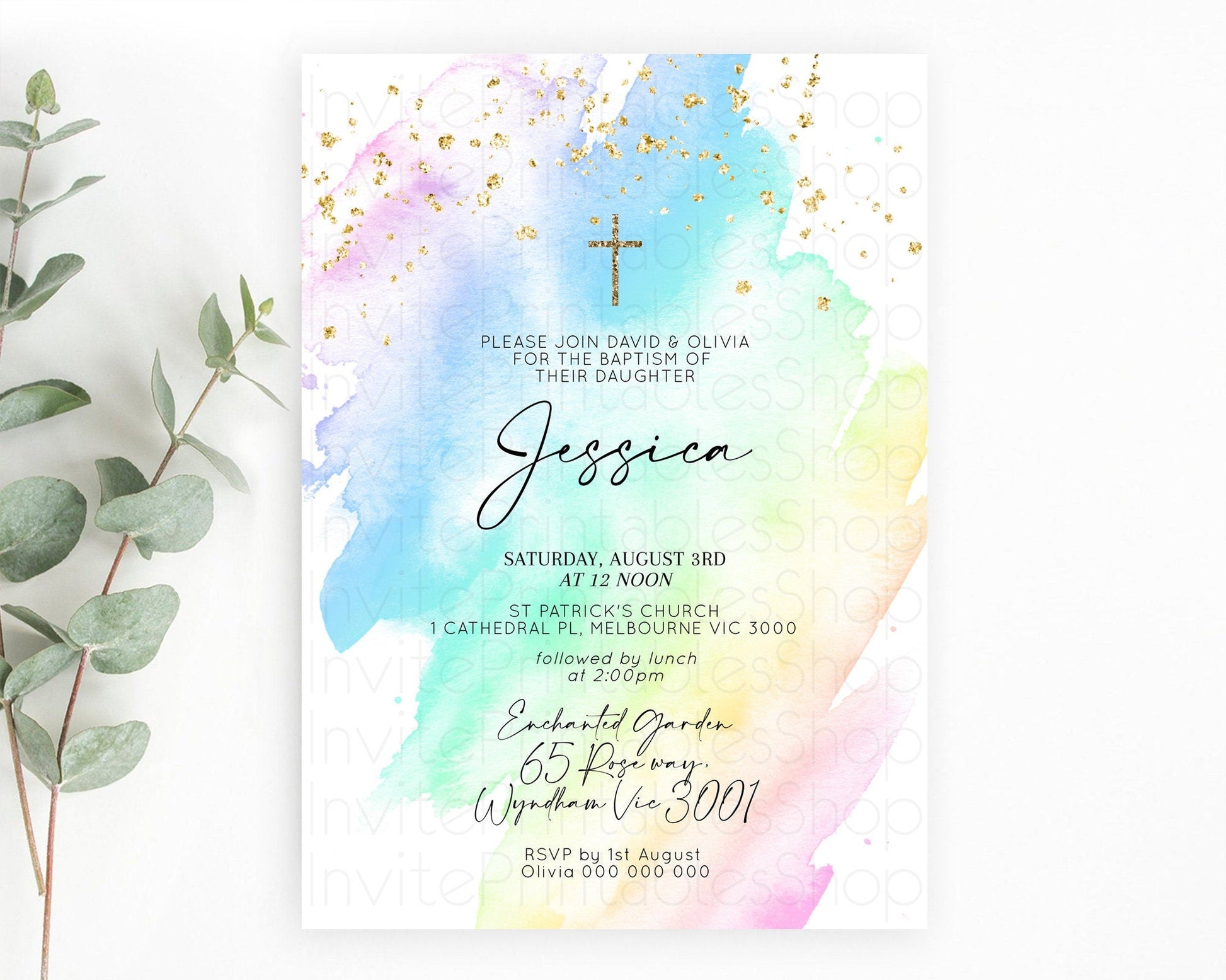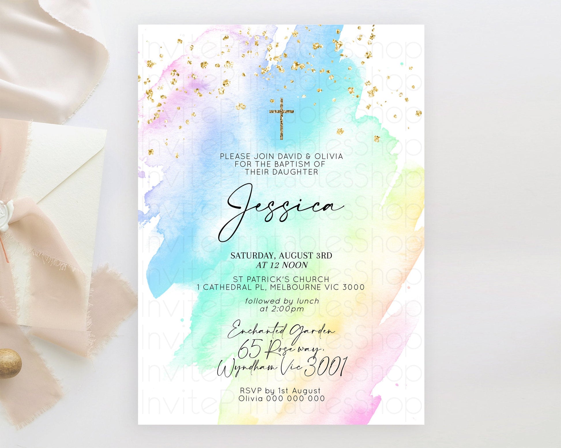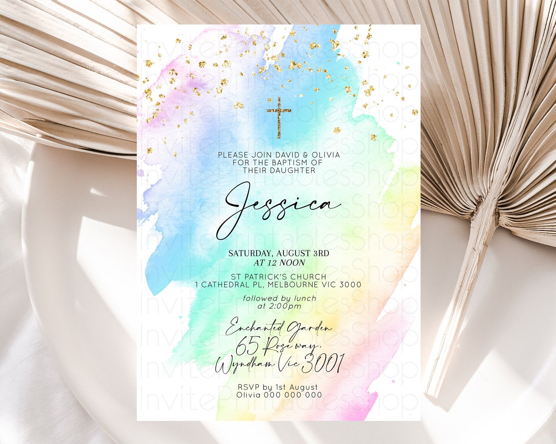 Pastel Baptism Invitation Pastel Colors Watercolor Baptism 1st Birthday Party Gold Ombre Pastel Rainbow Christening Holy Communion D10640