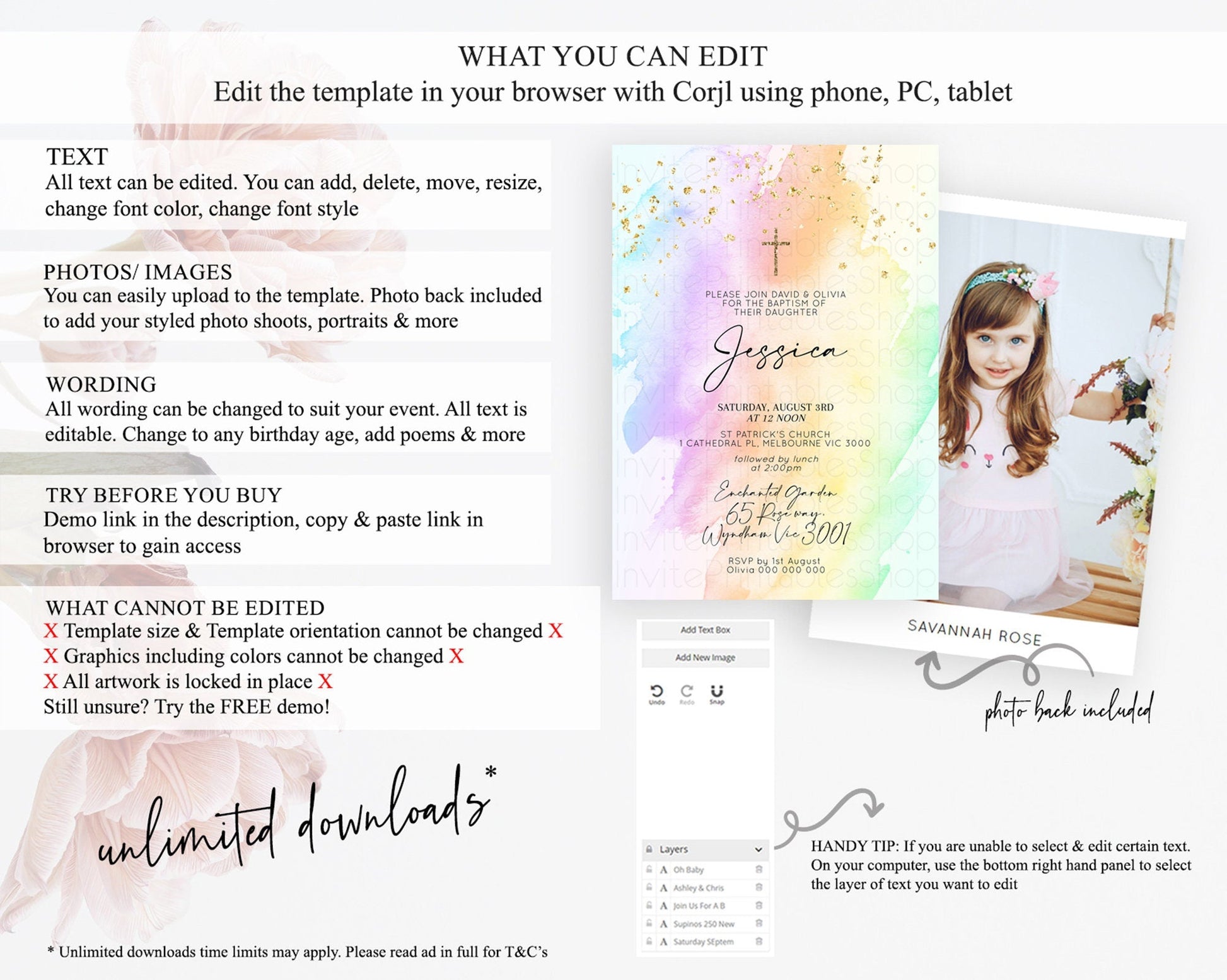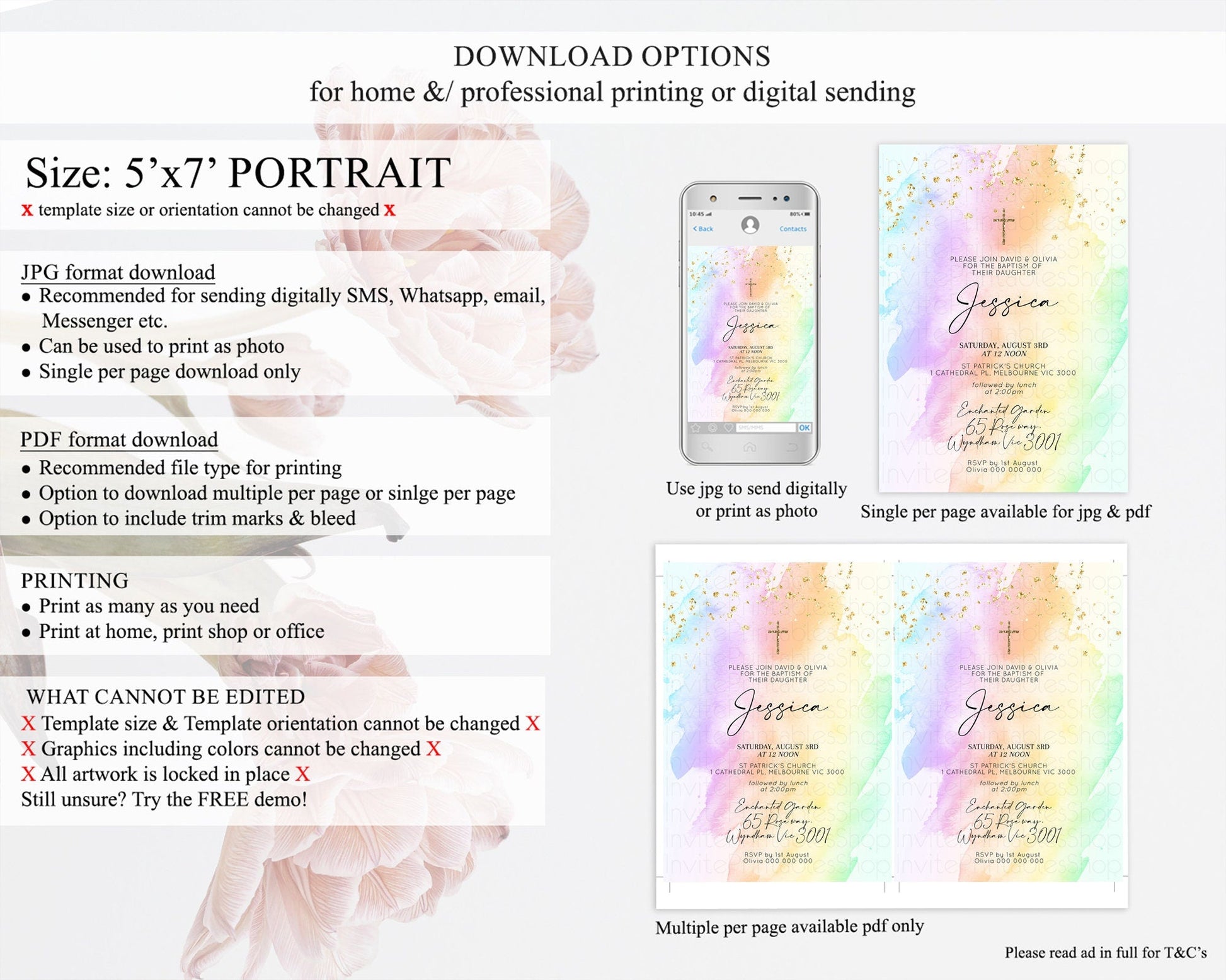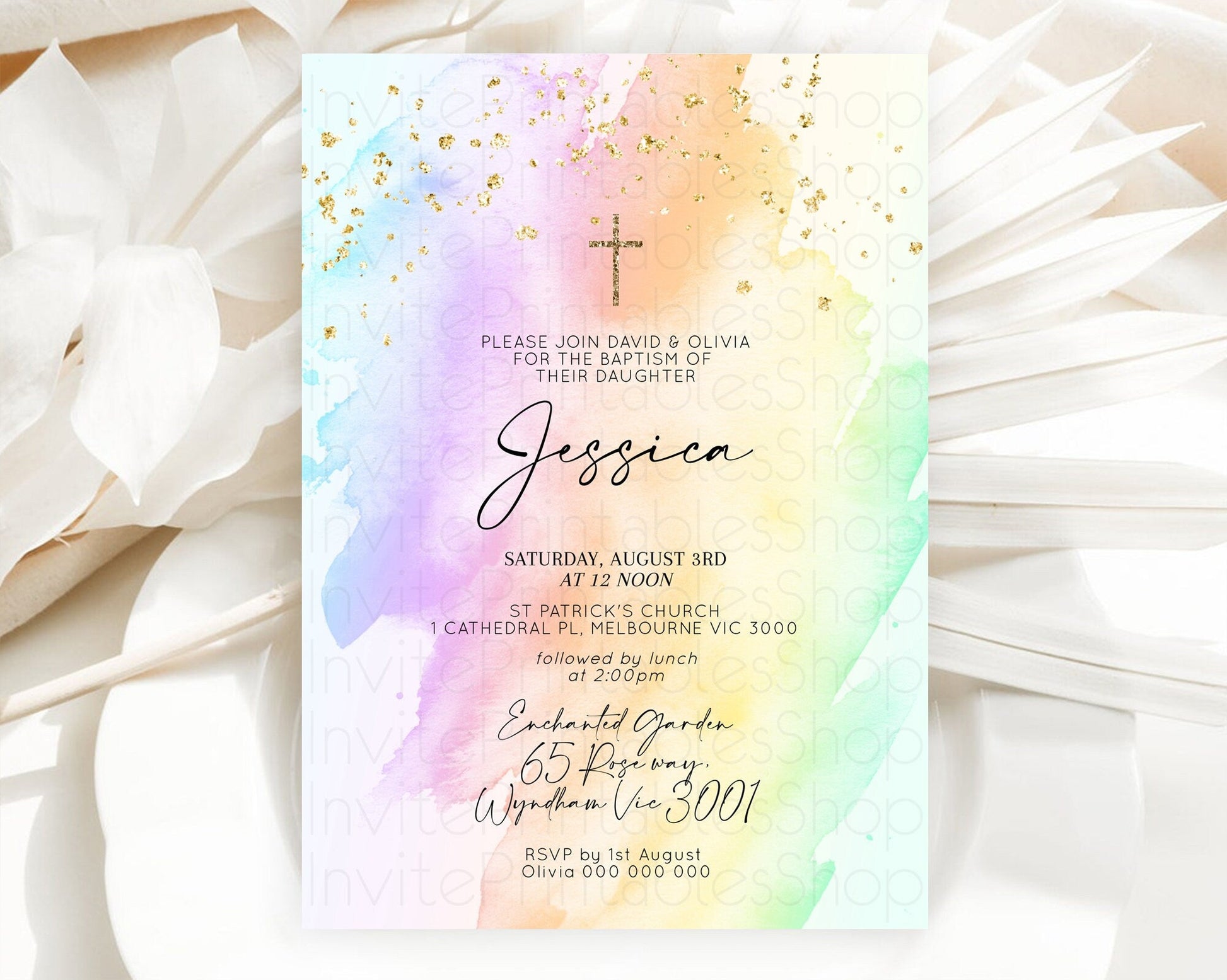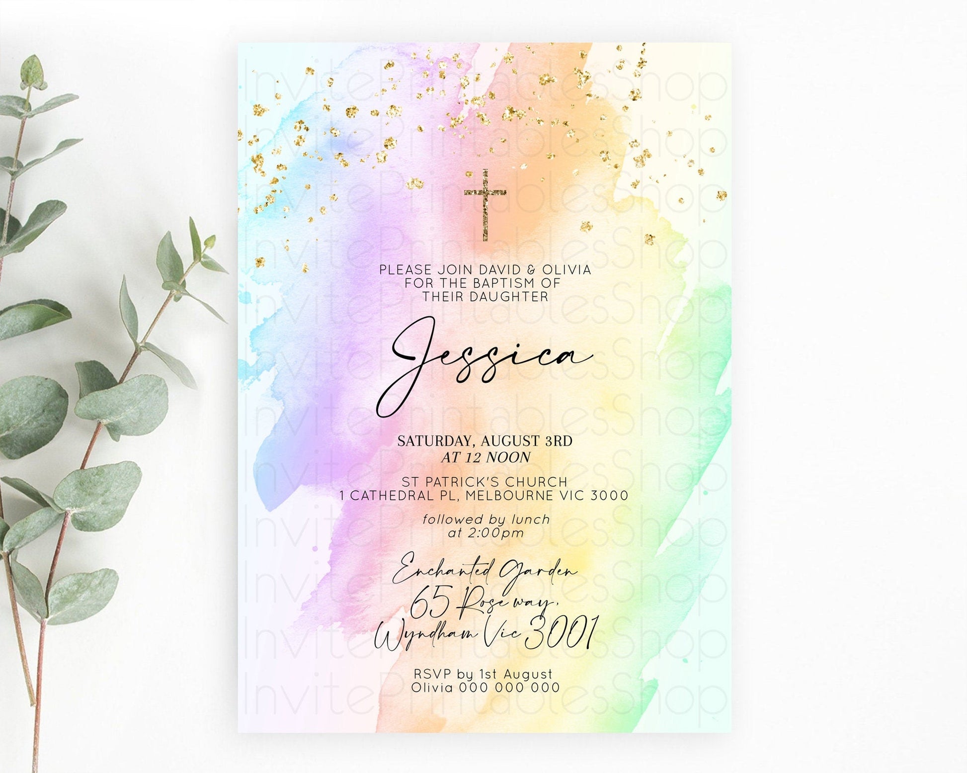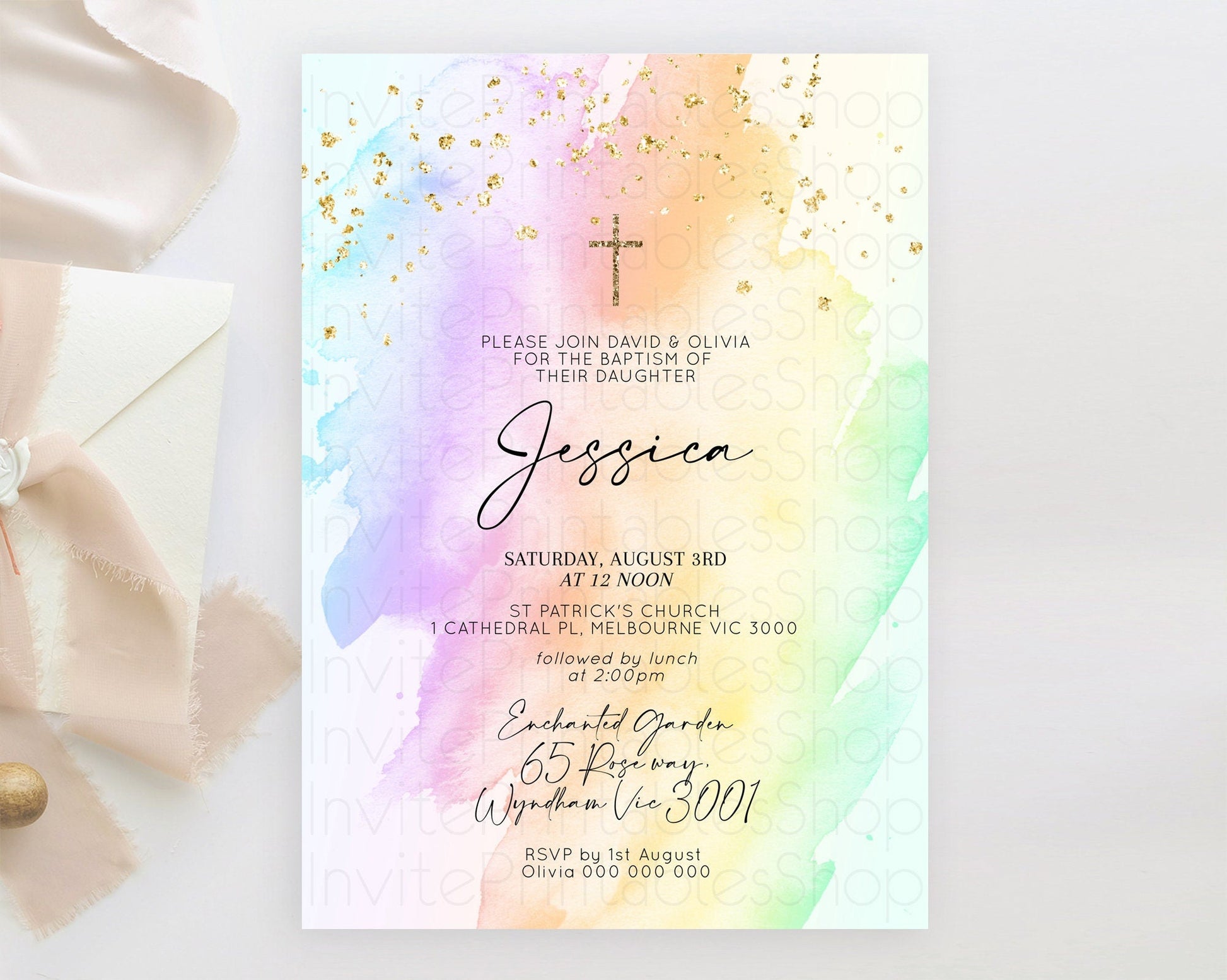 Pastel Baptism Invitation Pastel Colors Watercolor Baptism 1st Birthday Party Gold Ombre Pastel Rainbow Christening Holy Communion D10645