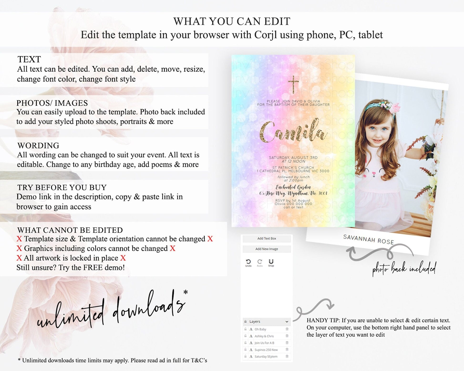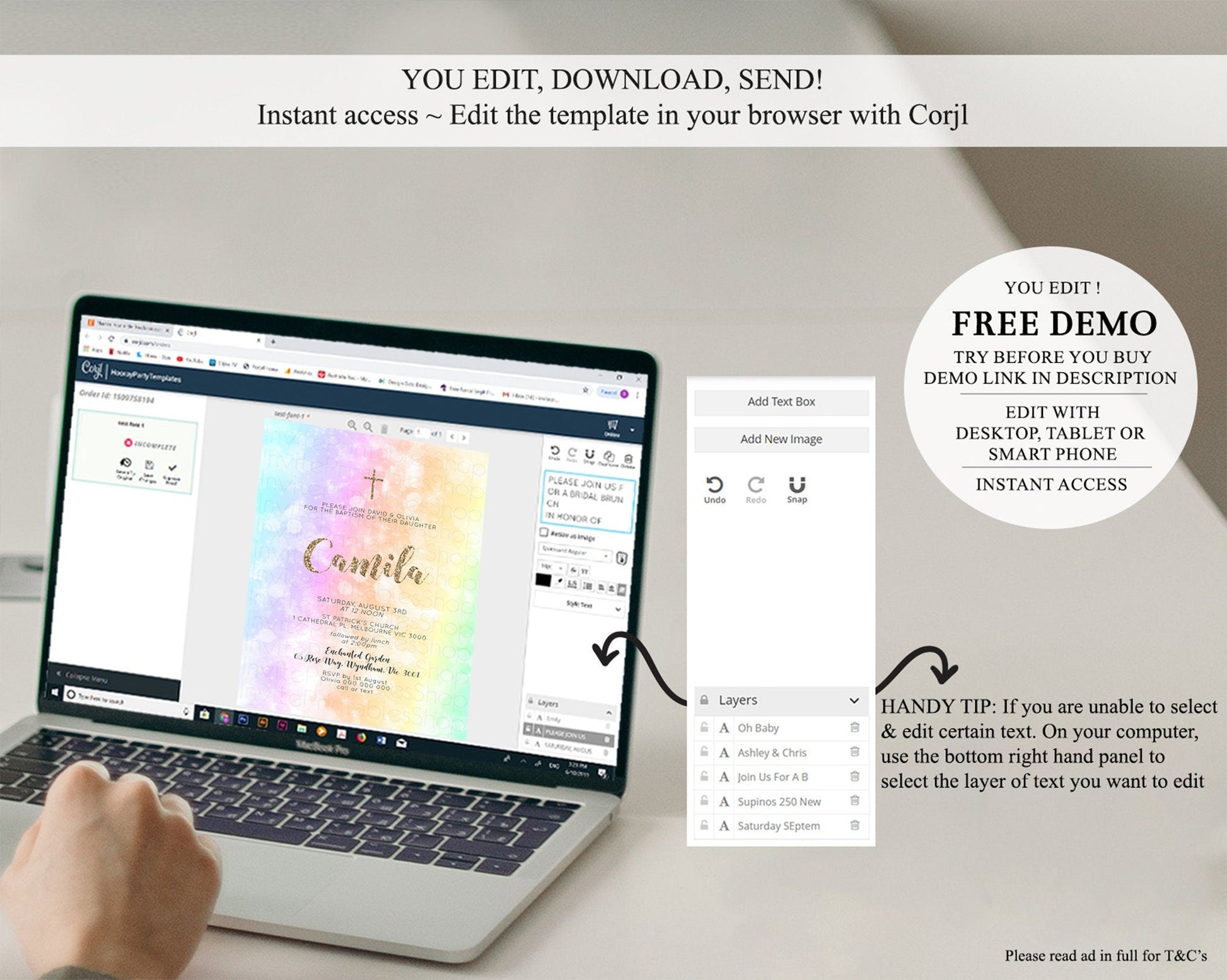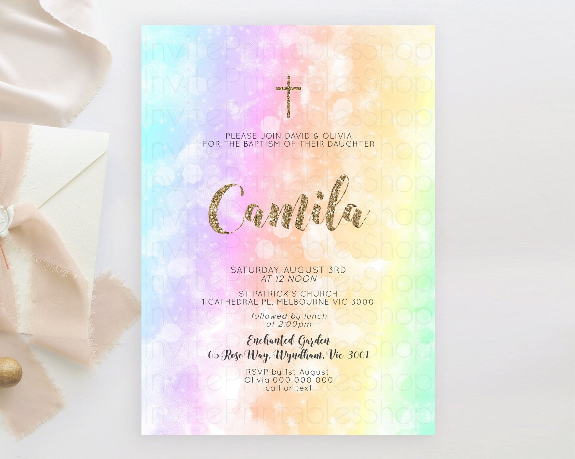 Pastel Baptism Invitation Pastel Colors Watercolor Baptism 1st Birthday Party Gold Ombre Pastel Rainbow Christening Holy Communion D10648