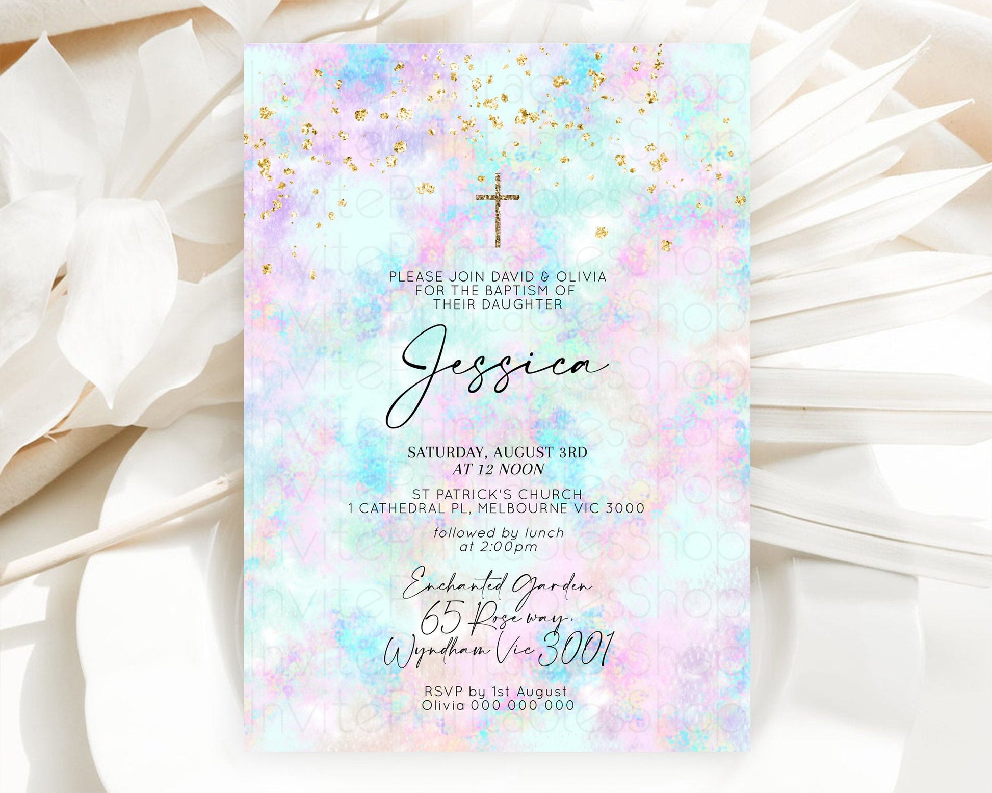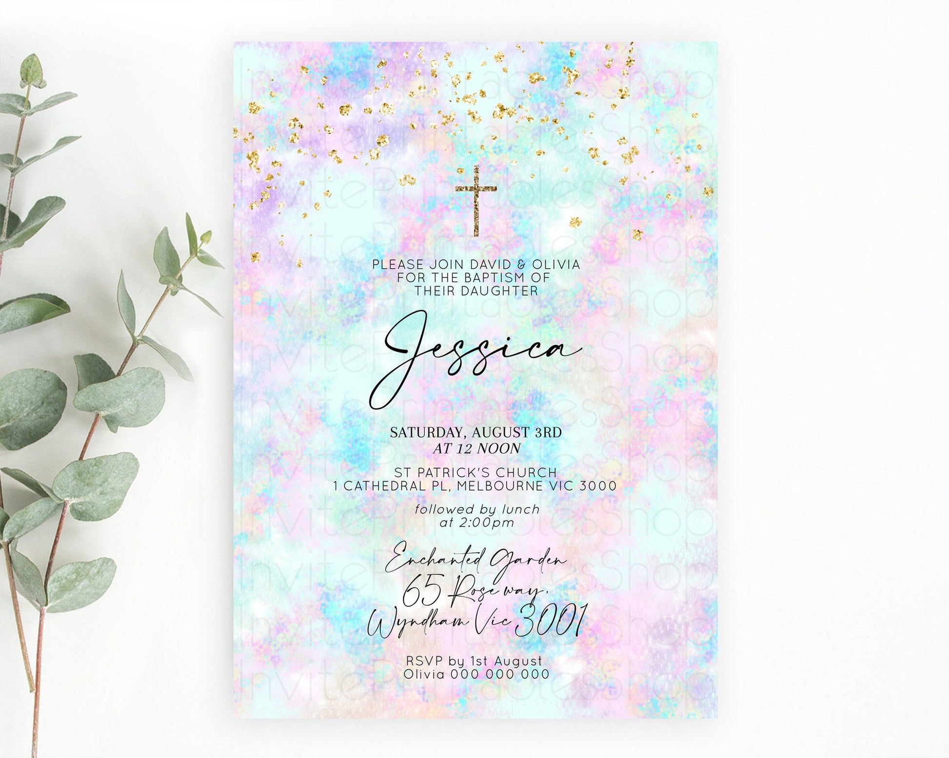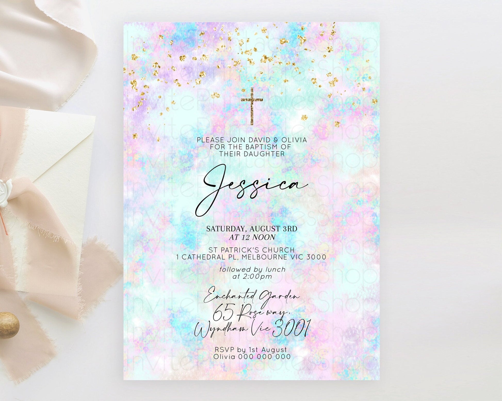Pastel Baptism Invitation Pastel Colors Watercolor Baptism 1st Birthday Party Gold Ombre Pastel Rainbow Christening Holy Communion D10652
