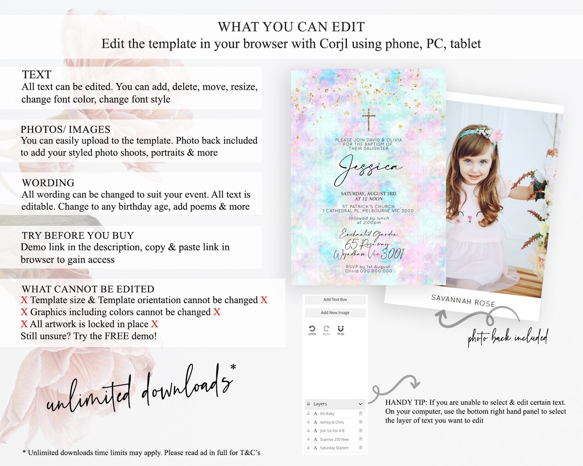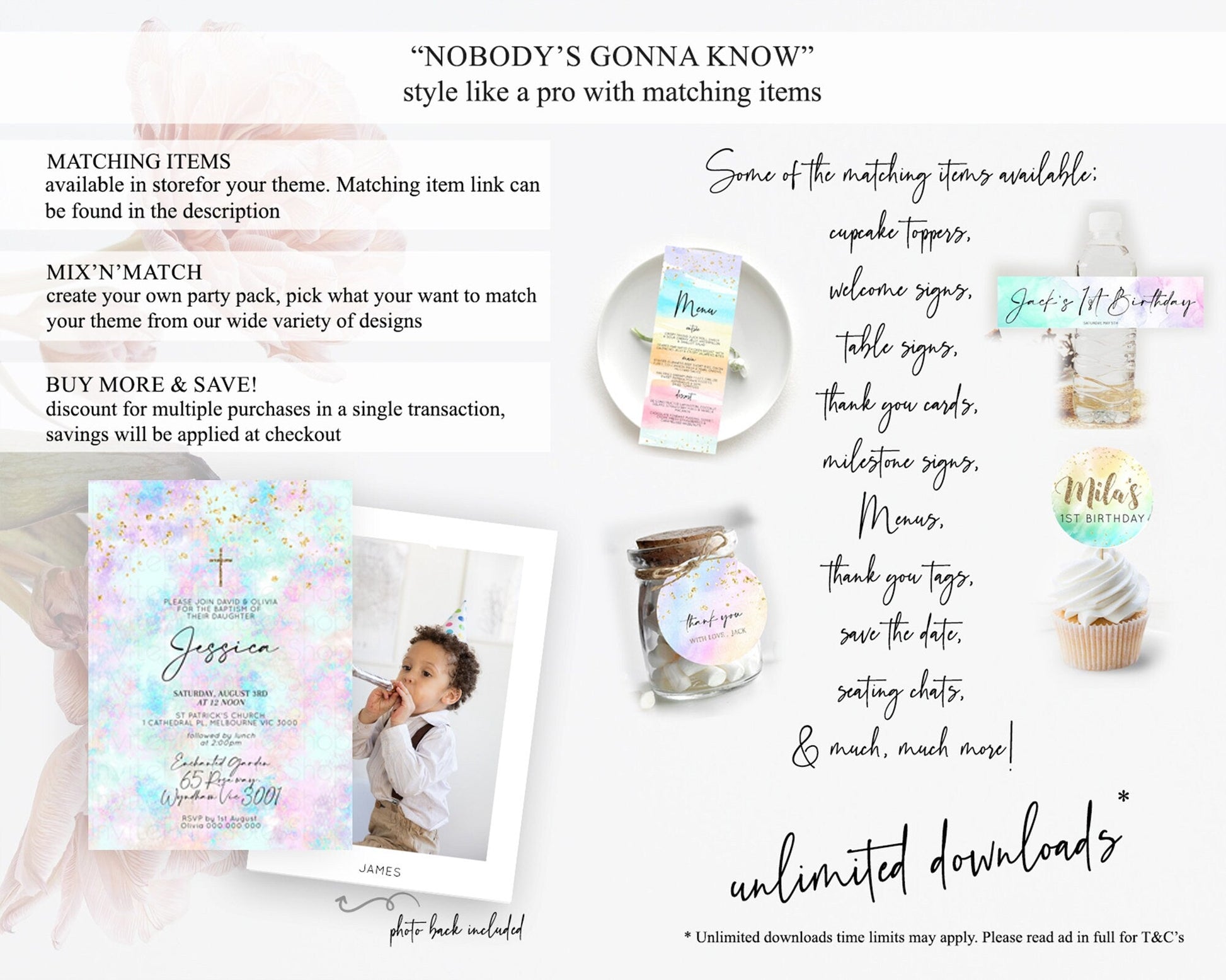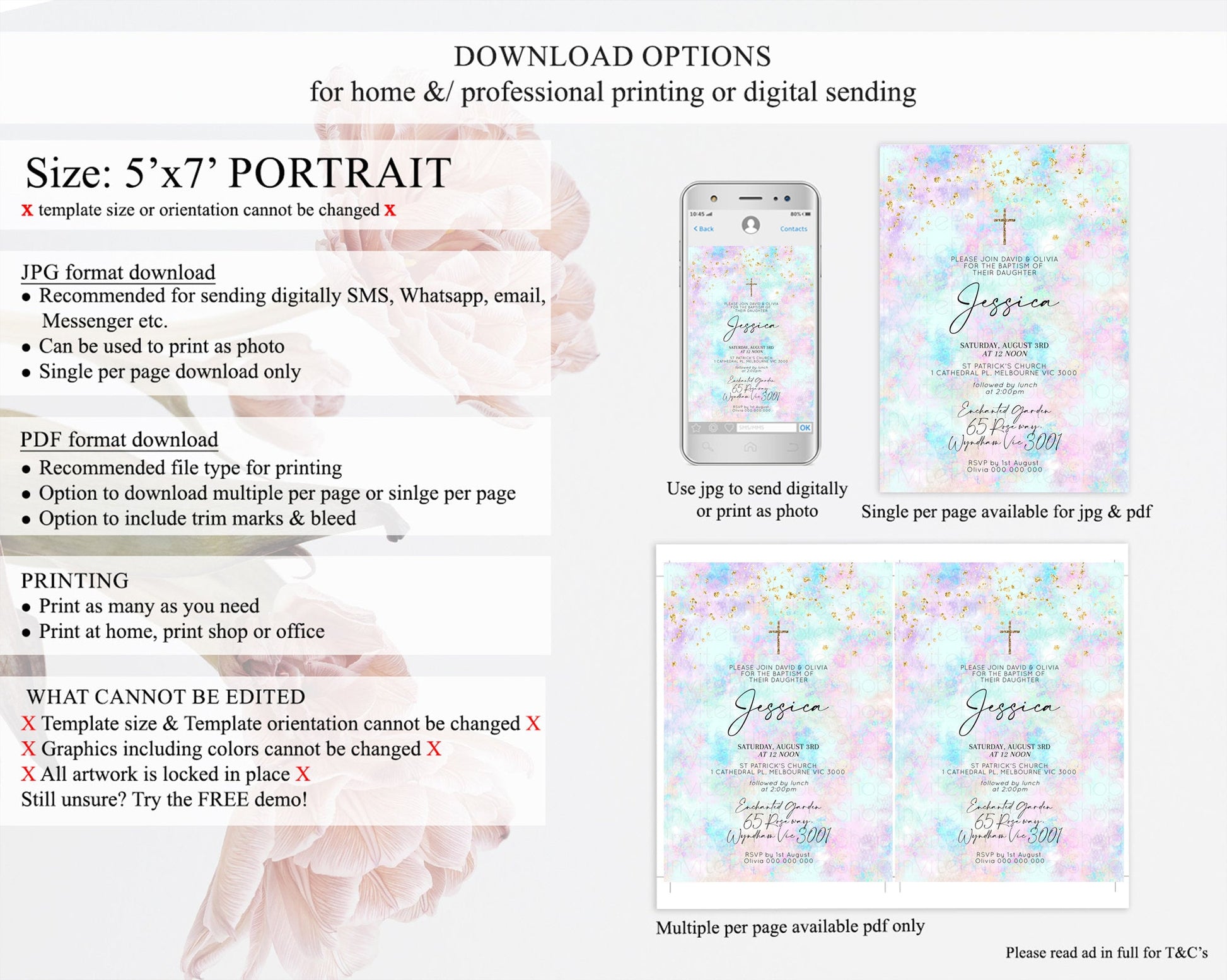 Pastel Baptism Invitation Pastel Colors Watercolor Baptism 1st Birthday Party Gold Ombre Pastel Rainbow Christening Holy Communion D10652