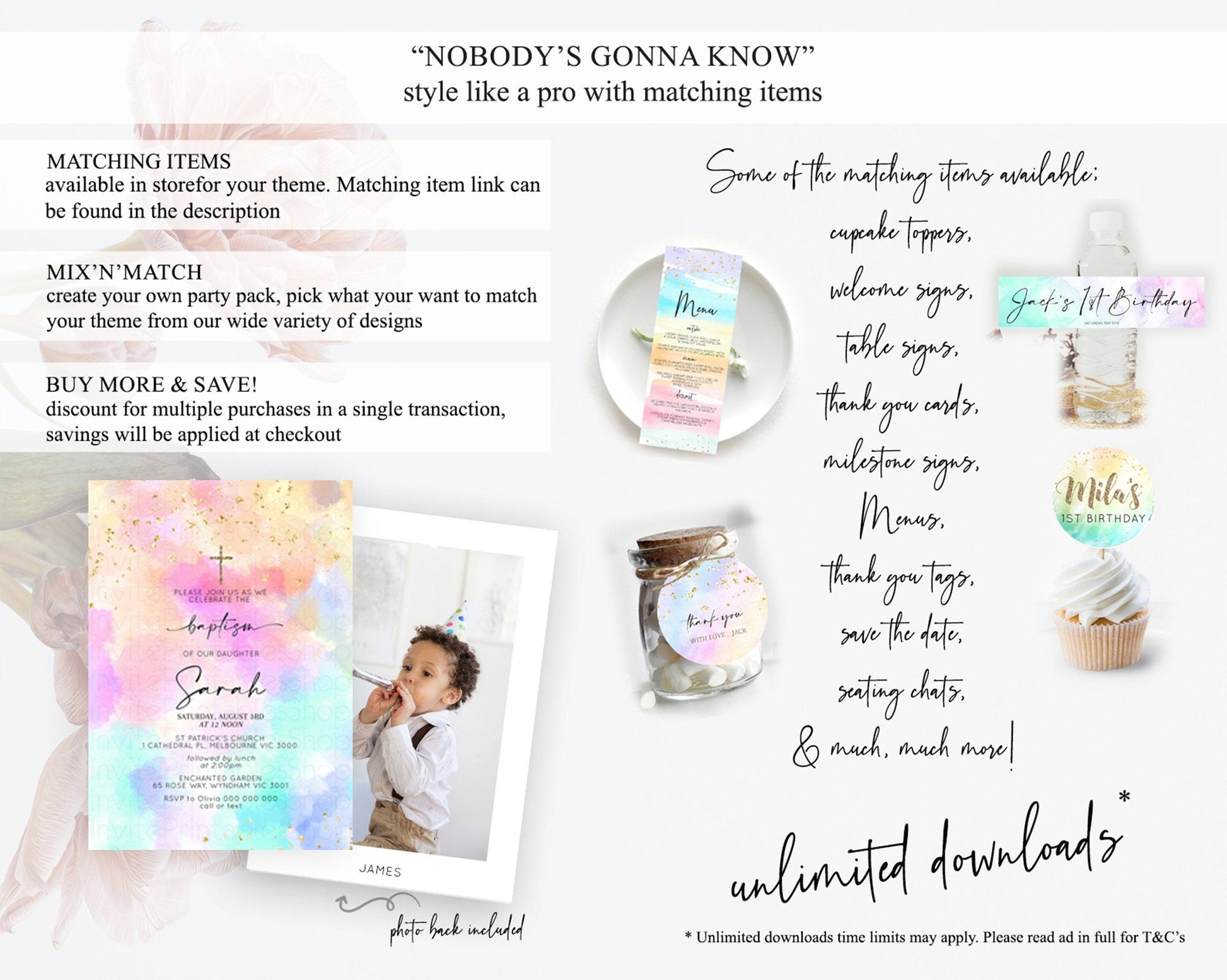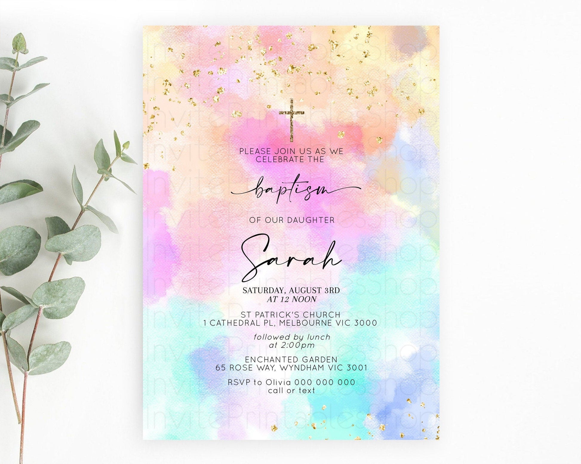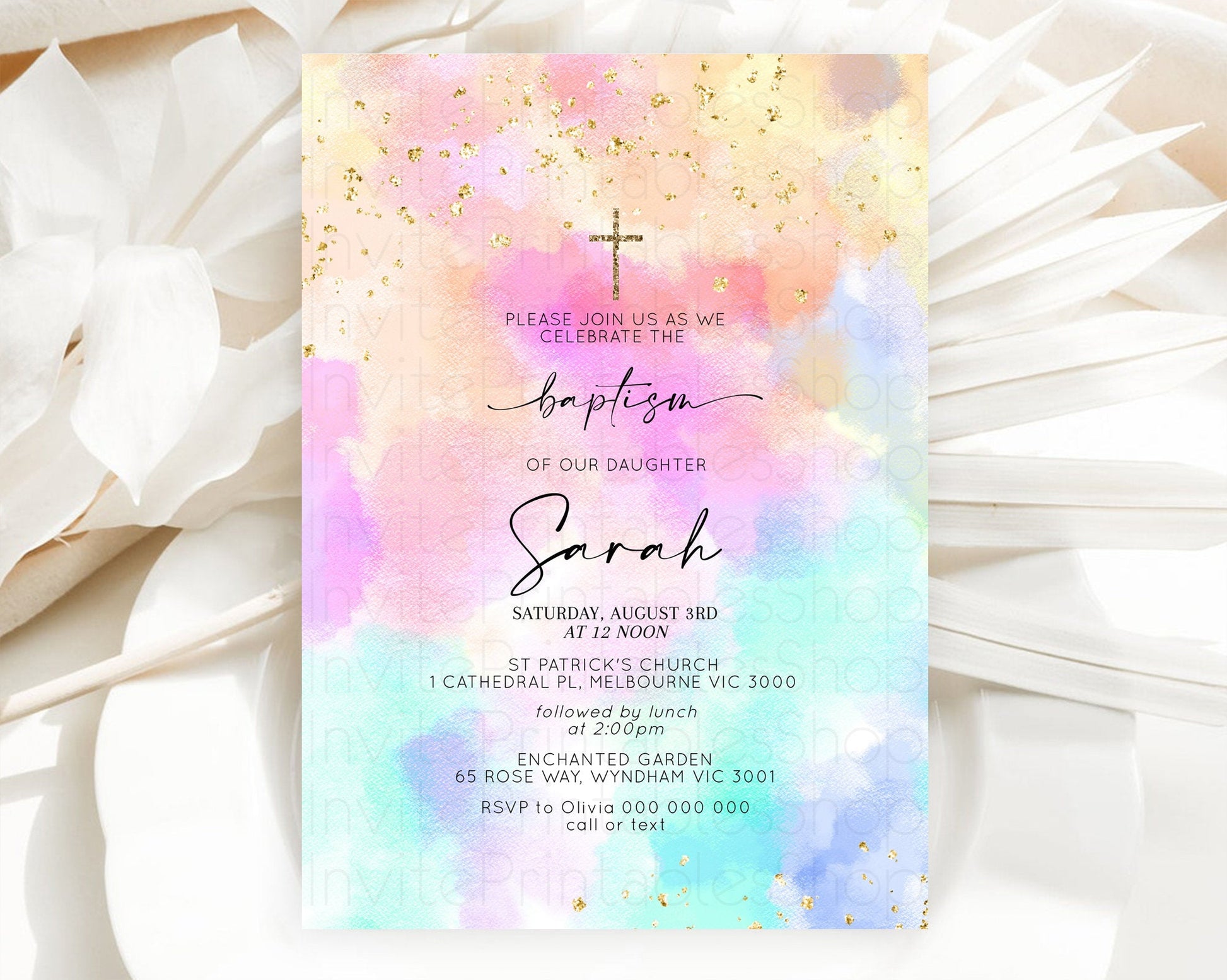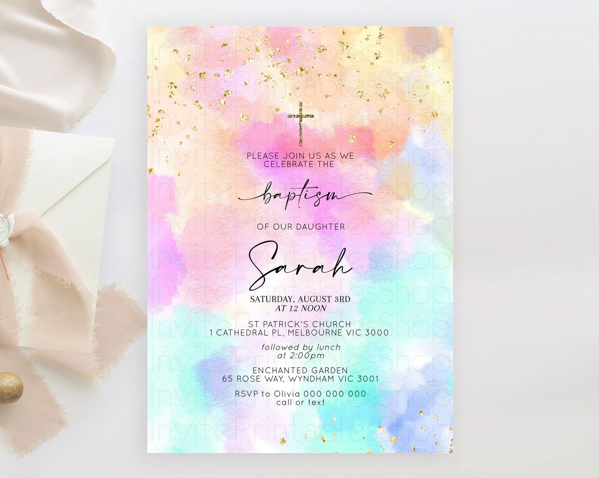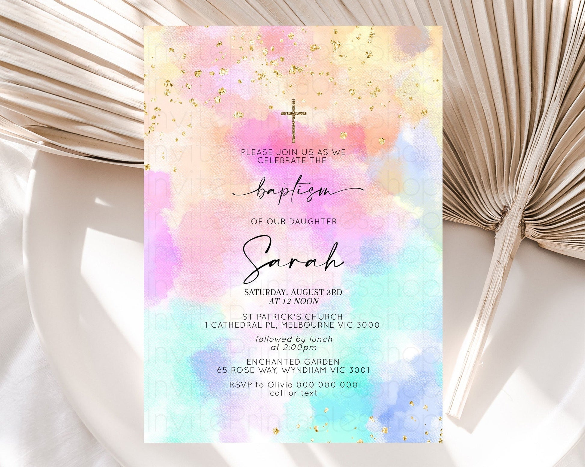 Pastel Baptism Invitation Pastel Colors Watercolor Baptism 1st Birthday Party Gold Ombre Pastel Rainbow Christening Holy Communion D10667