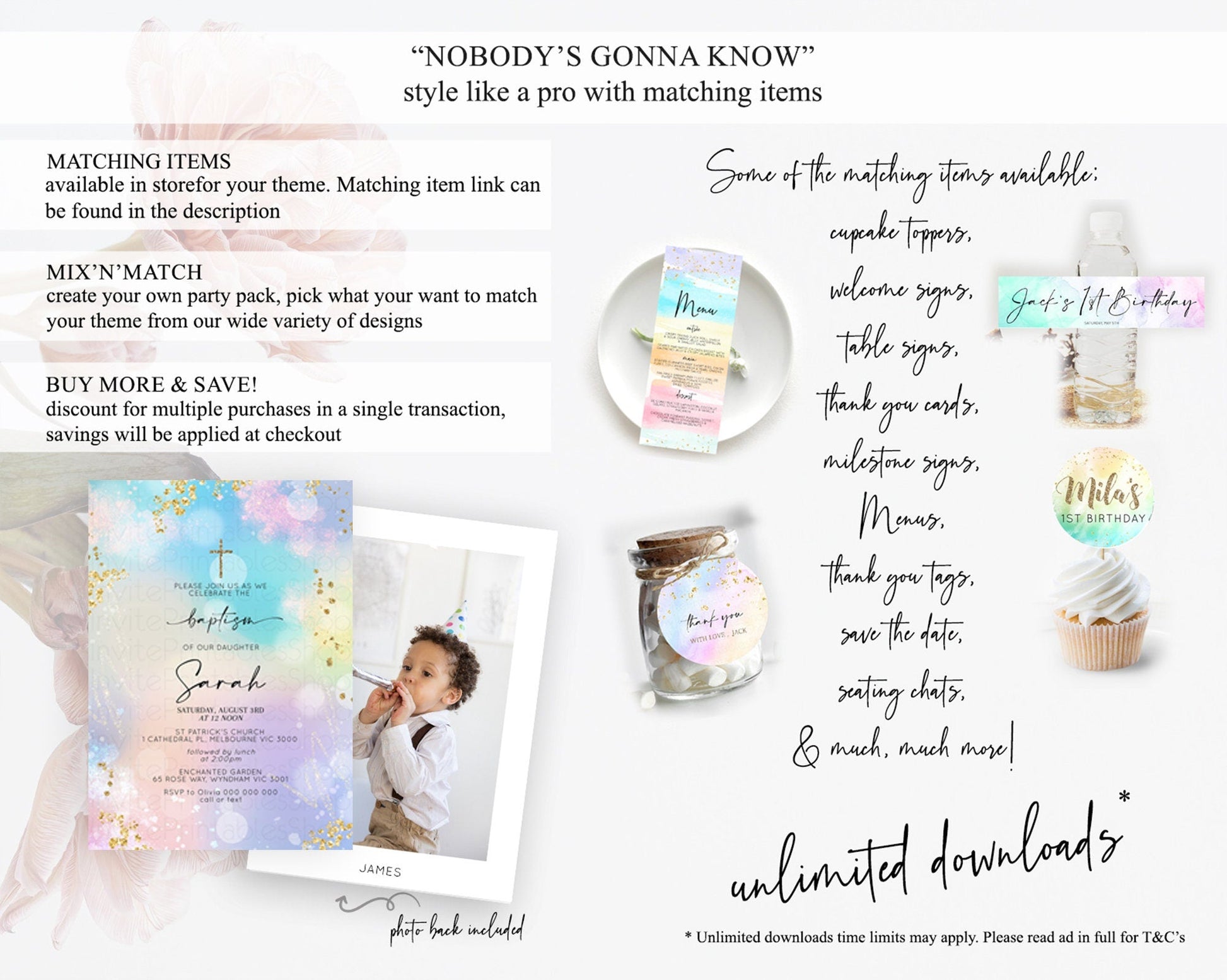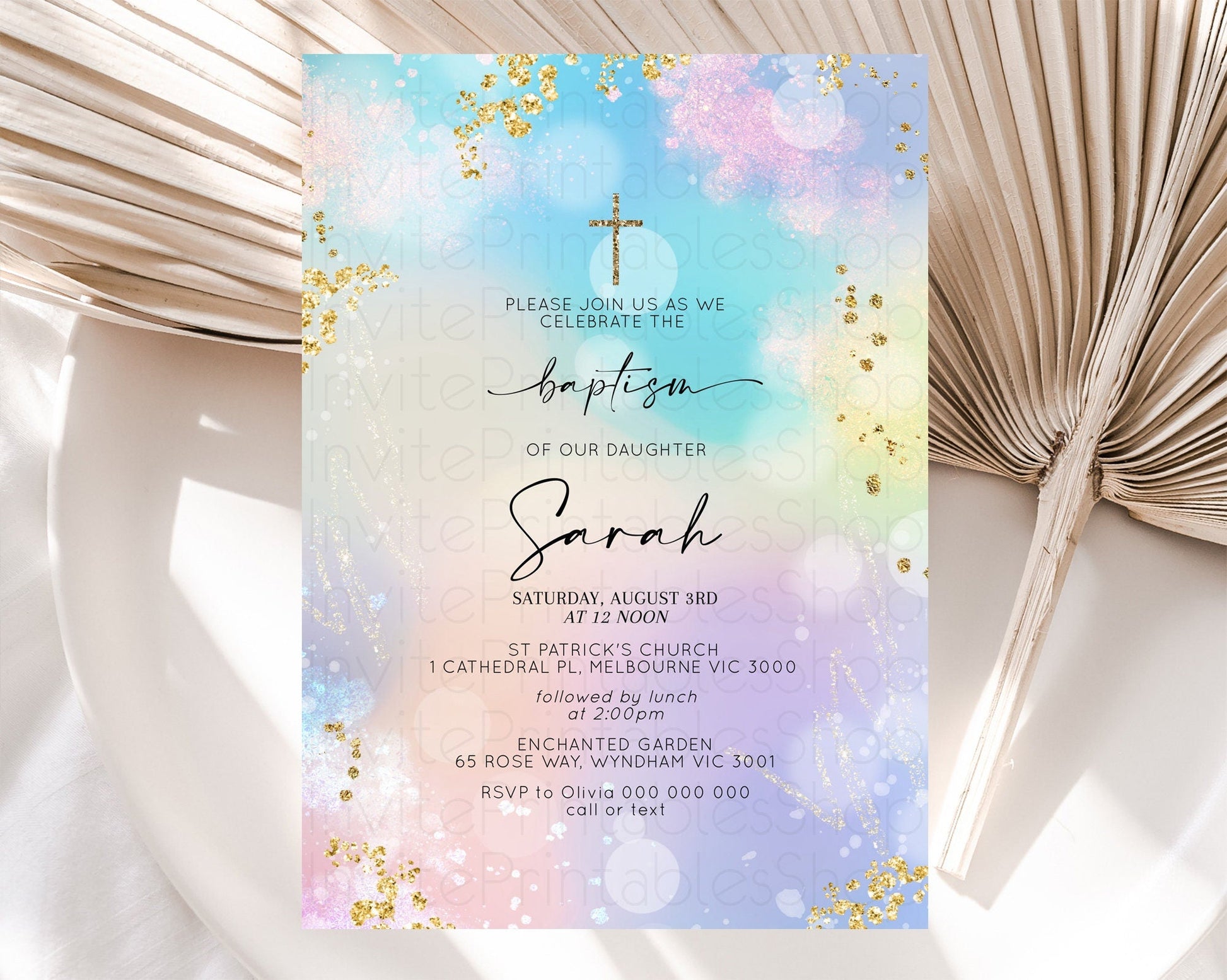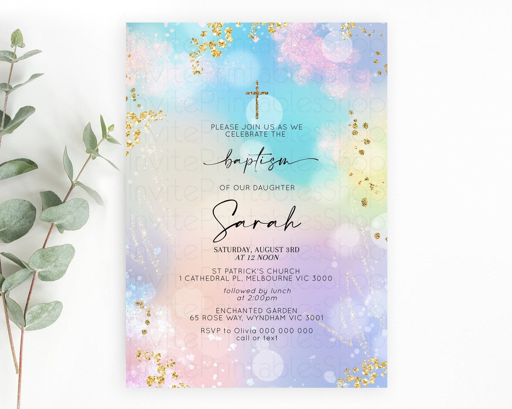 Pastel Baptism Invitation Pastel Colors Watercolor Baptism 1st Birthday Party Gold Ombre Pastel Rainbow Christening Holy Communion D10675