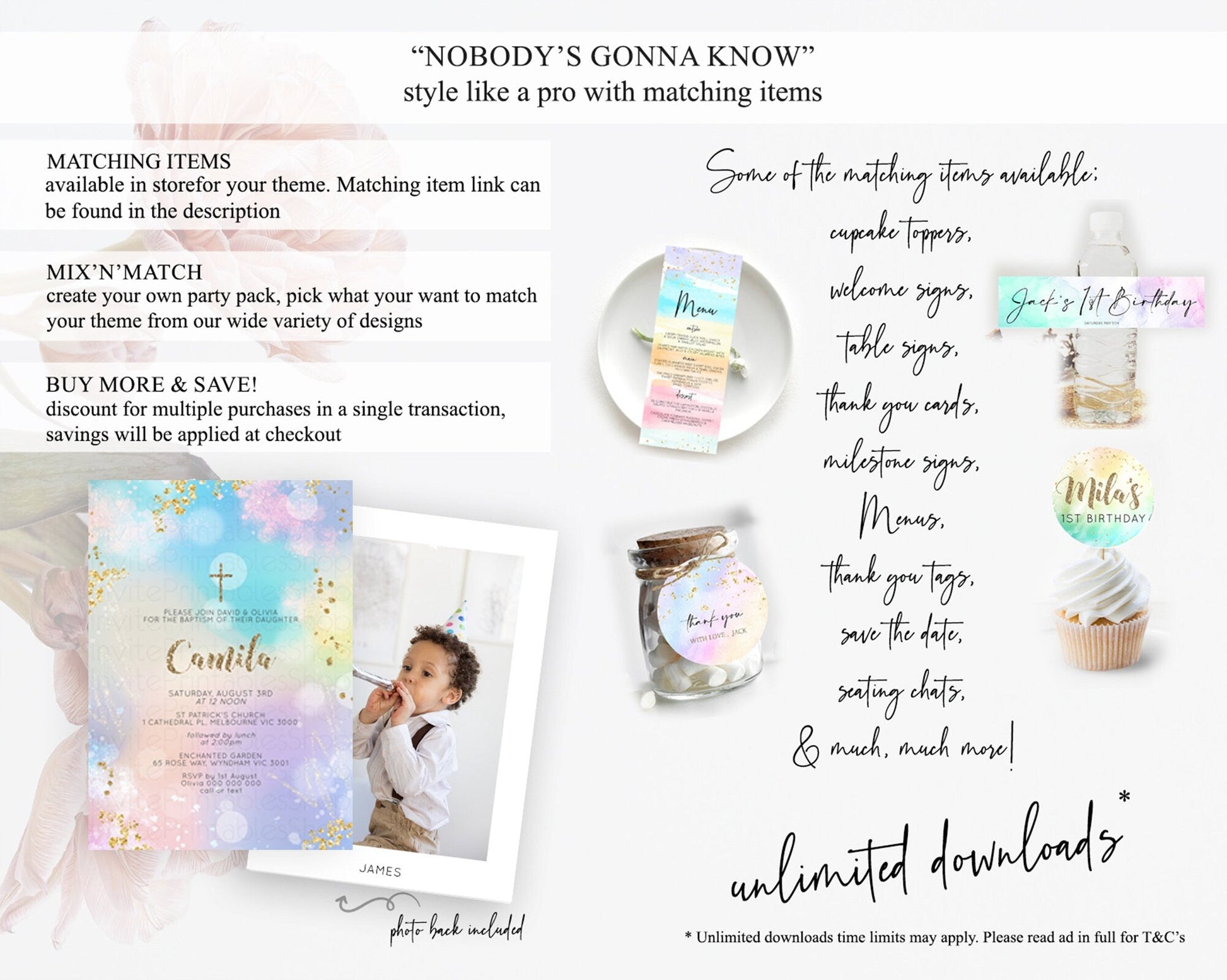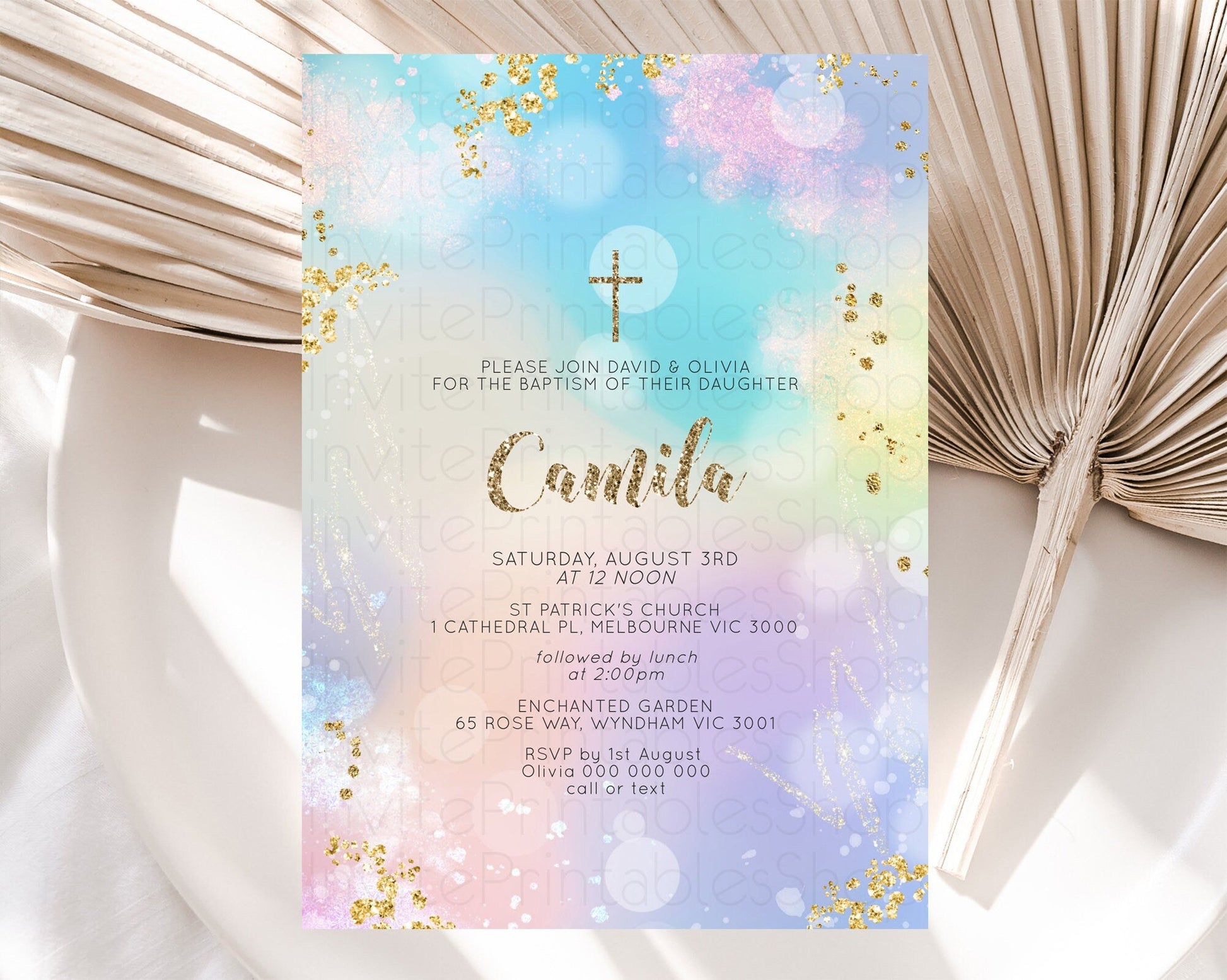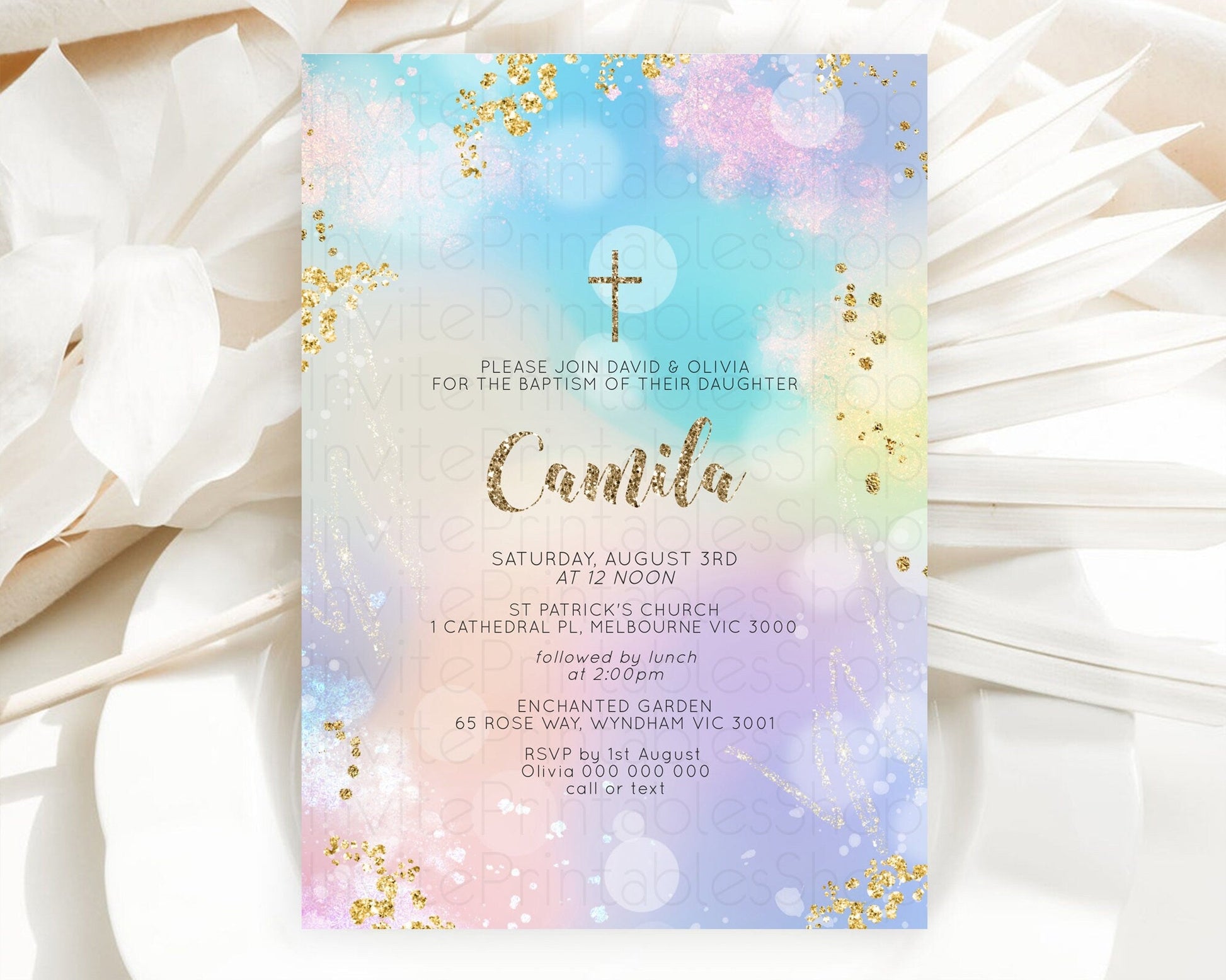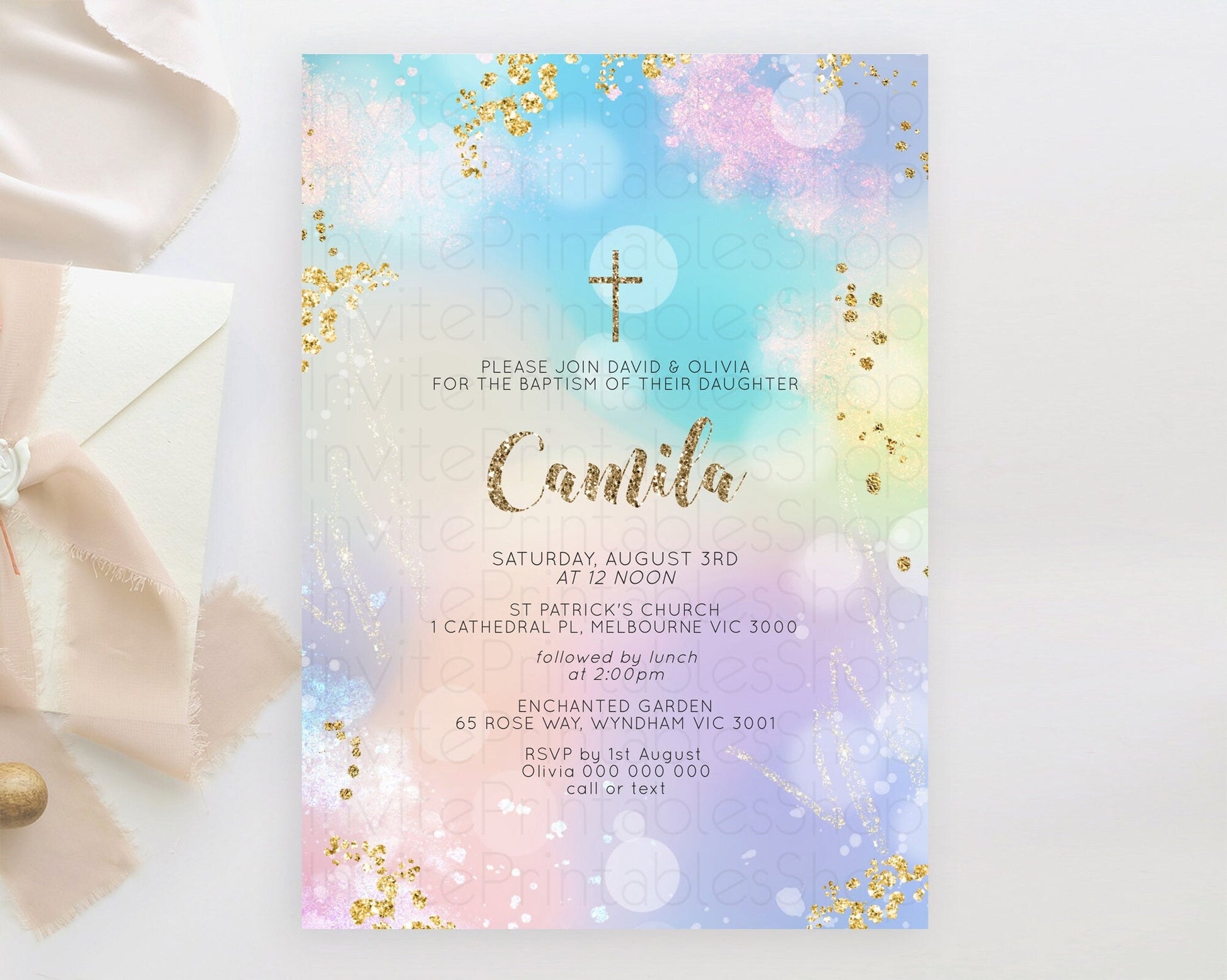 Pastel Baptism Invitation Pastel Colors Watercolor Baptism 1st Birthday Party Gold Ombre Pastel Rainbow Christening Holy Communion D10677