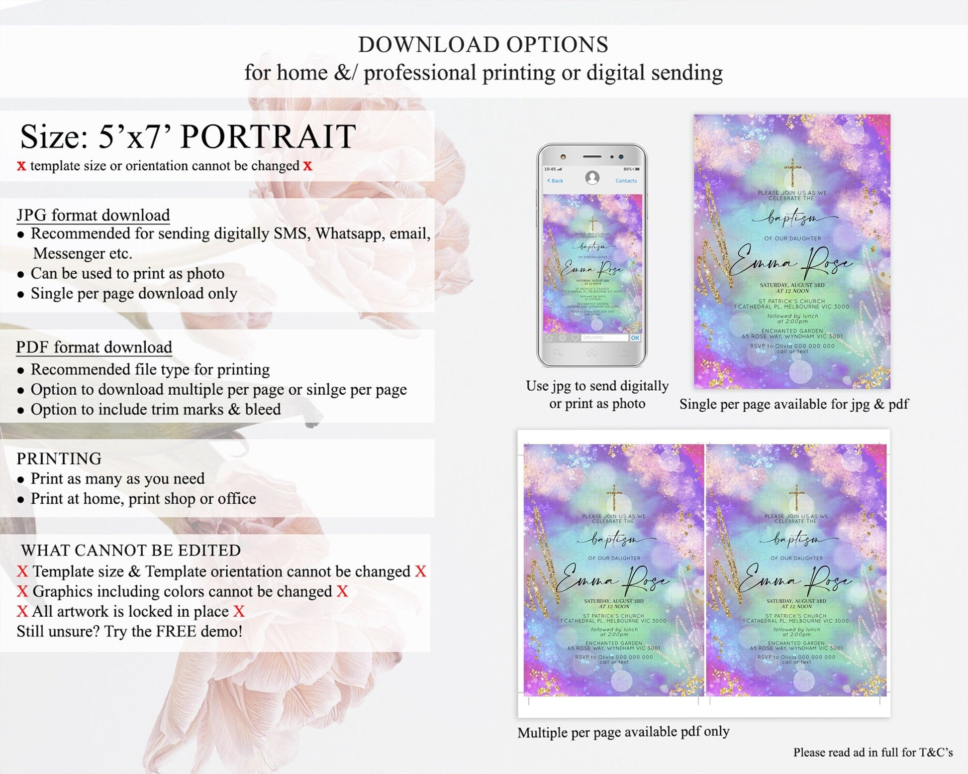 Pastel Baptism Invitation Pastel Colors Watercolor Baptism 1st Birthday Party Gold Ombre Pastel Rainbow Christening Holy Communion D10680
