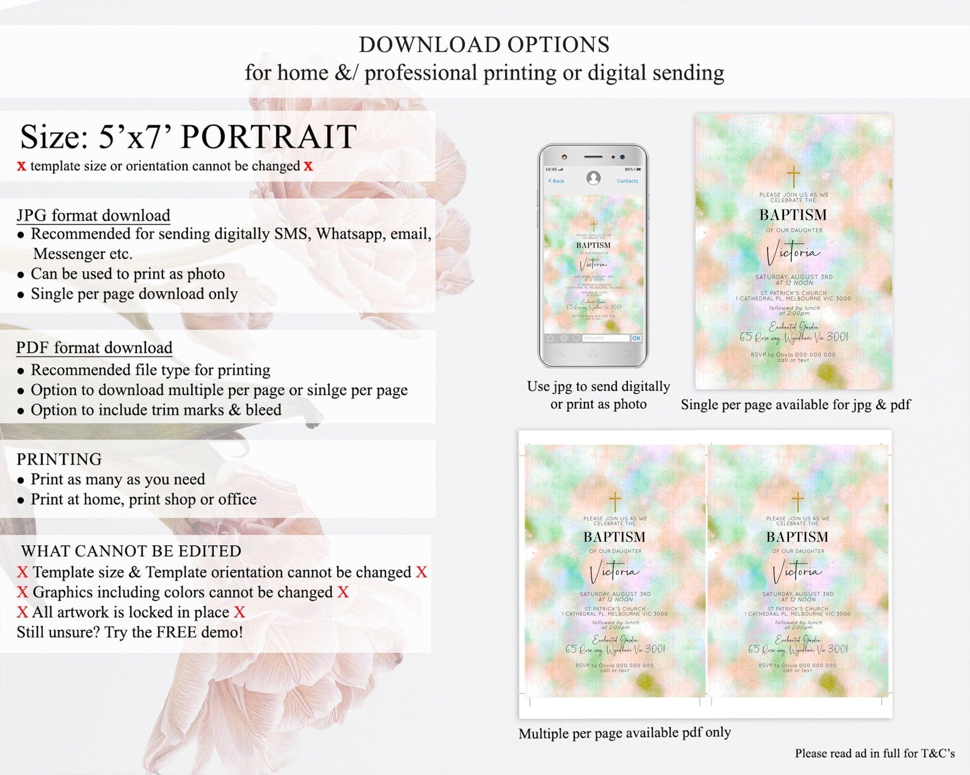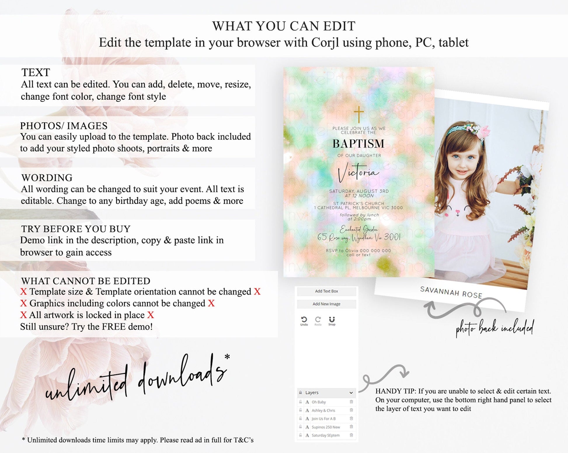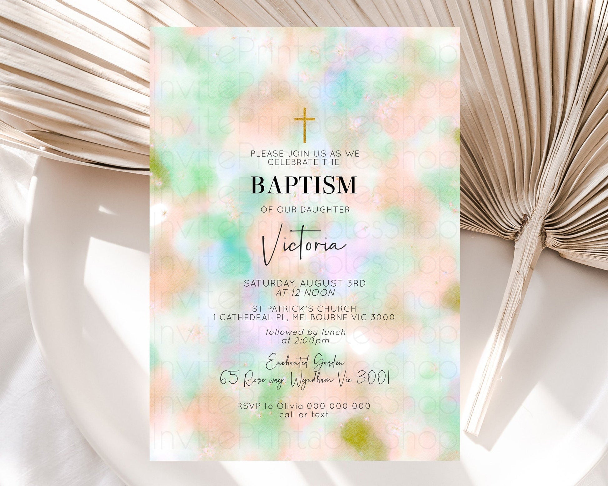 Pastel Baptism Invitation Pastel Colors Watercolor Baptism 1st Birthday Party Gold Ombre Pastel Rainbow Christening Holy Communion D10693