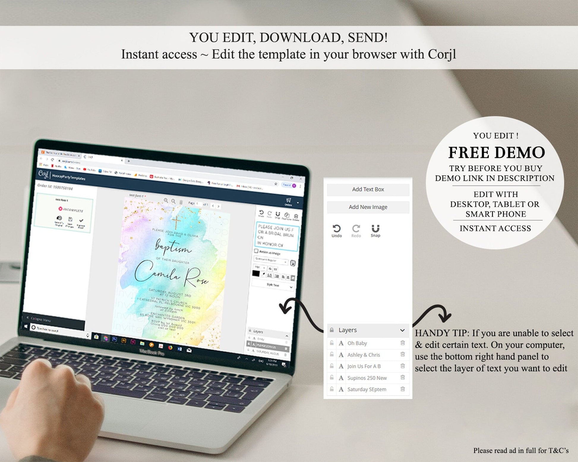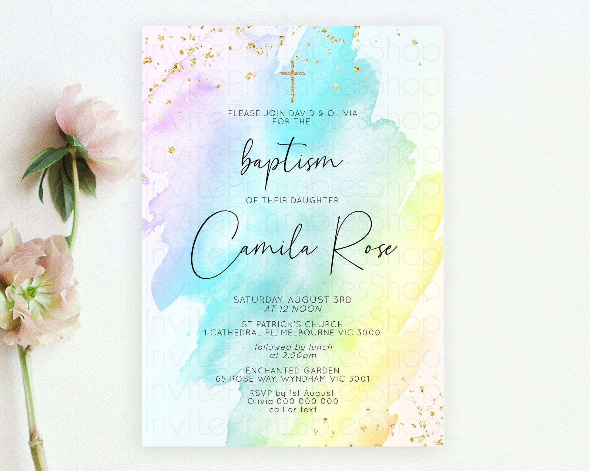 Pastel Baptism Invitation Pastel Colors Watercolor Baptism 1st Birthday Party Gold Ombre Pastel Rainbow Christening Holy Communion D10773