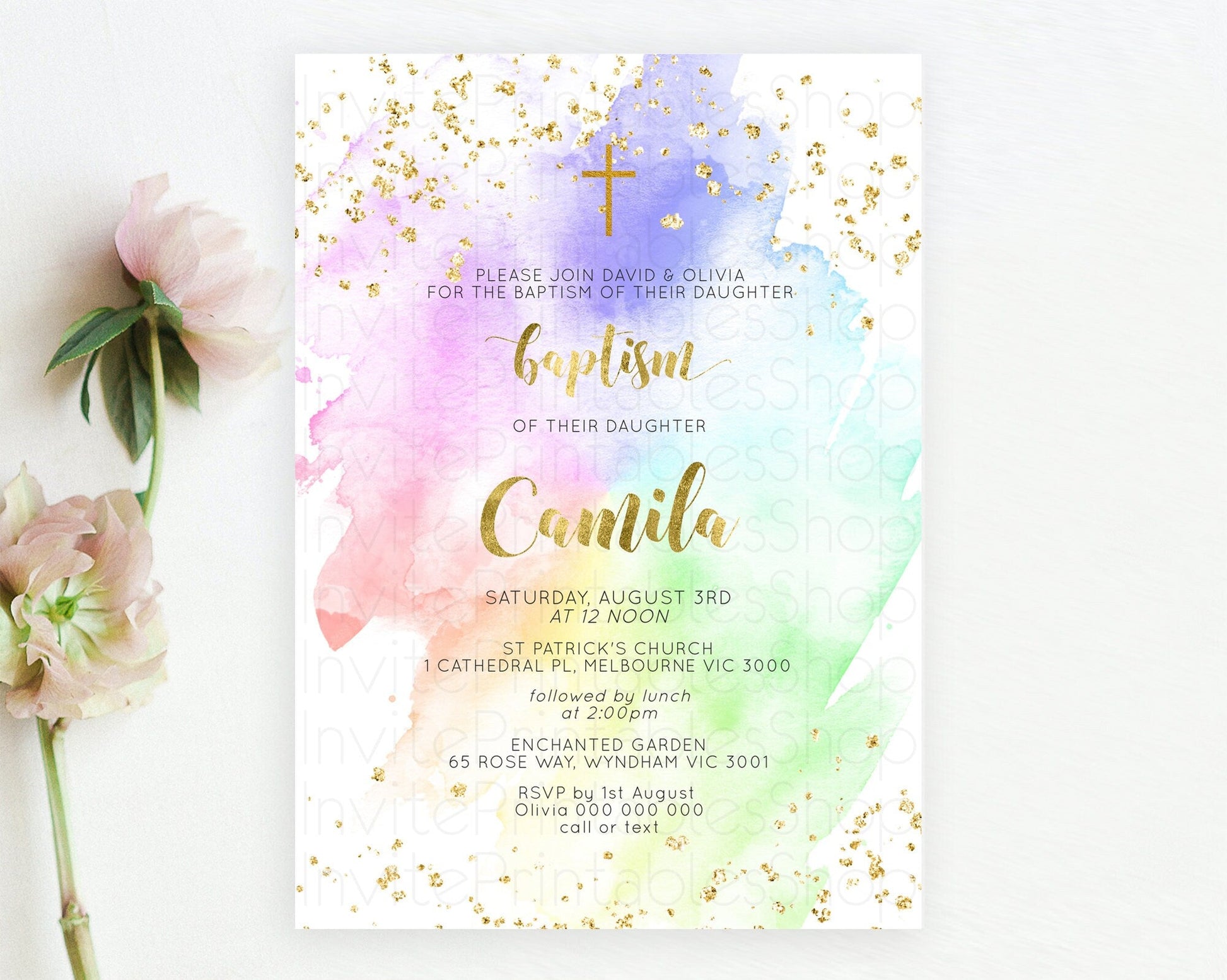 Pastel Baptism Invitation Pastel Colors Watercolor Baptism 1st Birthday Party Gold Ombre Pastel Rainbow Christening Holy Communion D10876