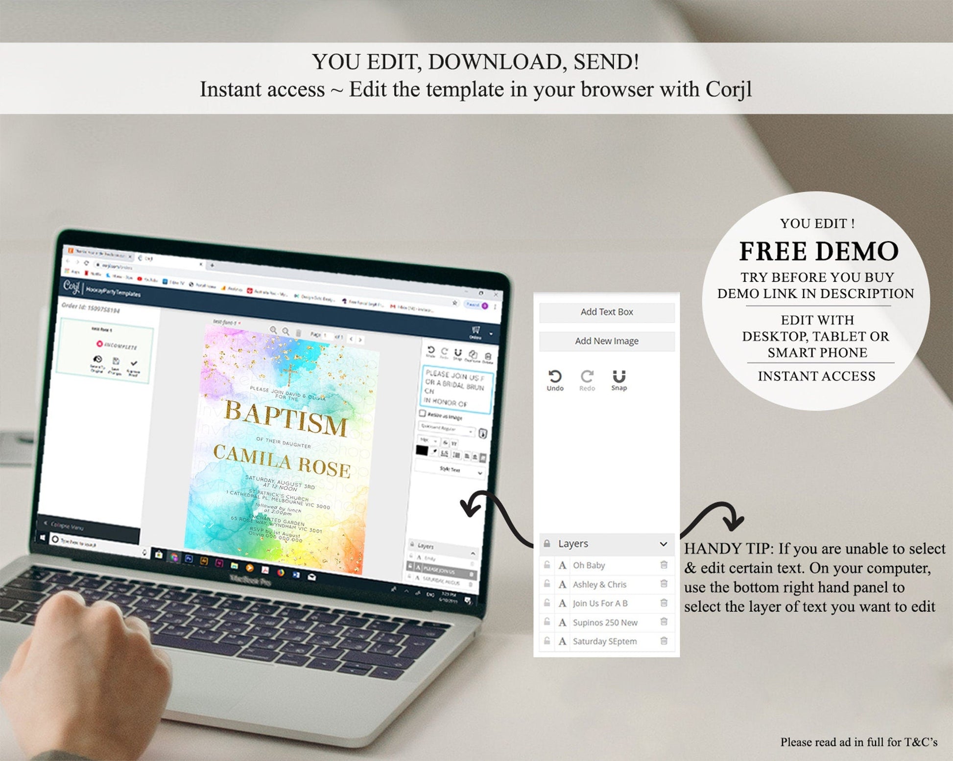 Pastel Baptism Invitation Pastel Colors Watercolor Baptism 1st Birthday Party Gold Ombre Pastel Rainbow Christening Holy Communion D10961