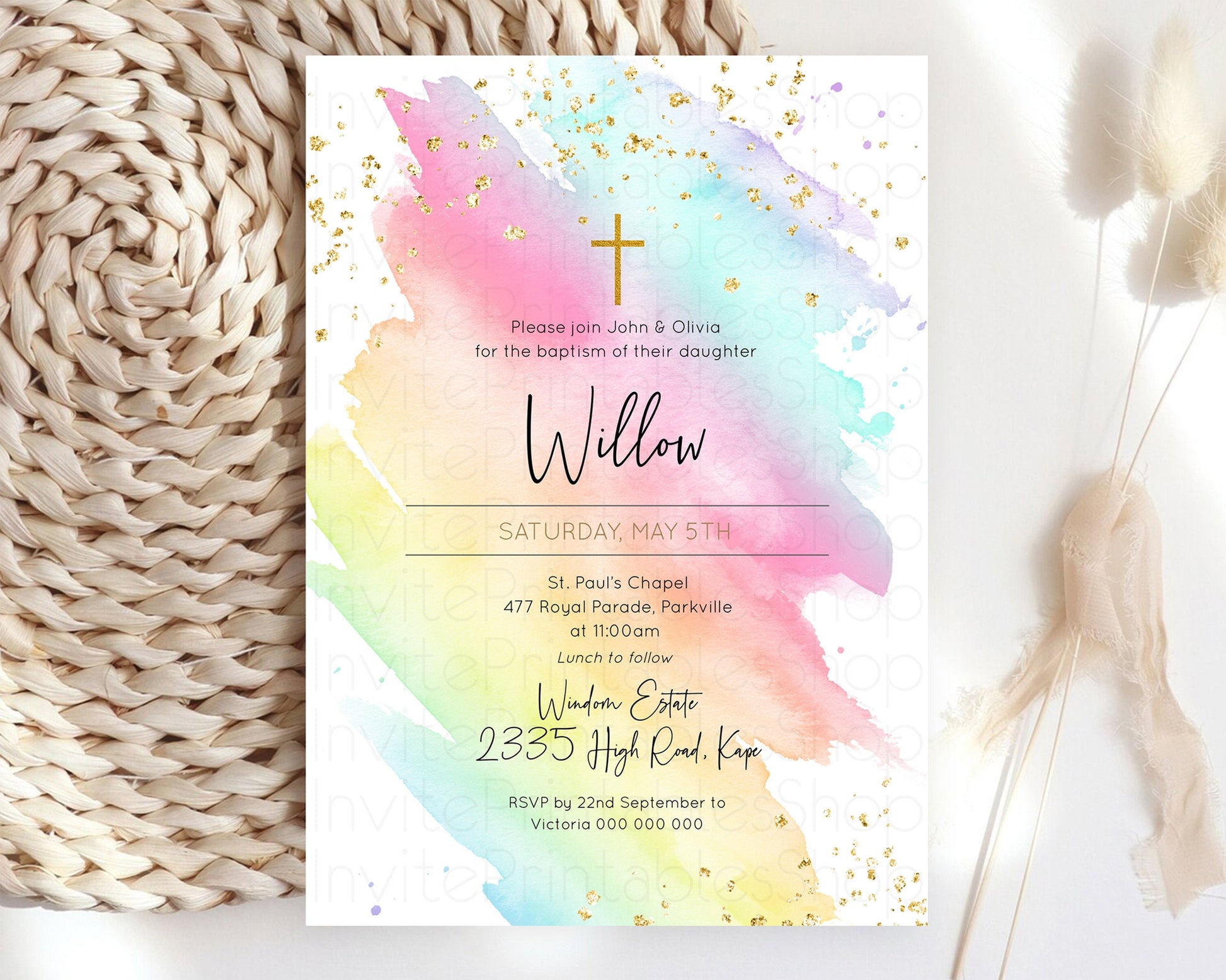 Pastel Baptism Invitation Rainbow Christening Invitation Holy Communion Invite Baptism 1st Birthday Sprinkles Ombre Watercolor Splash