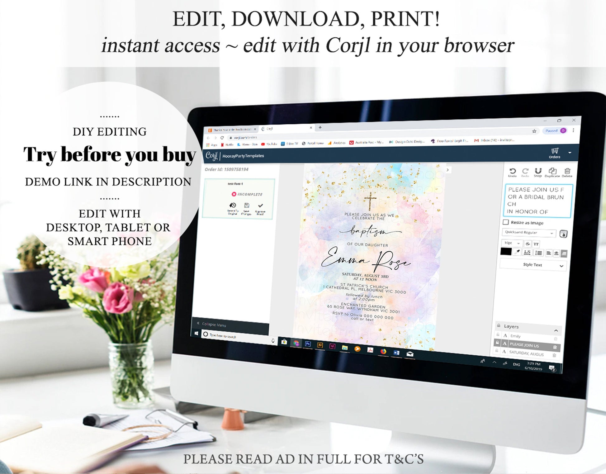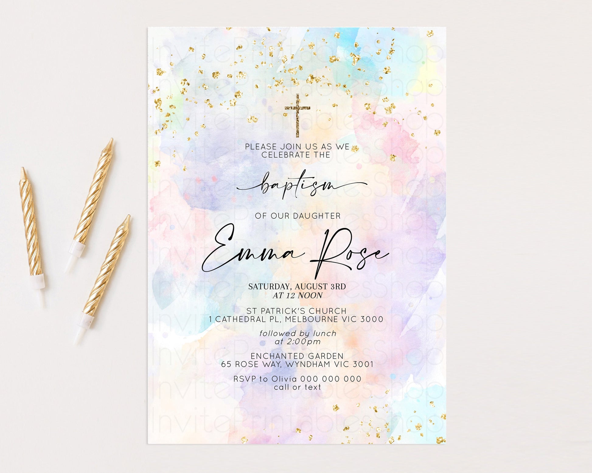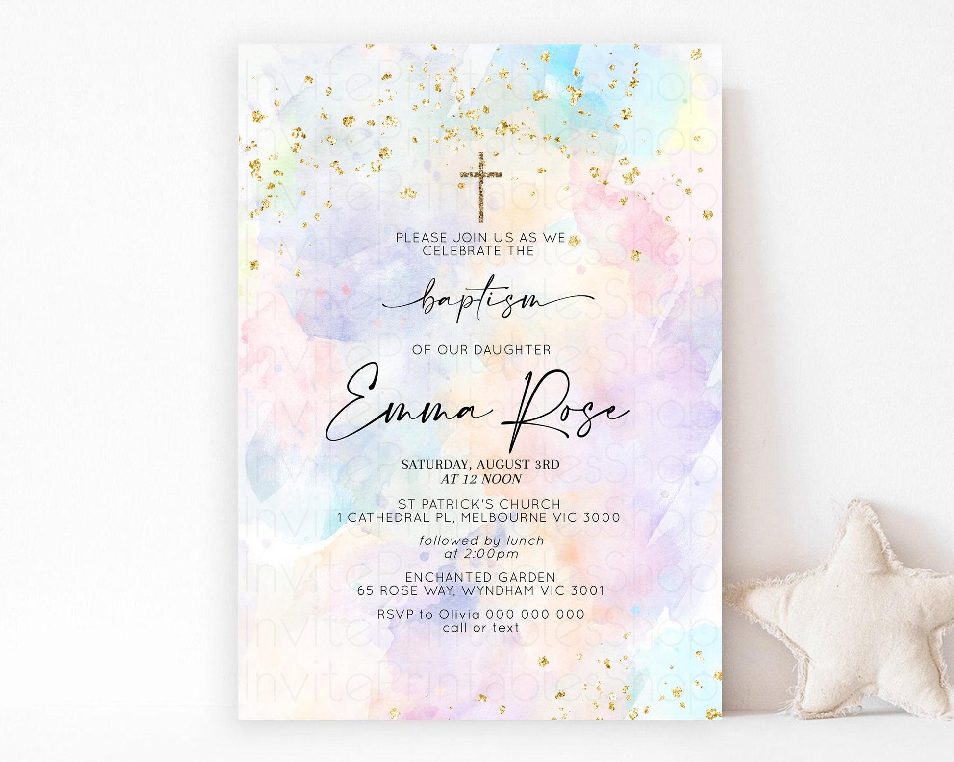 Pastel Baptism Invitation Rainbow Christening Invitation Holy Communion Invite Baptism 1st Birthday Sprinkles Ombre Watercolor Splash