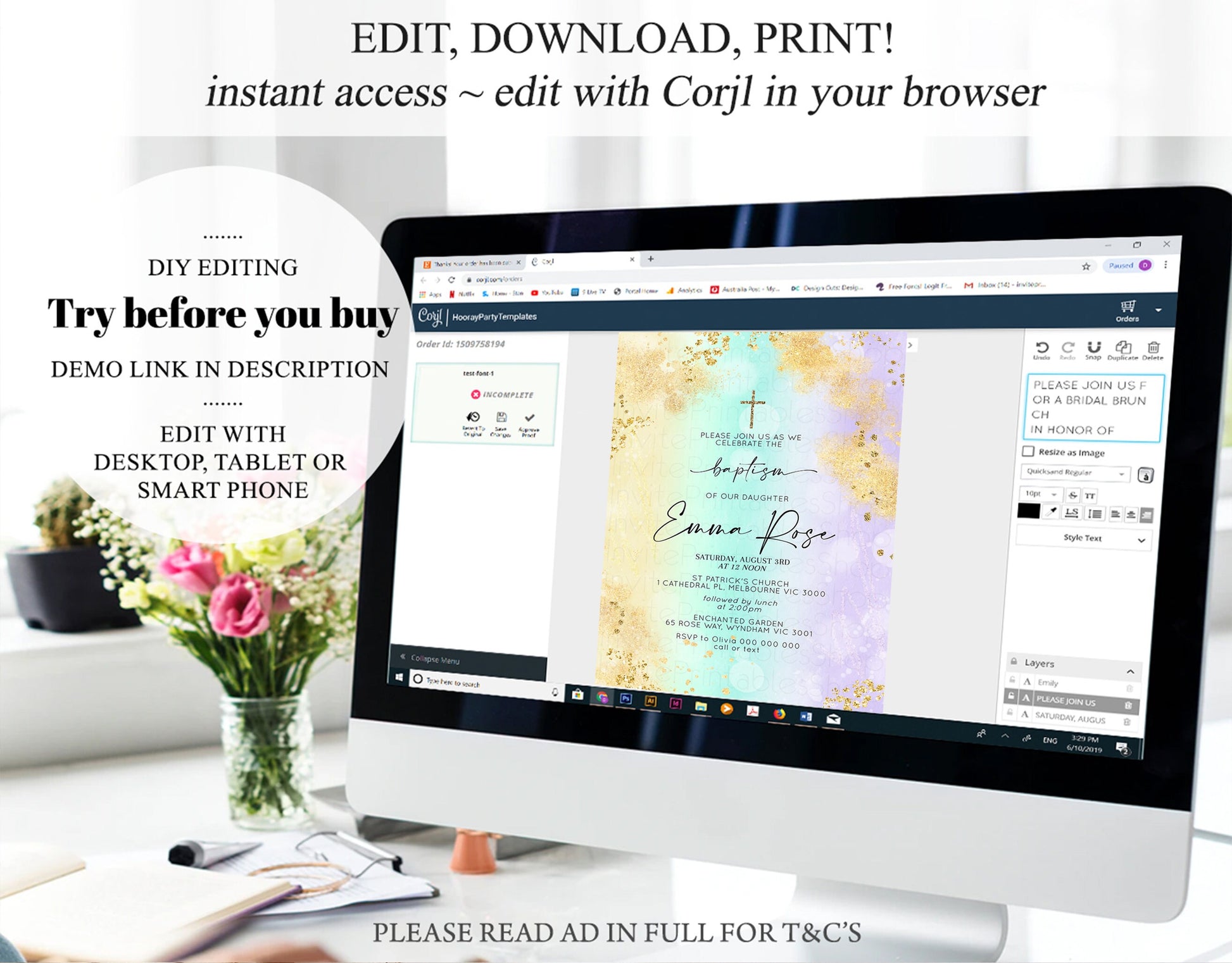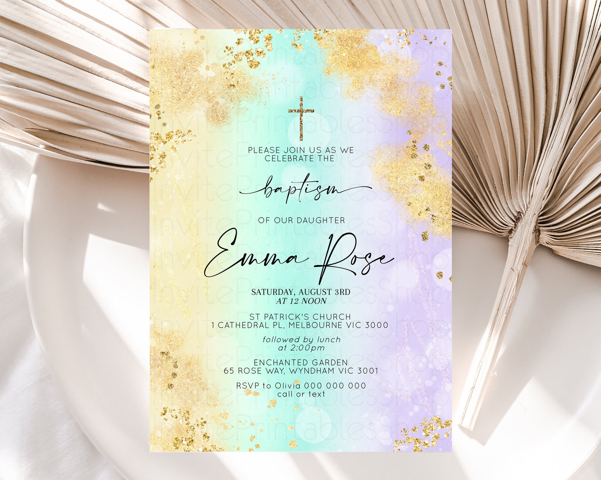 Pastel Baptism Invitation Rainbow Christening Invitation Holy Communion Invite Baptism 1st Birthday Sprinkles Ombre Watercolor Splash 706