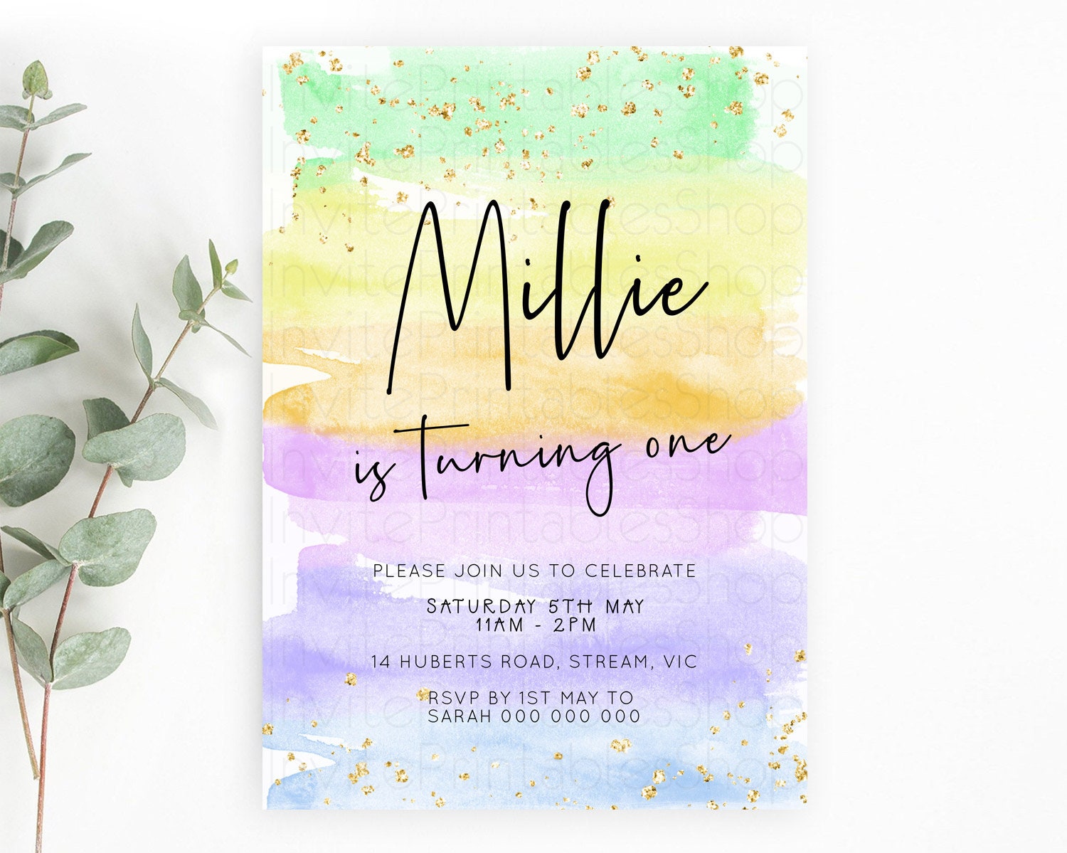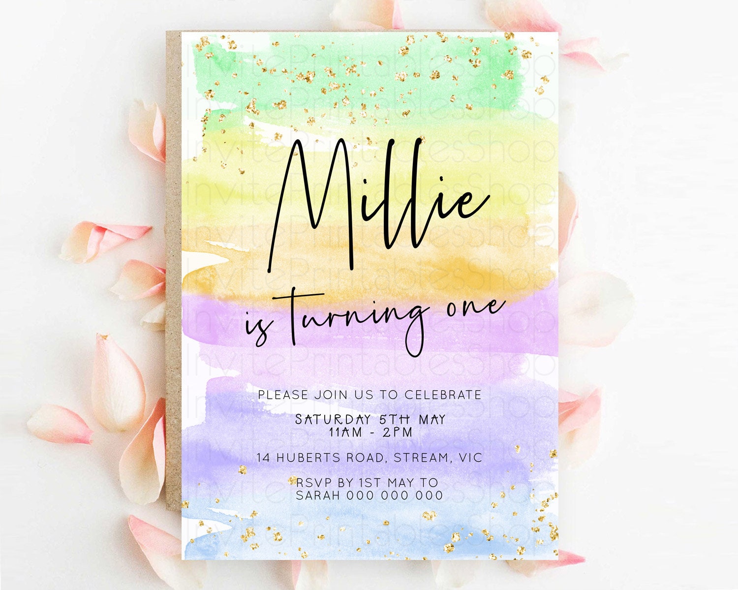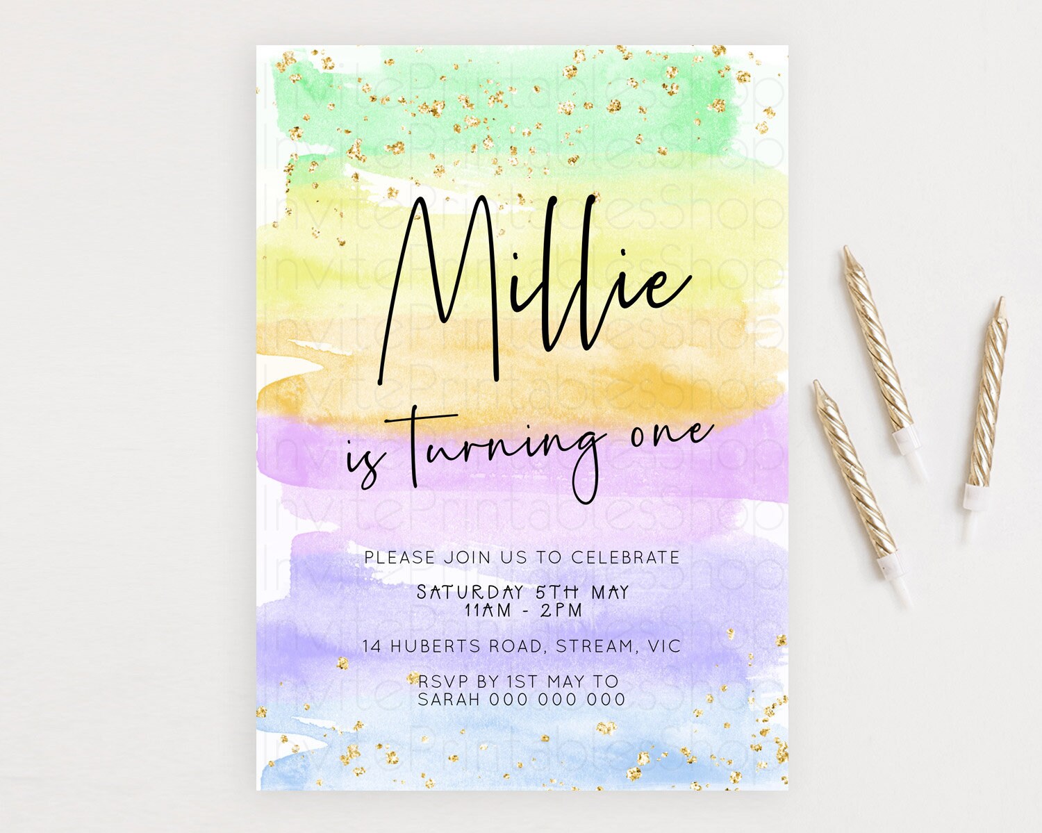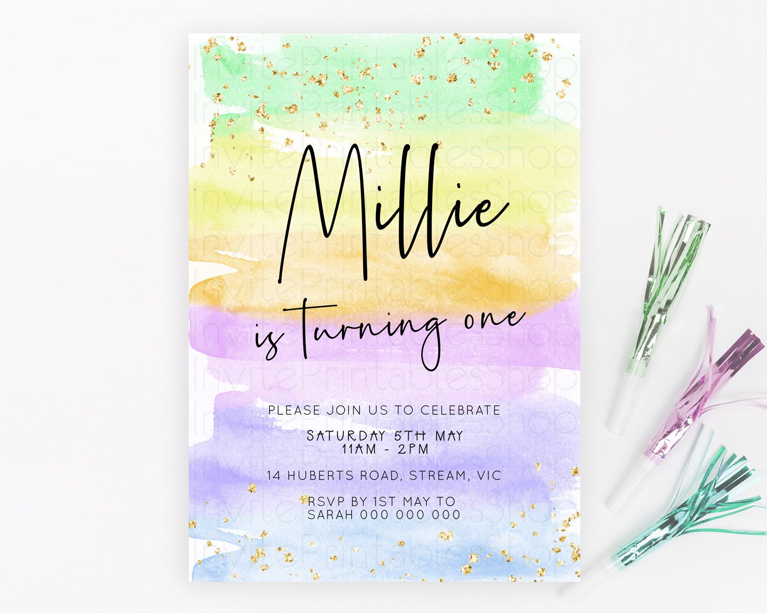 Pastel Birthday Invitation Ombre Watercolor Birthday Invitation Glitter Rainbow Color Splash 1st 2nd 3rd Birthday Invitation D23044