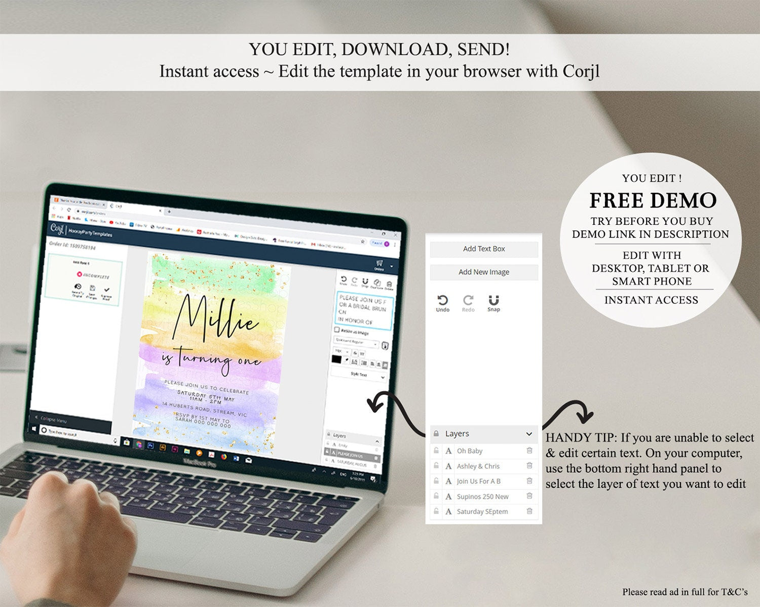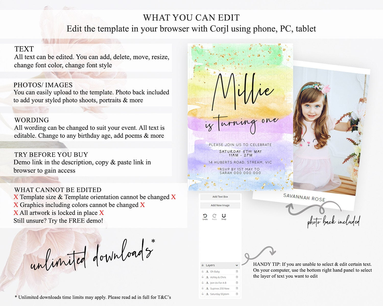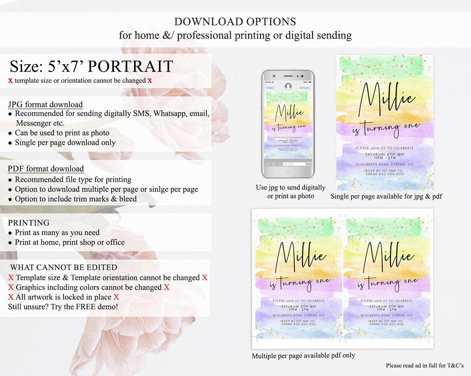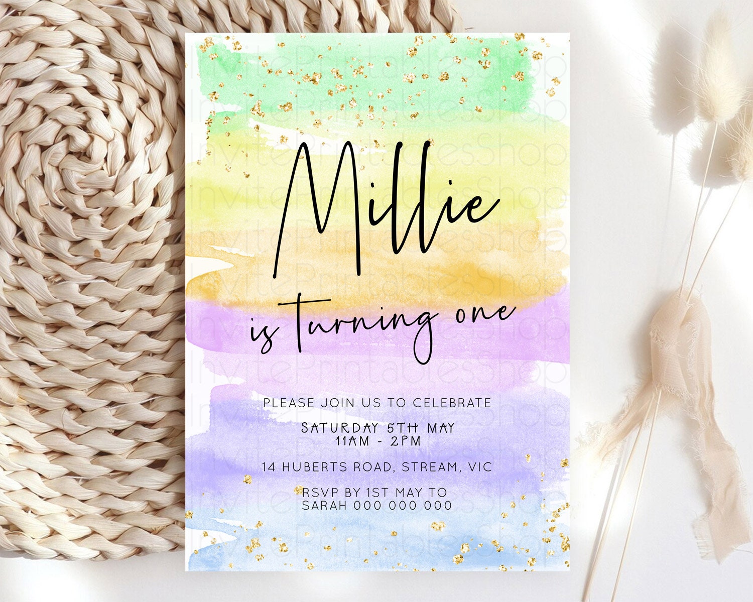 Pastel Birthday Invitation Ombre Watercolor Birthday Invitation Glitter Rainbow Color Splash 1st 2nd 3rd Birthday Invitation D23044