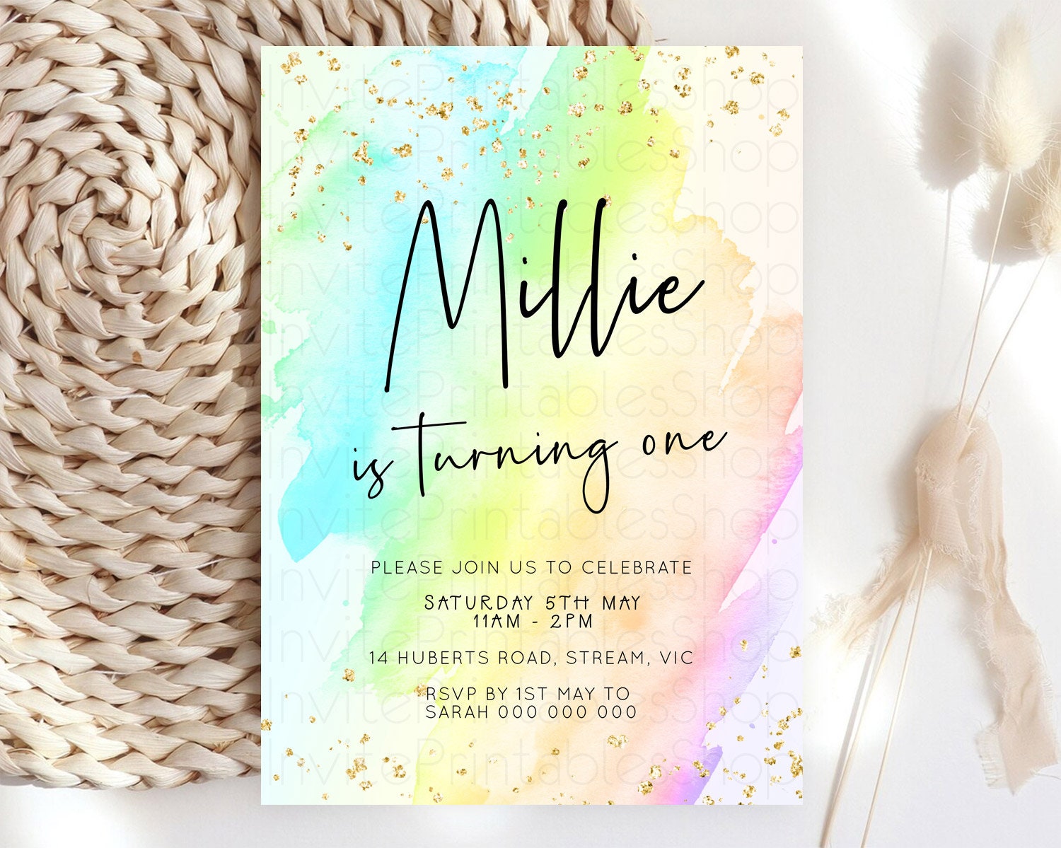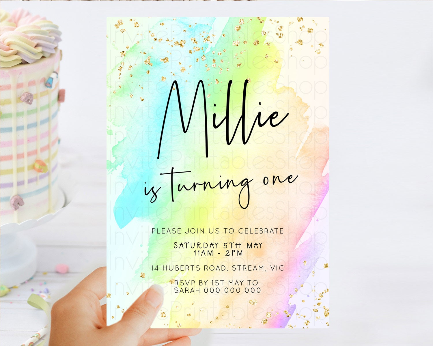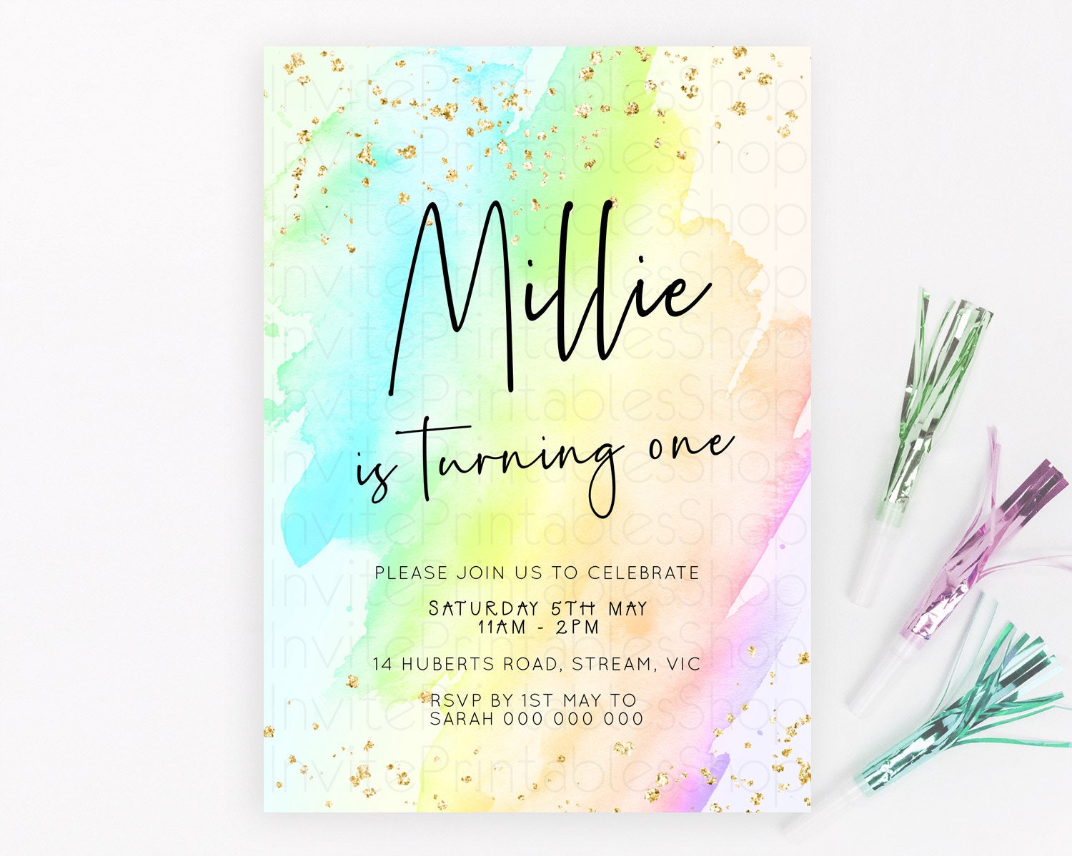 Pastel Birthday Invitation Ombre Watercolor Birthday Invitation Glitter Rainbow Color Splash 1st 2nd 3rd Birthday Invitation D23051