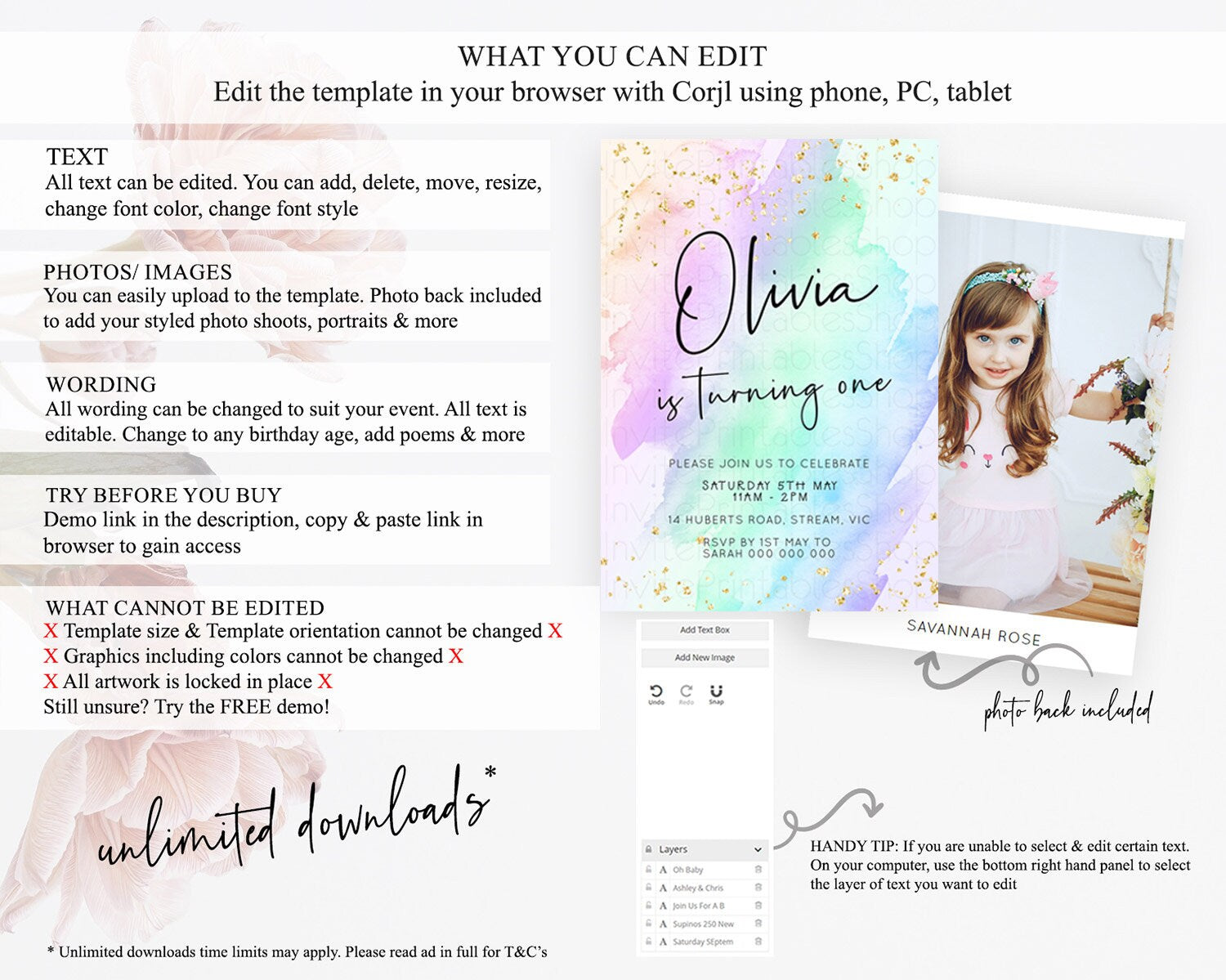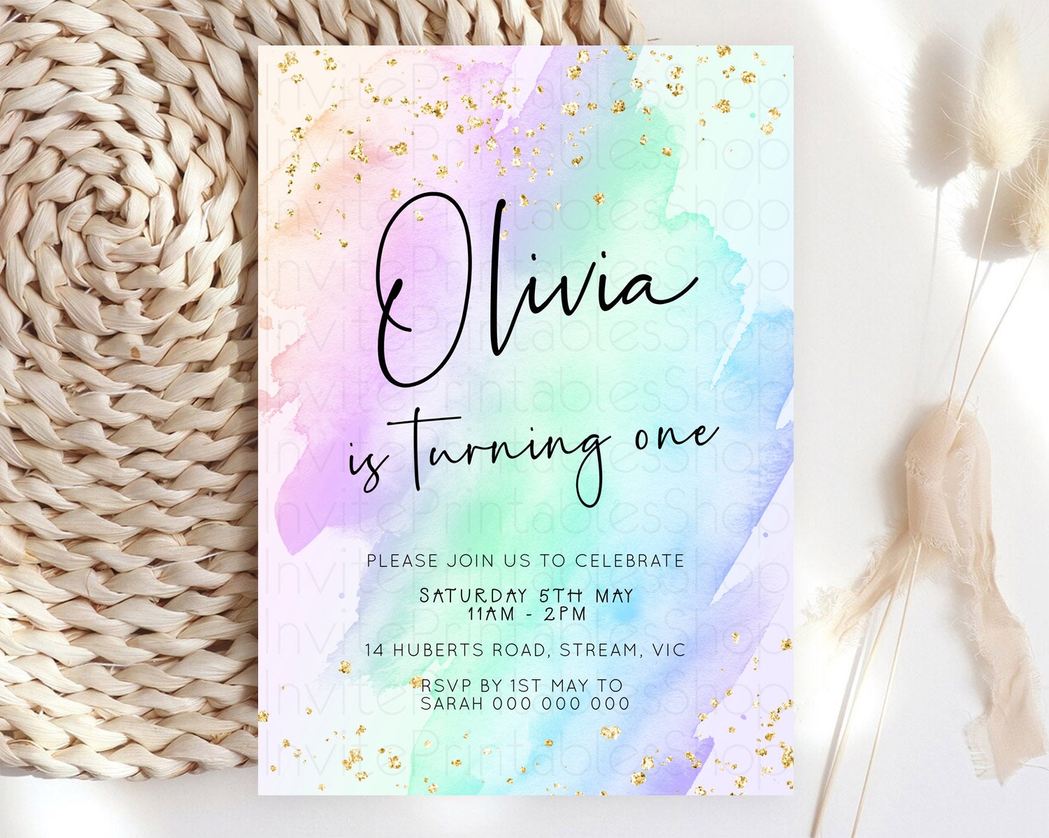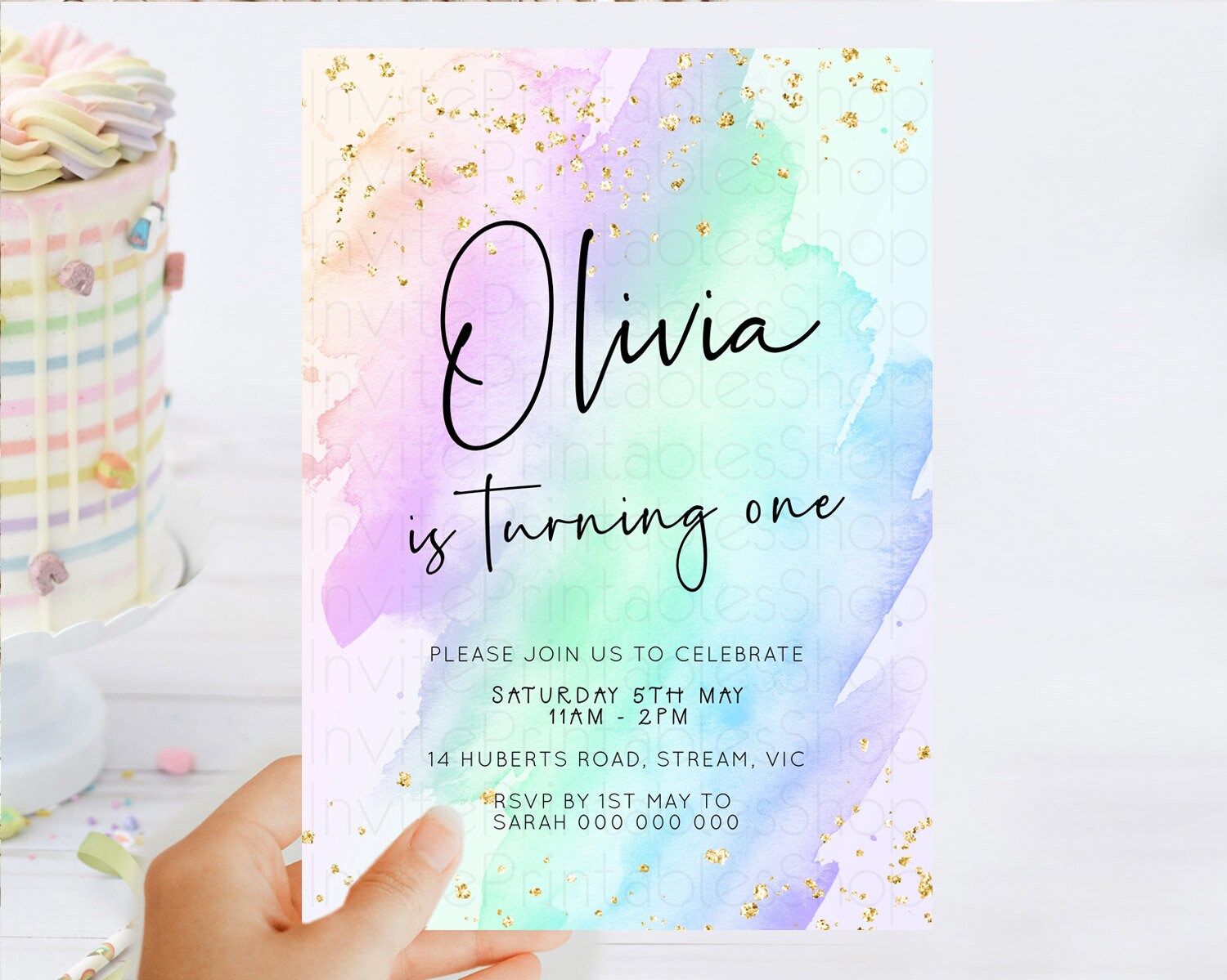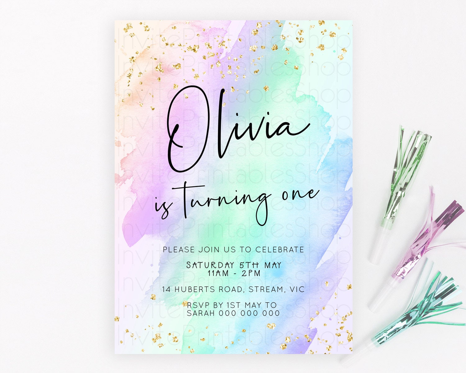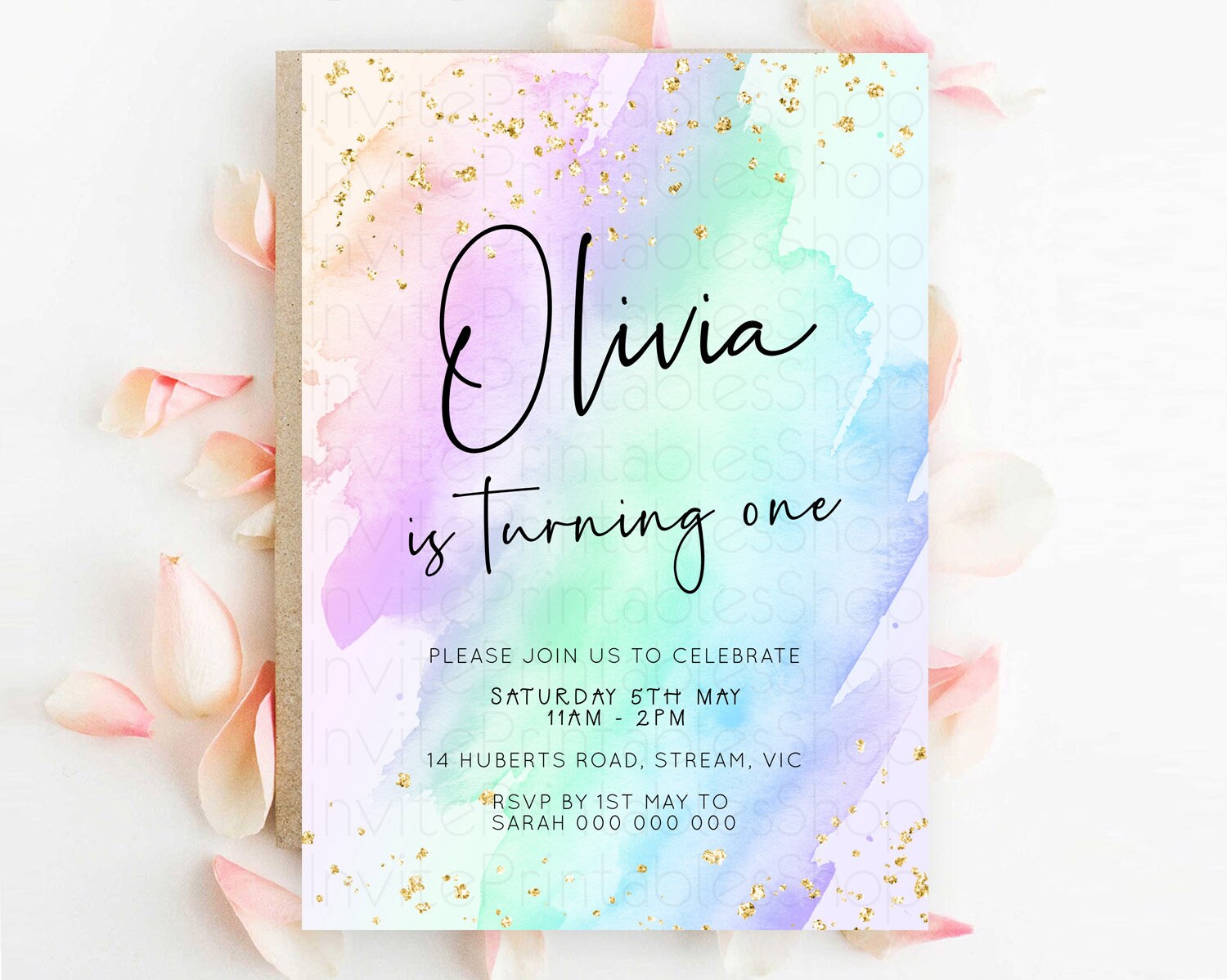 Pastel Birthday Invitation Ombre Watercolor Birthday Invitation Glitter Rainbow Color Splash 1st 2nd 3rd Birthday Invitation D23053