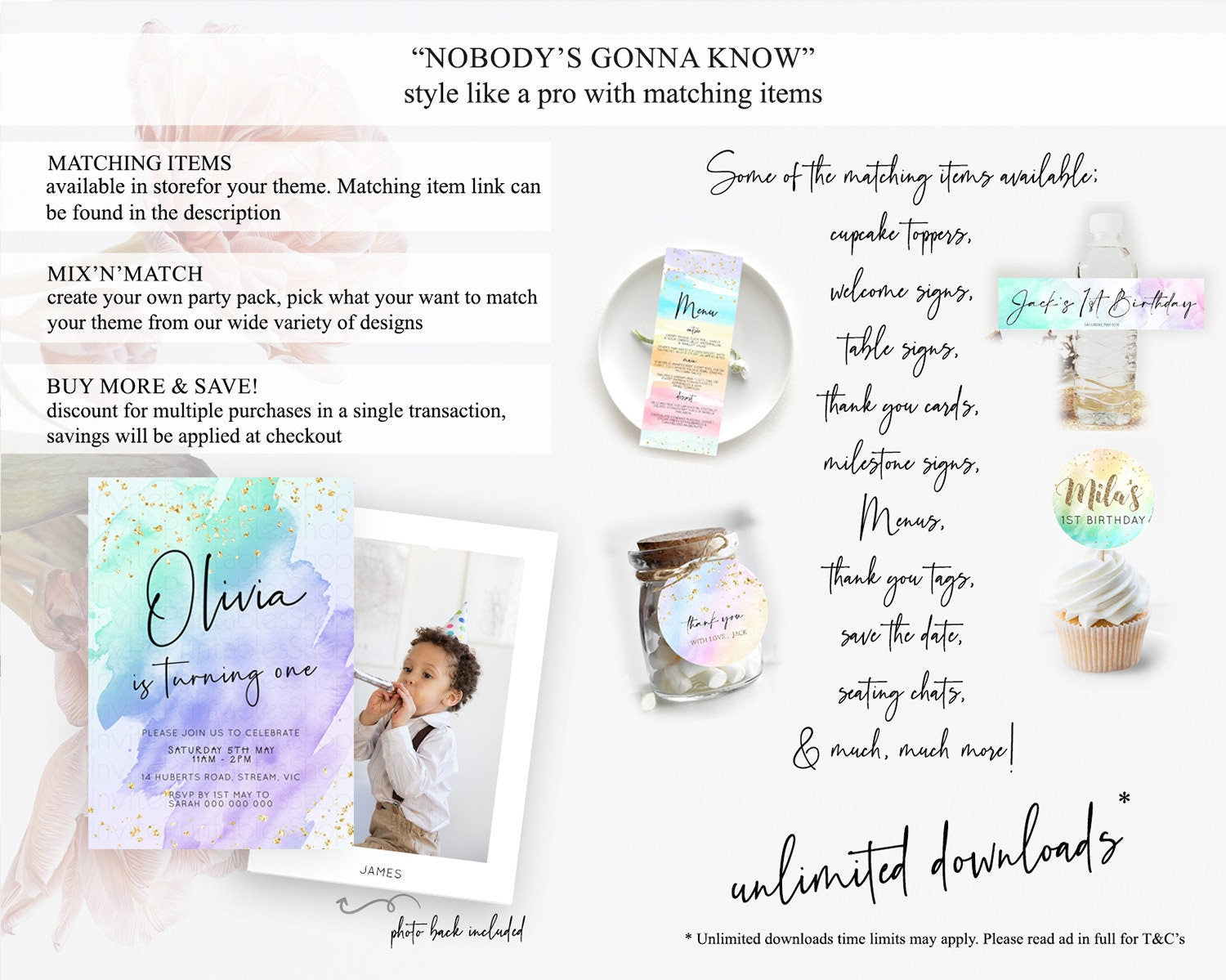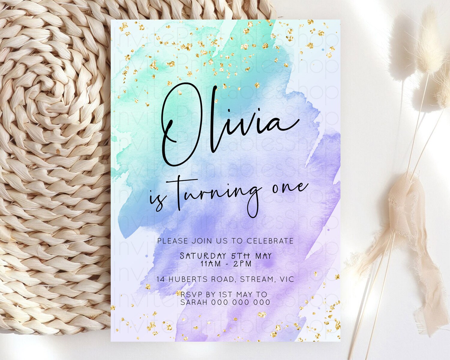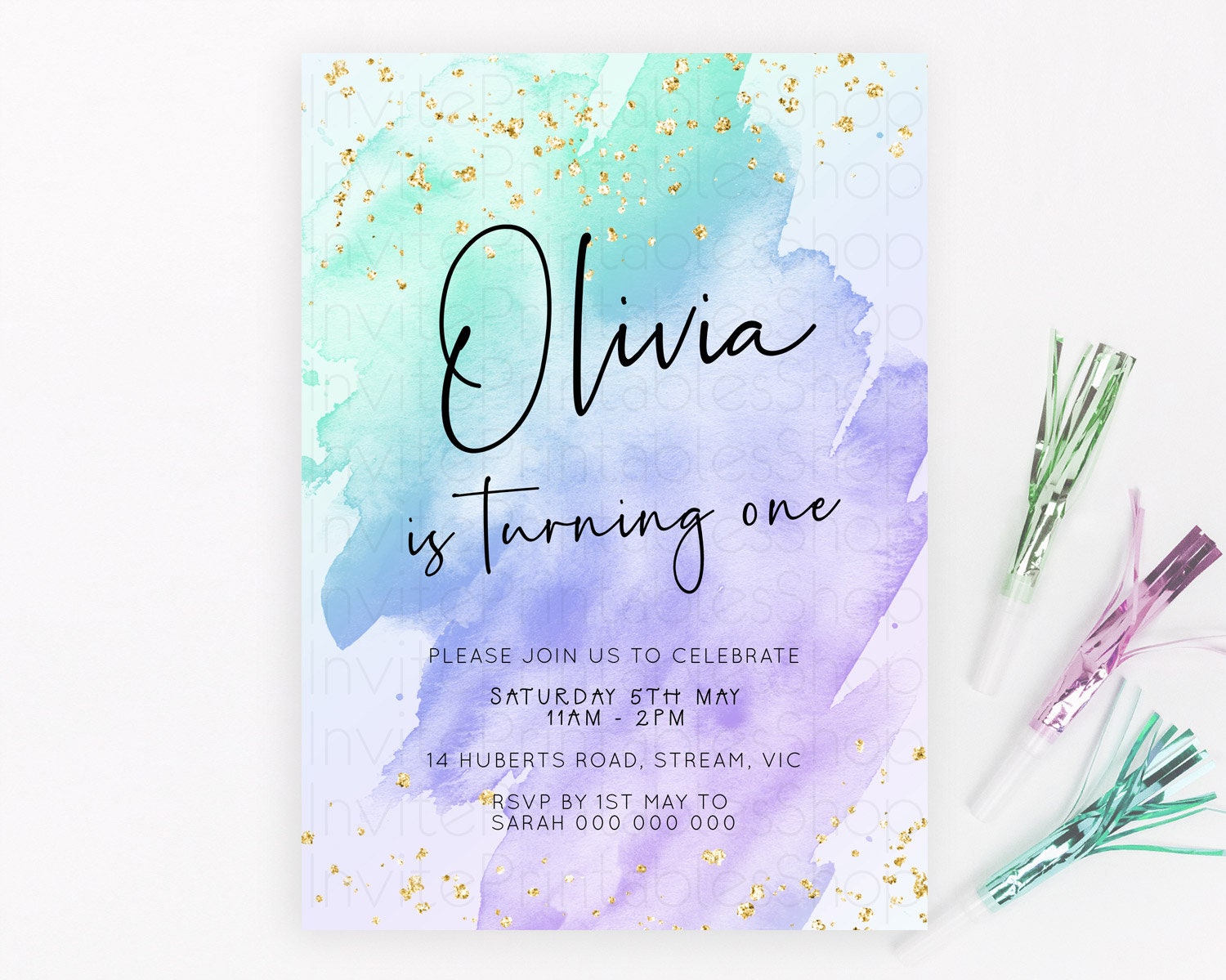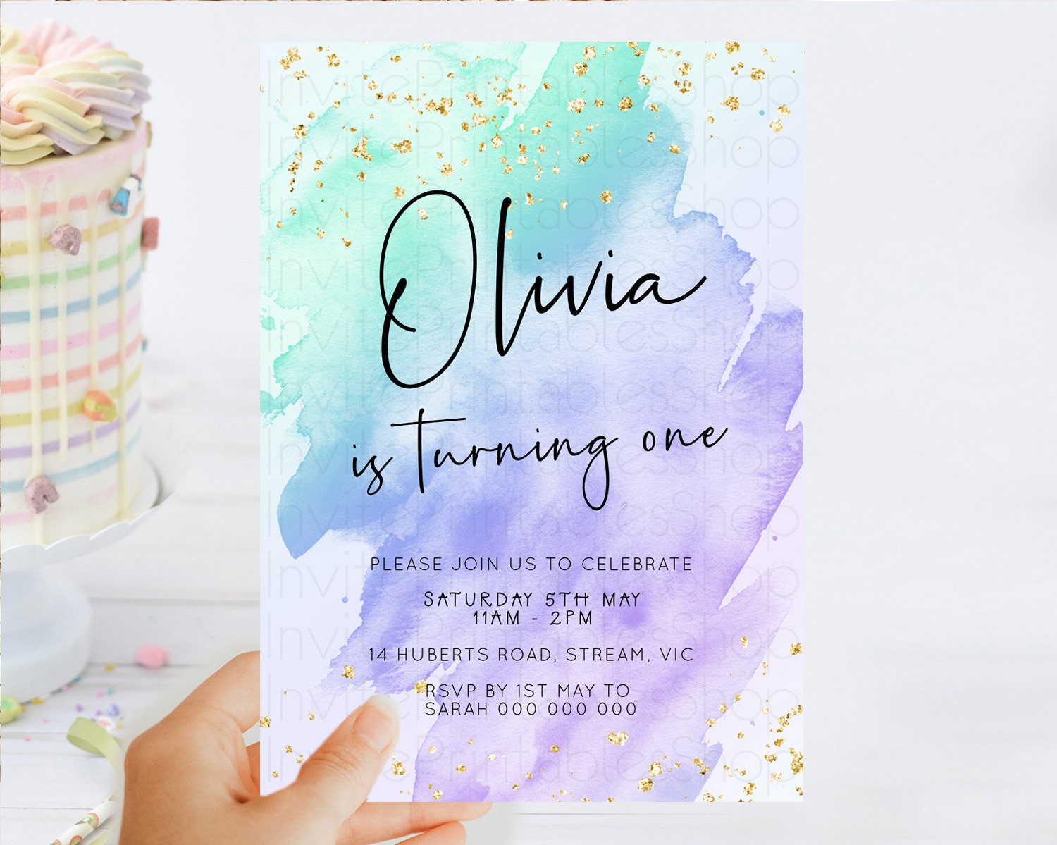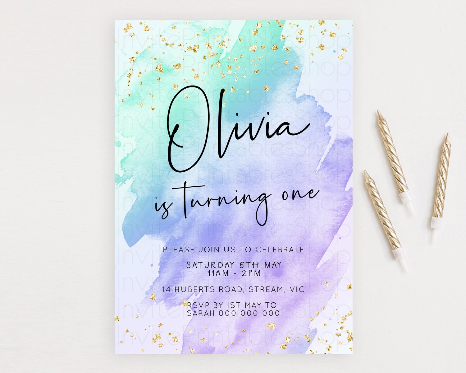 Pastel Birthday Invitation Ombre Watercolor Birthday Invitation Glitter Rainbow Color Splash 1st 2nd 3rd Birthday Invitation D23057