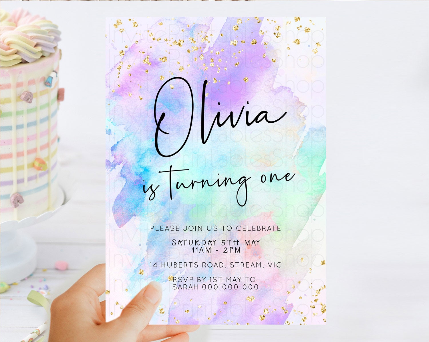 Pastel Birthday Invitation Ombre Watercolor Birthday Invitation Glitter Rainbow Color Splash 1st 2nd 3rd Birthday Invitation D23060