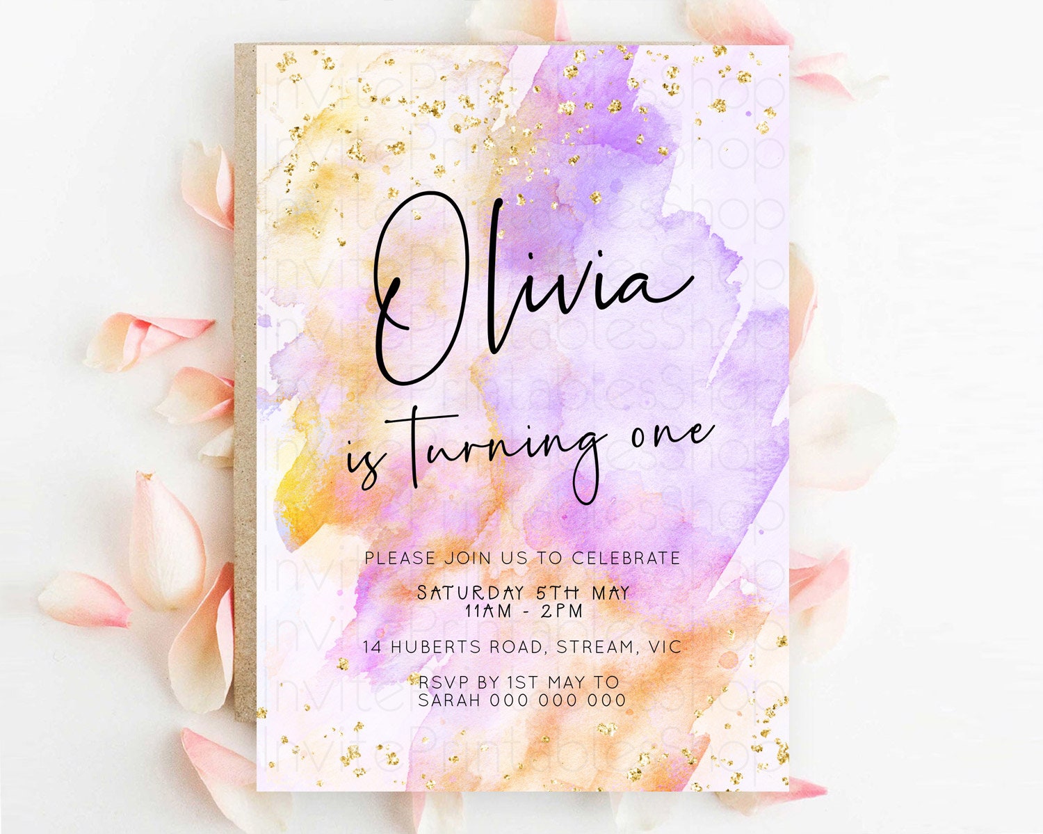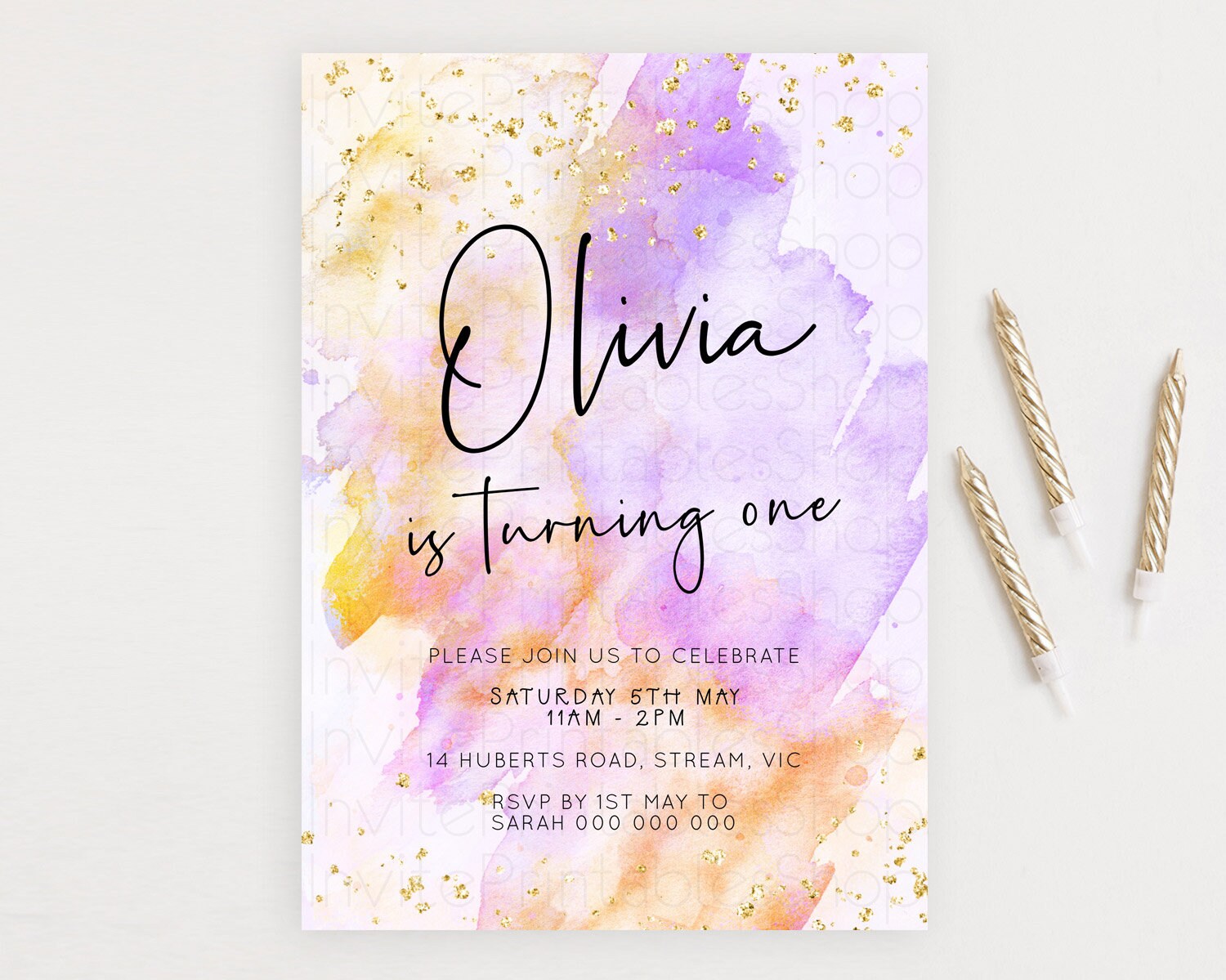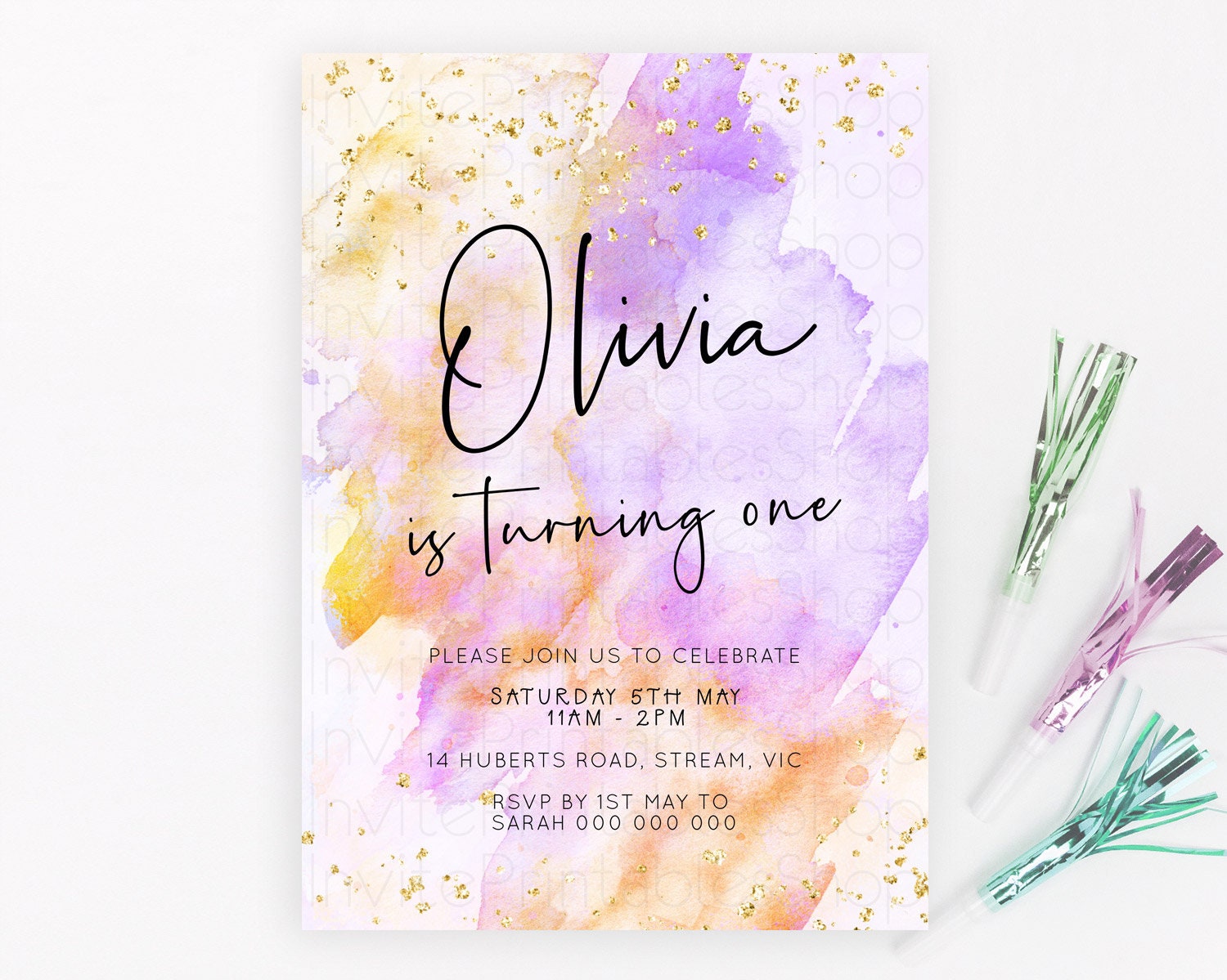 Pastel Birthday Invitation Ombre Watercolor Birthday Invitation Glitter Rainbow Color Splash 1st 2nd 3rd Birthday Invitation D23069