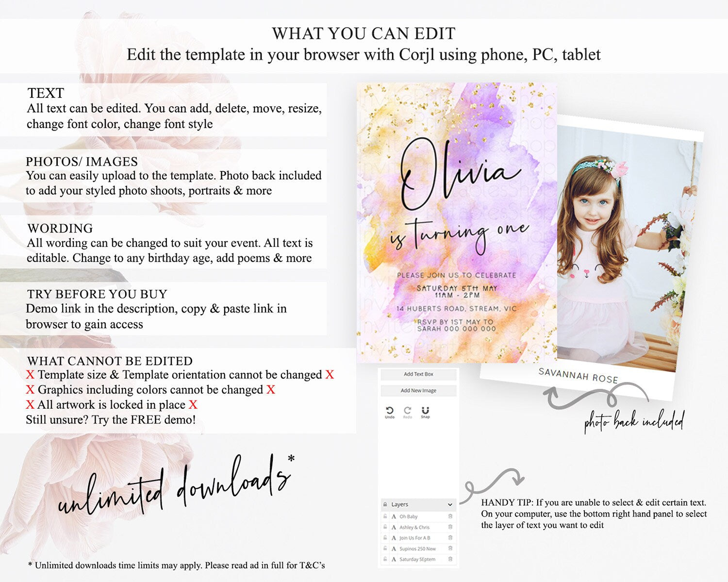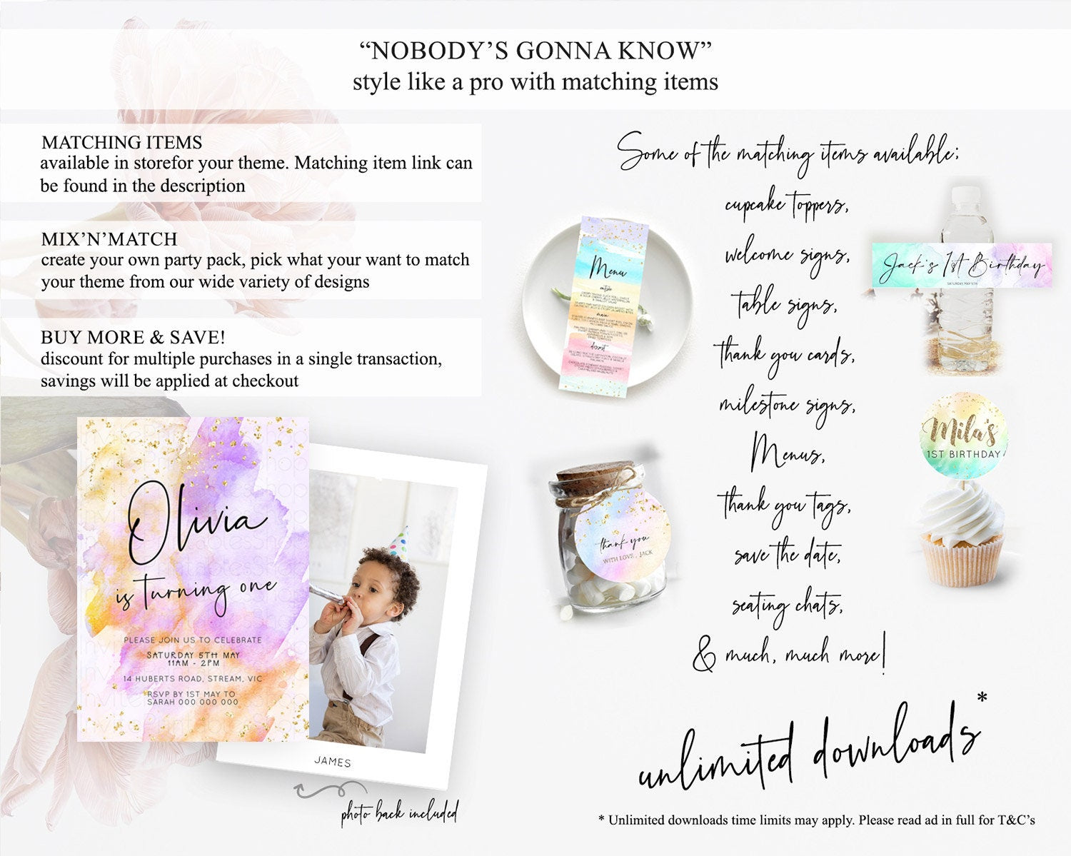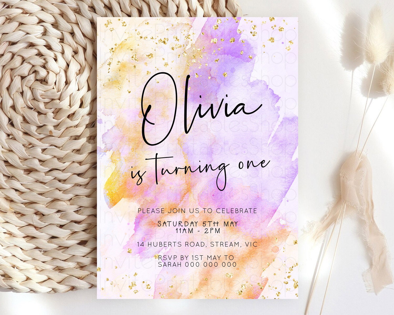 Pastel Birthday Invitation Ombre Watercolor Birthday Invitation Glitter Rainbow Color Splash 1st 2nd 3rd Birthday Invitation D23069