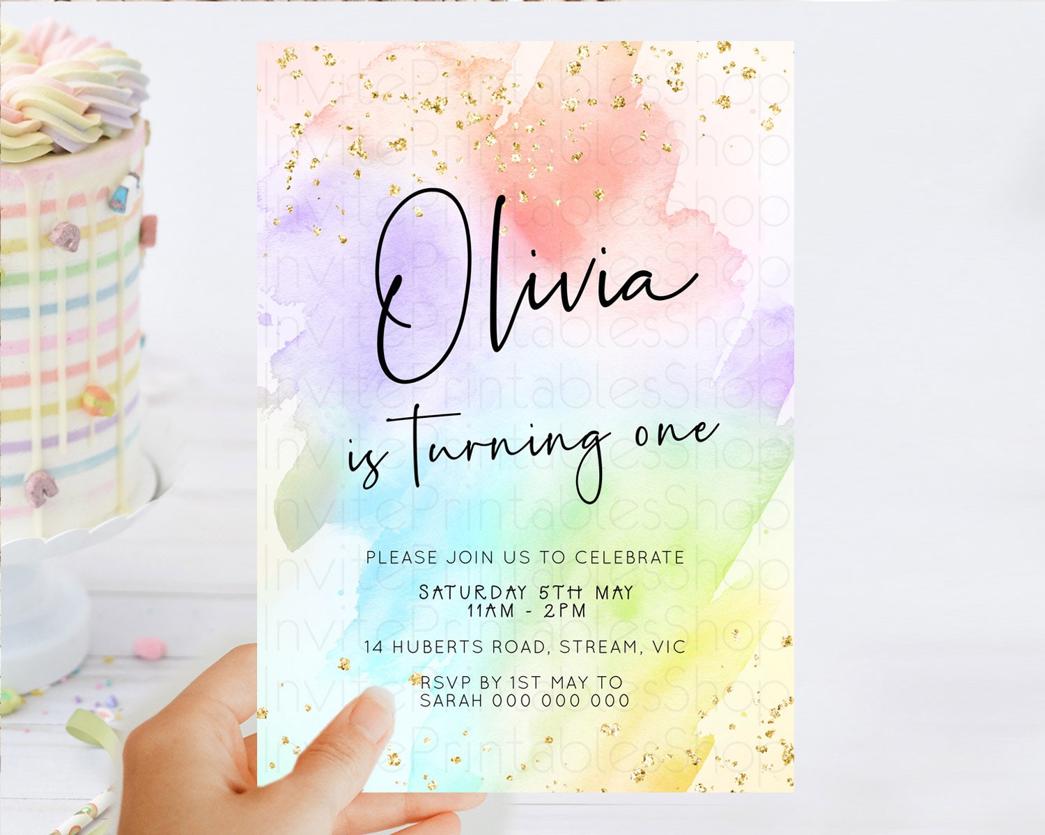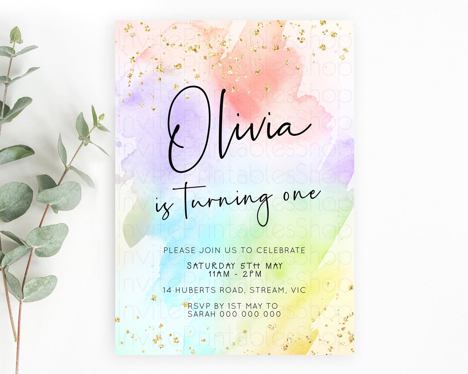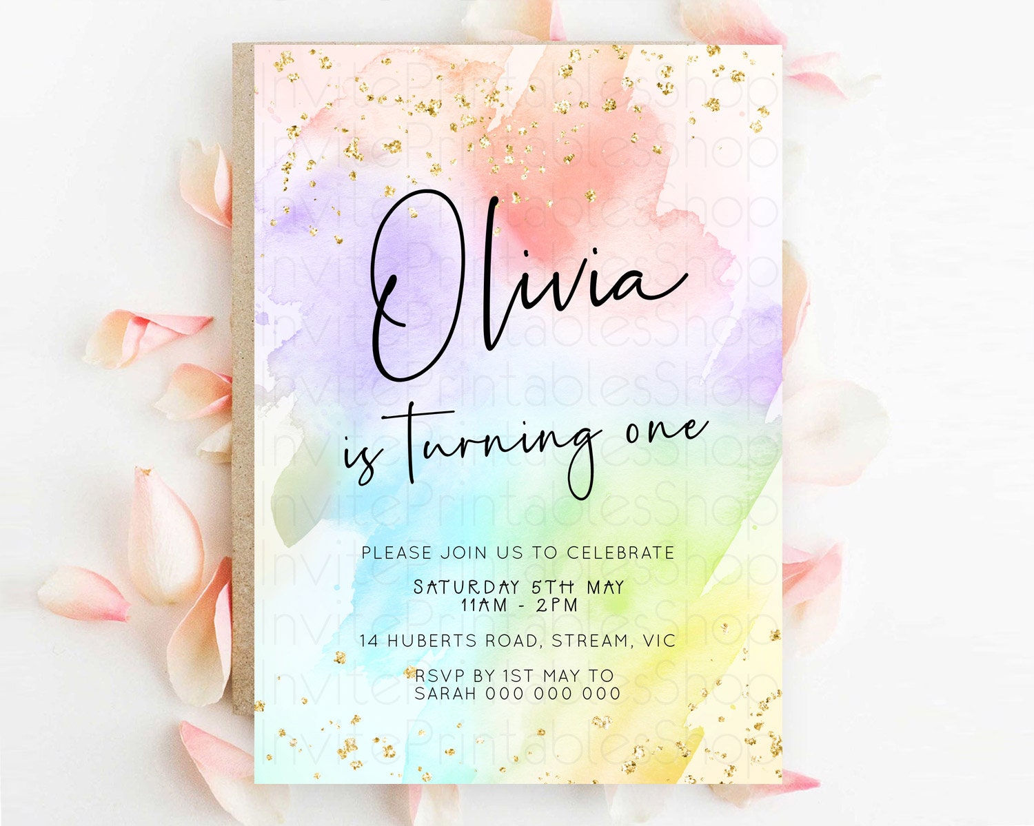 Pastel Birthday Invitation Ombre Watercolor Birthday Invitation Glitter Rainbow Color Splash 1st 2nd 3rd Birthday Invitation D23071