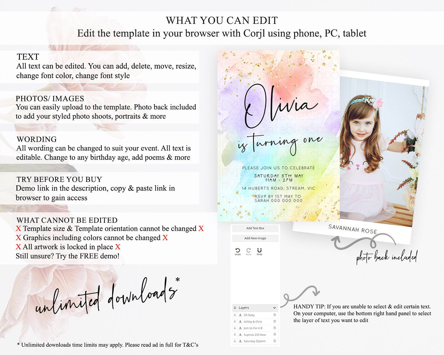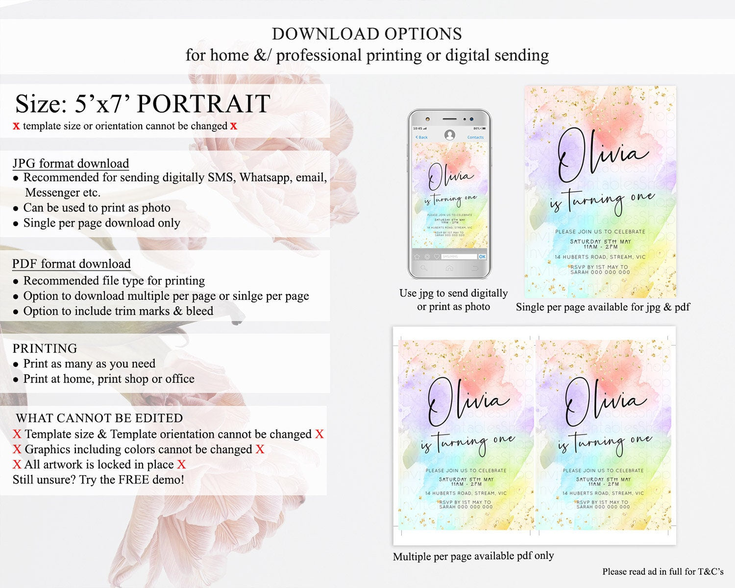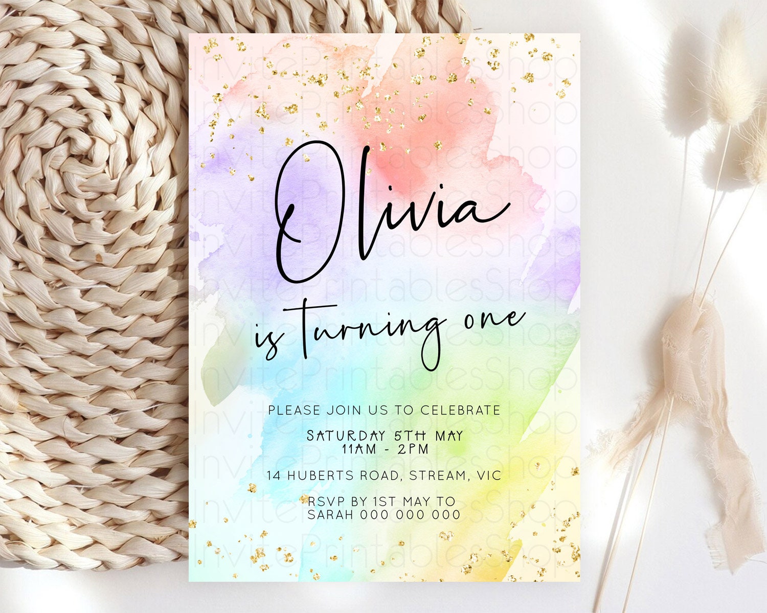 Pastel Birthday Invitation Ombre Watercolor Birthday Invitation Glitter Rainbow Color Splash 1st 2nd 3rd Birthday Invitation D23071