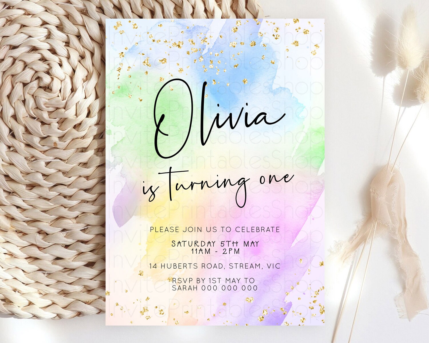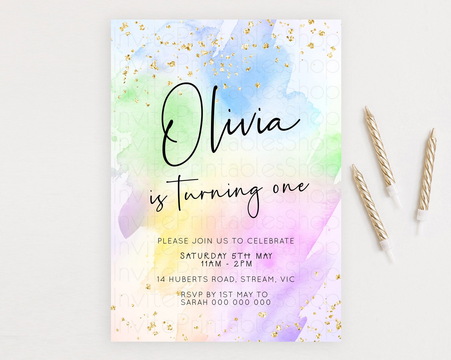 Pastel Birthday Invitation Ombre Watercolor Birthday Invitation Glitter Rainbow Color Splash 1st 2nd 3rd Birthday Invitation D23073
