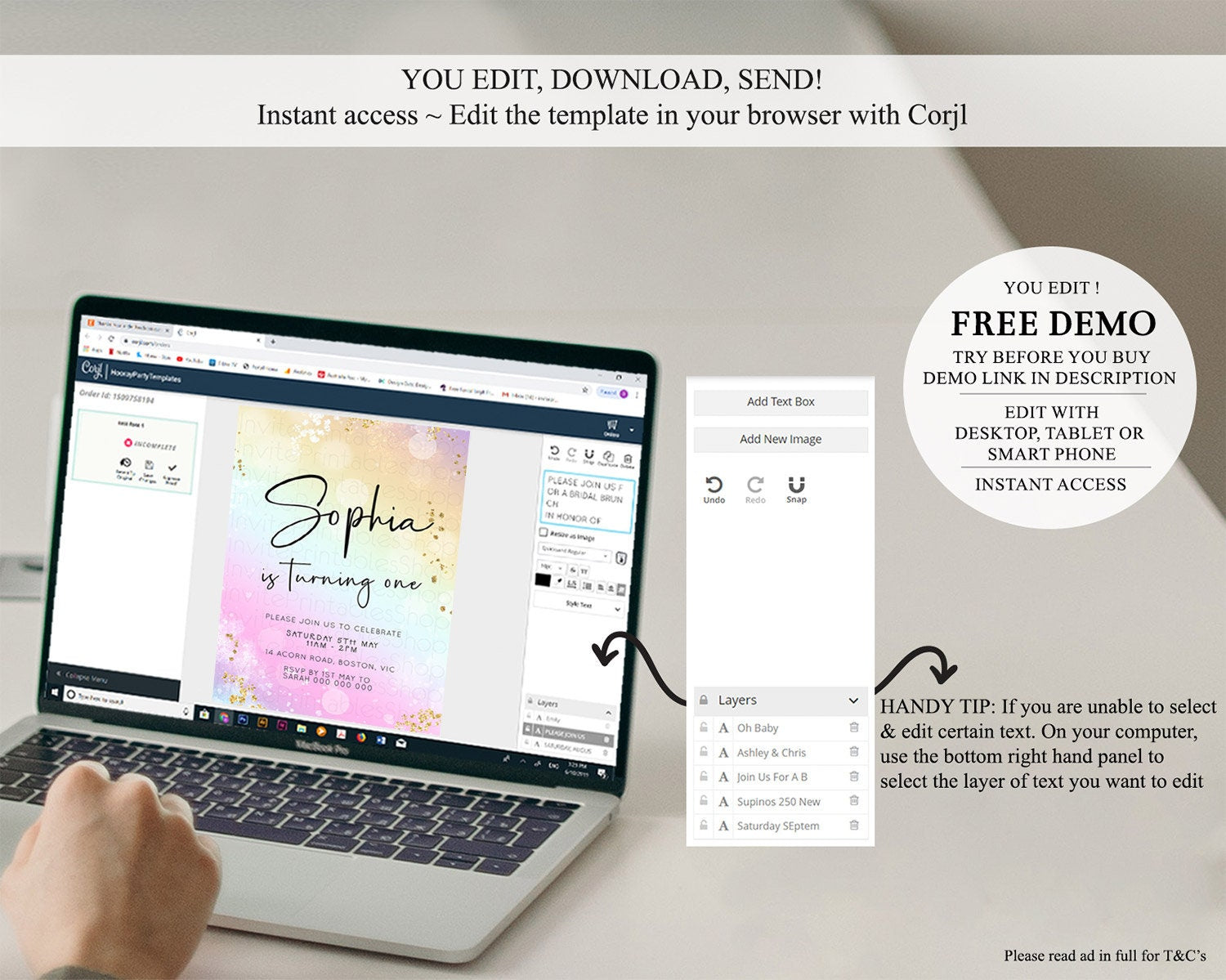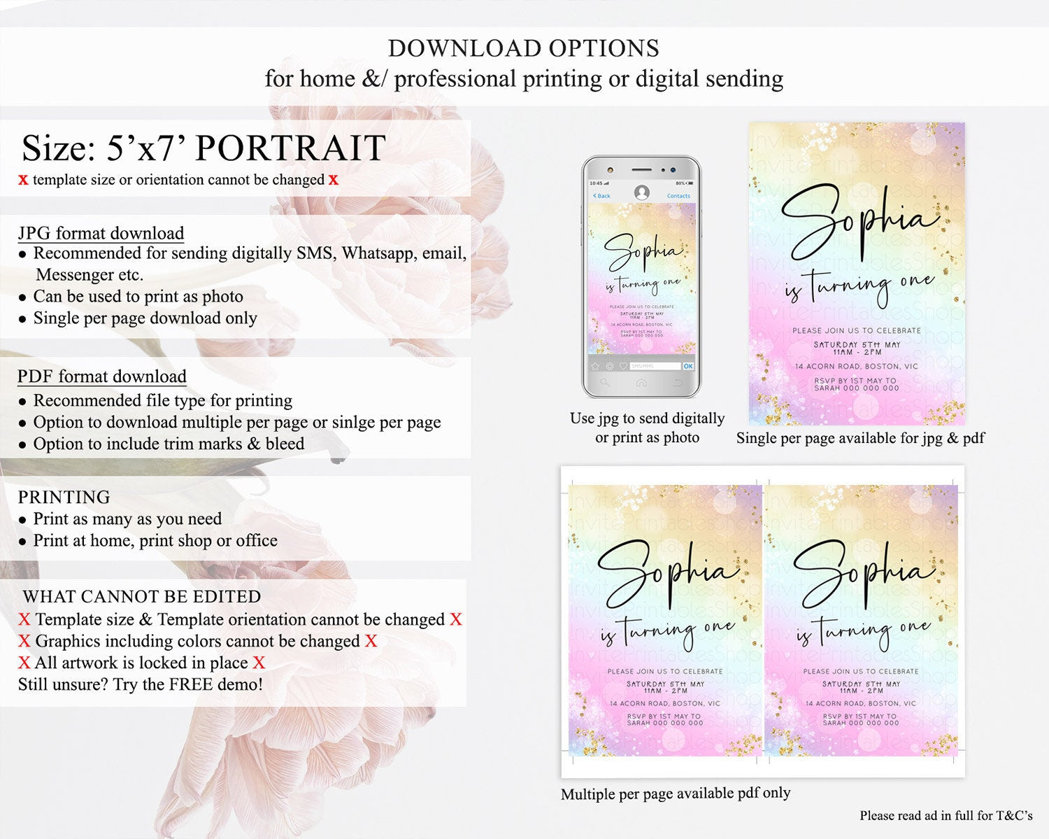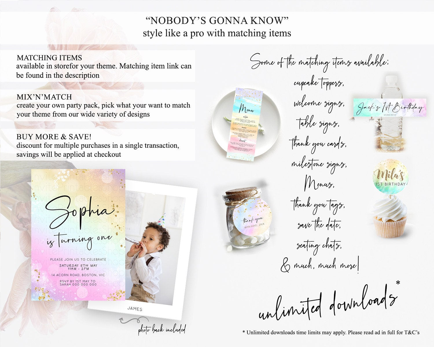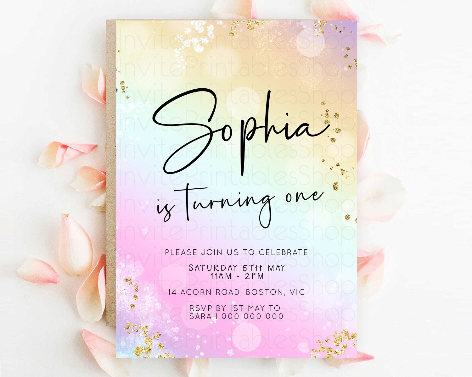 Pastel Birthday Invitation Ombre Watercolor Birthday Invitation Glitter Rainbow Color Splash 1st 2nd 3rd Birthday Invitation D23102