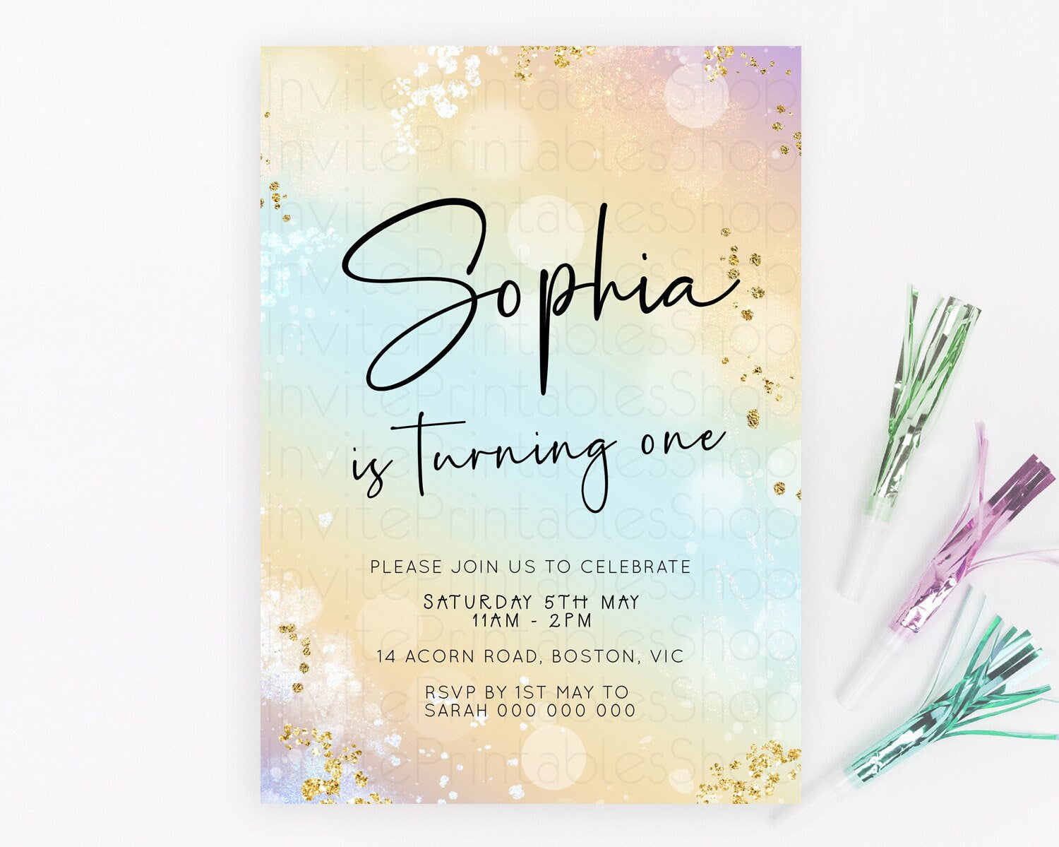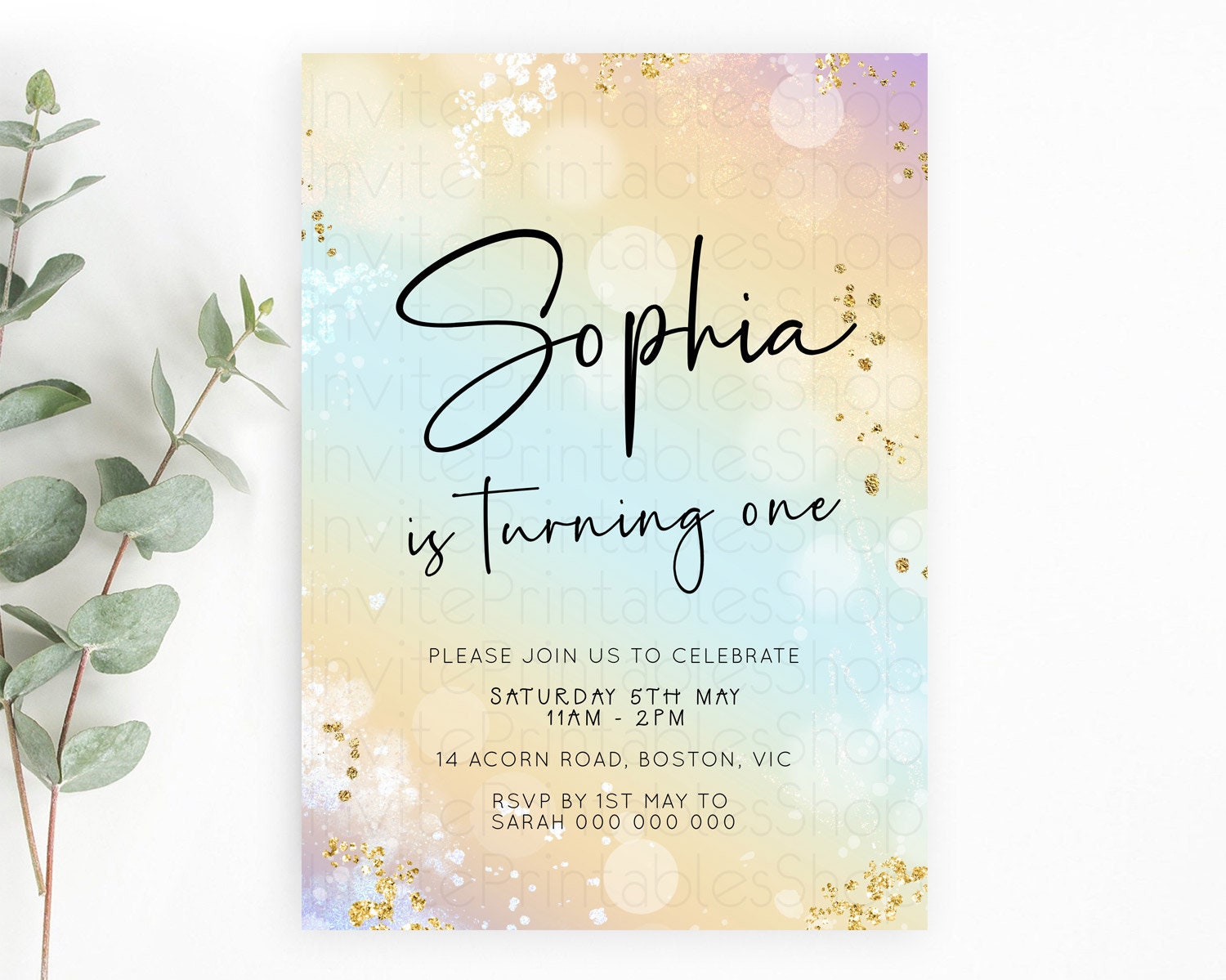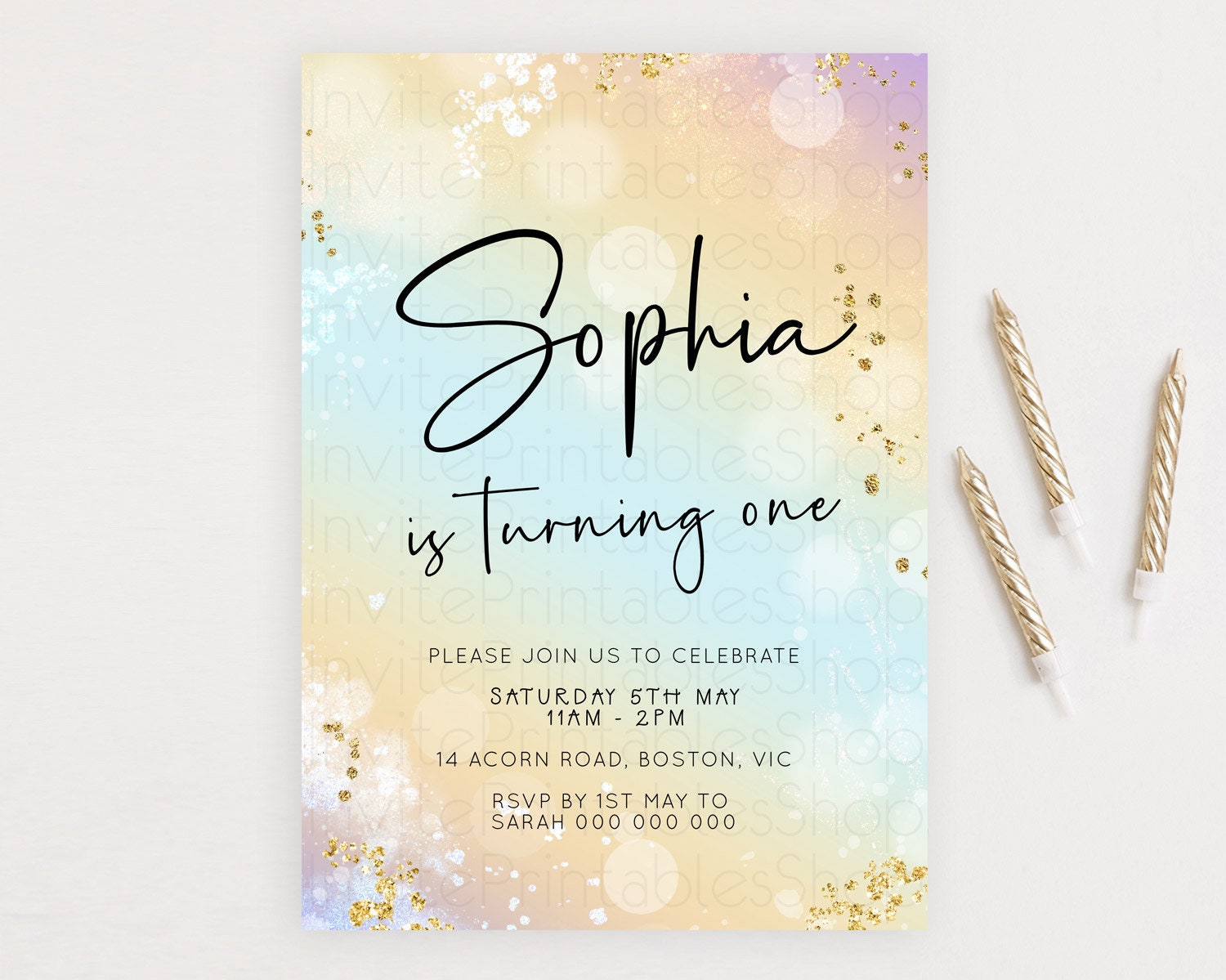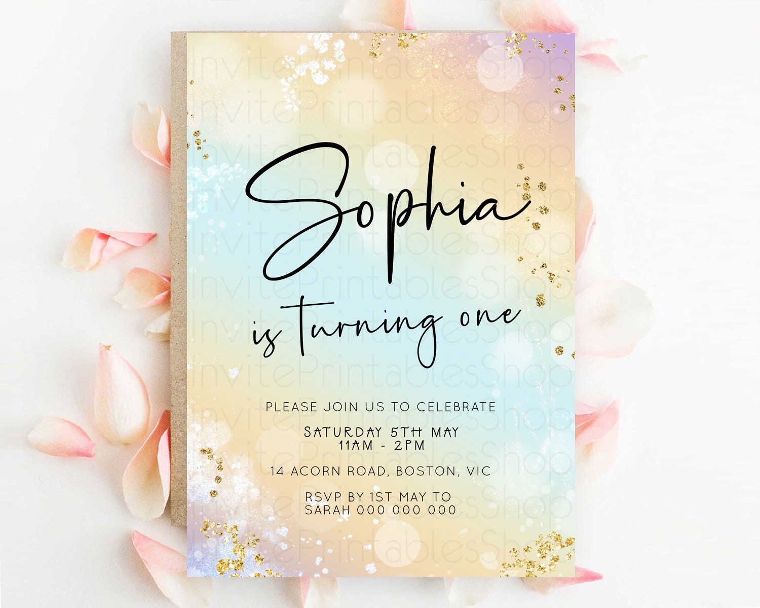 Pastel Birthday Invitation Ombre Watercolor Birthday Invitation Glitter Rainbow Color Splash 1st 2nd 3rd Birthday Invitation D23105