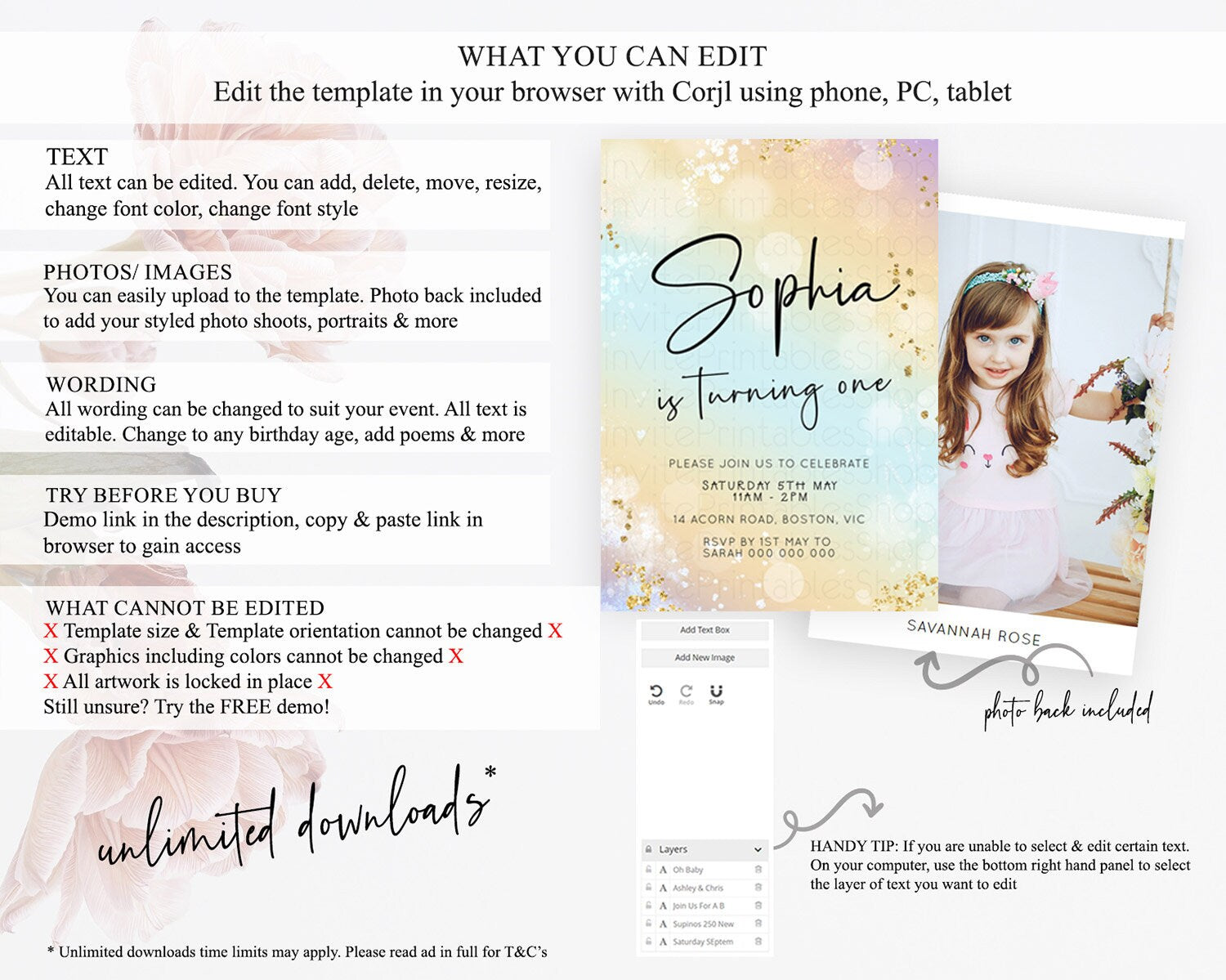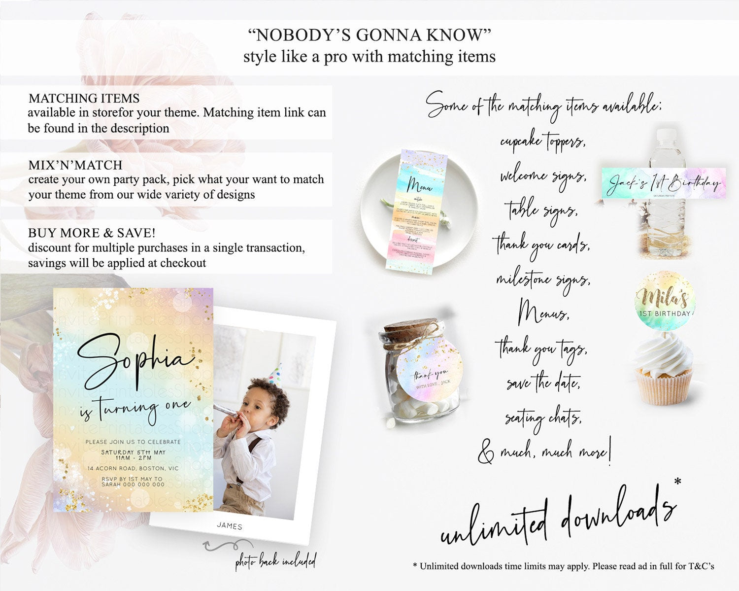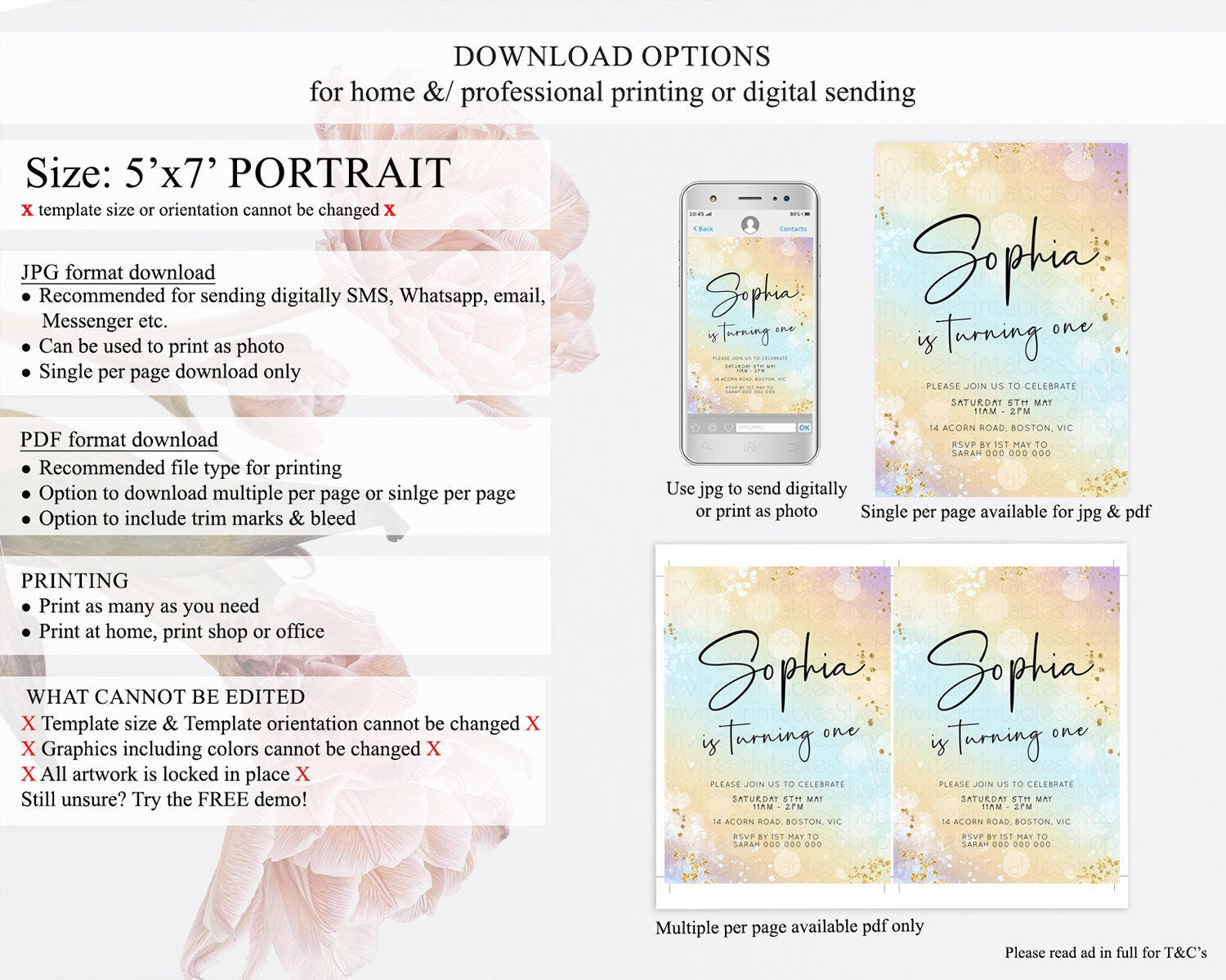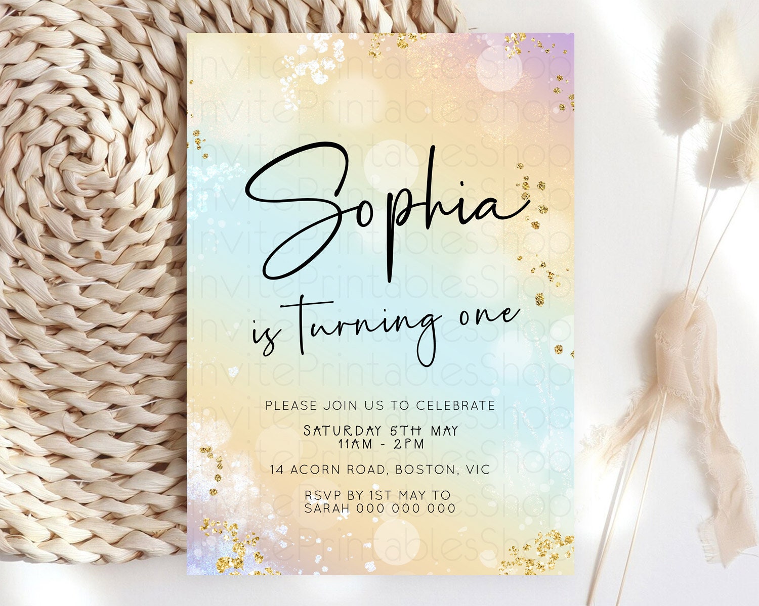 Pastel Birthday Invitation Ombre Watercolor Birthday Invitation Glitter Rainbow Color Splash 1st 2nd 3rd Birthday Invitation D23105
