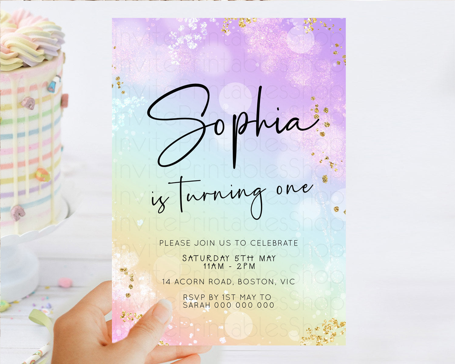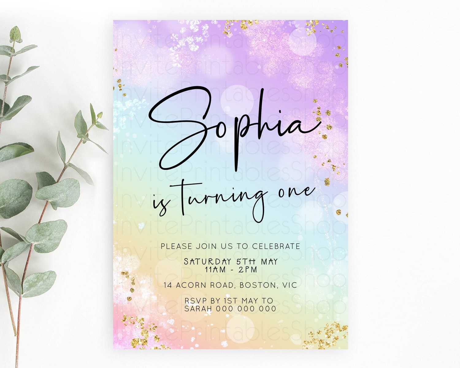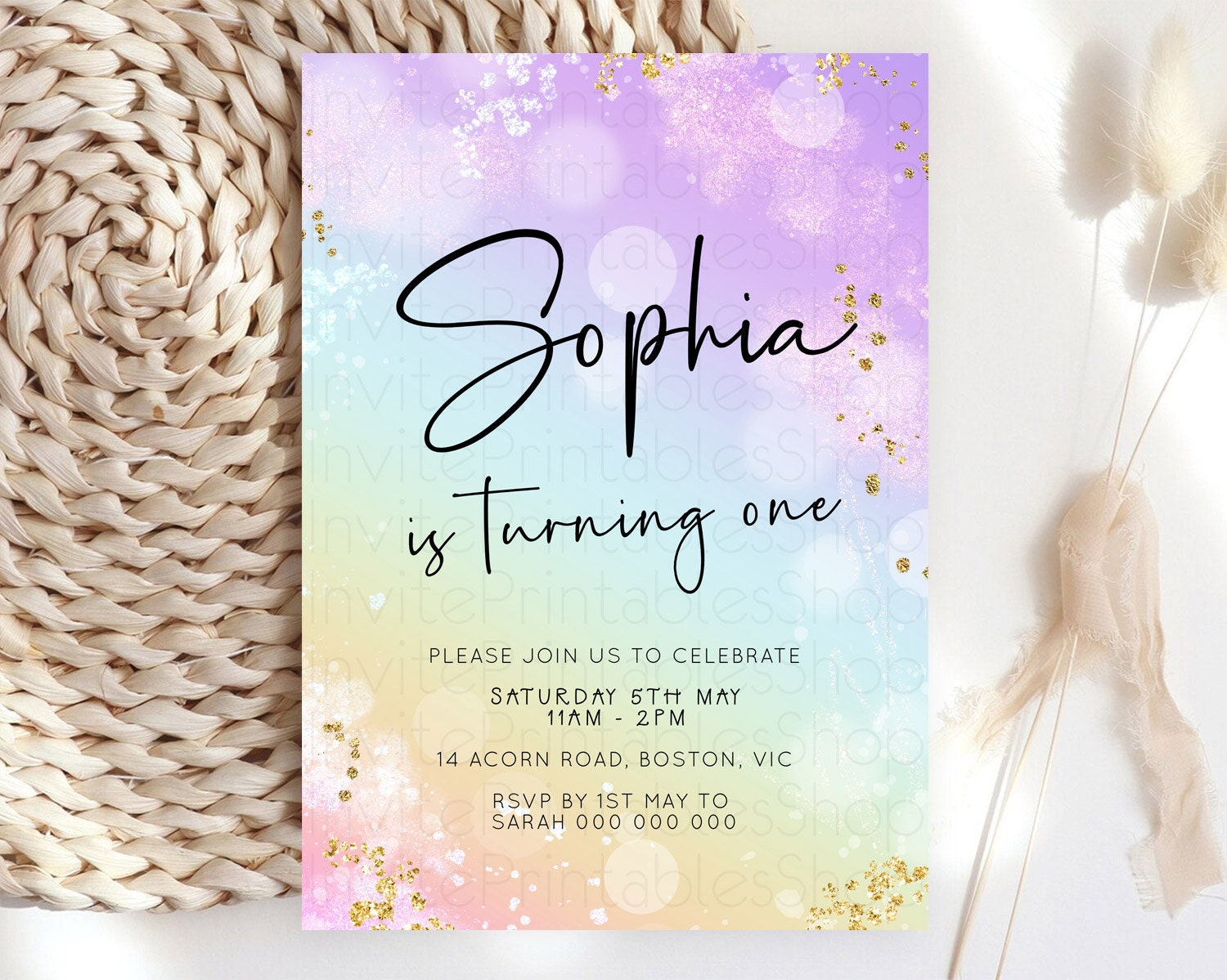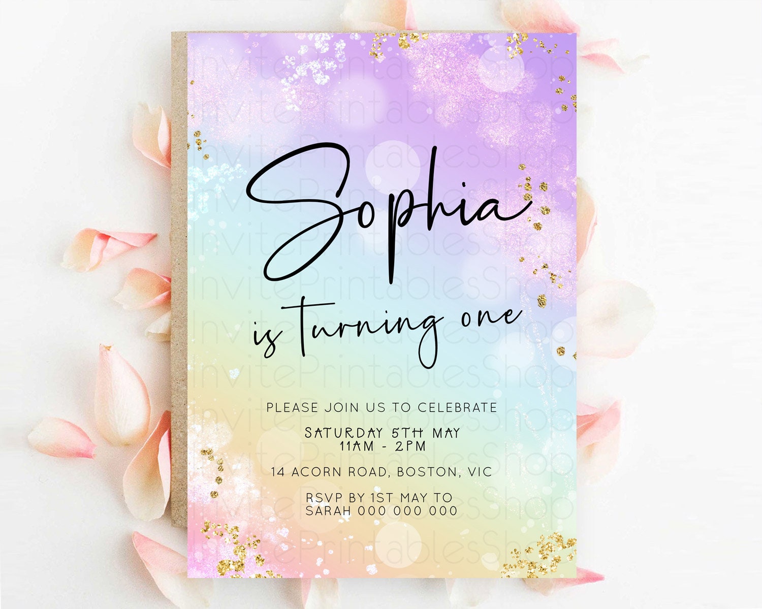 Pastel Birthday Invitation Ombre Watercolor Birthday Invitation Glitter Rainbow Color Splash 1st 2nd 3rd Birthday Invitation D23107