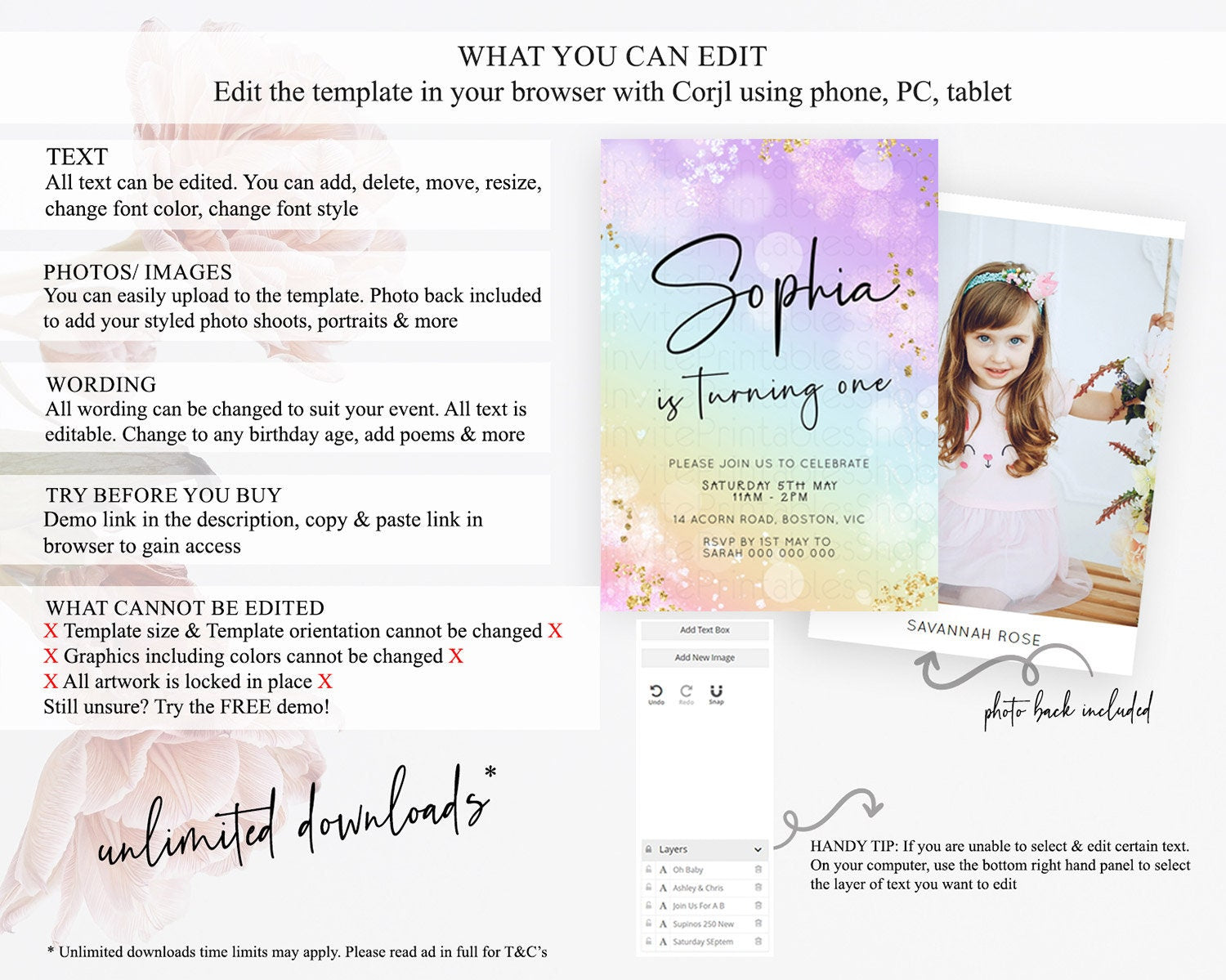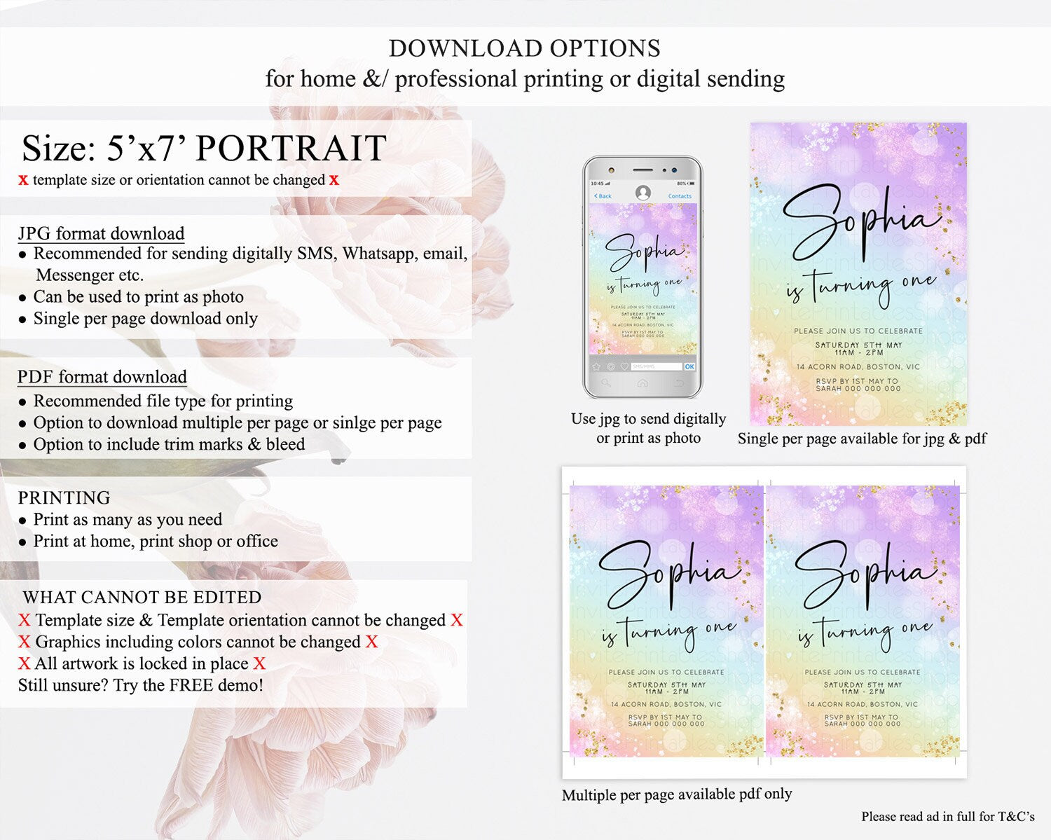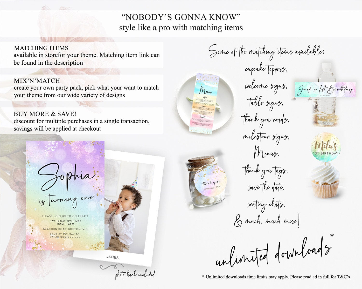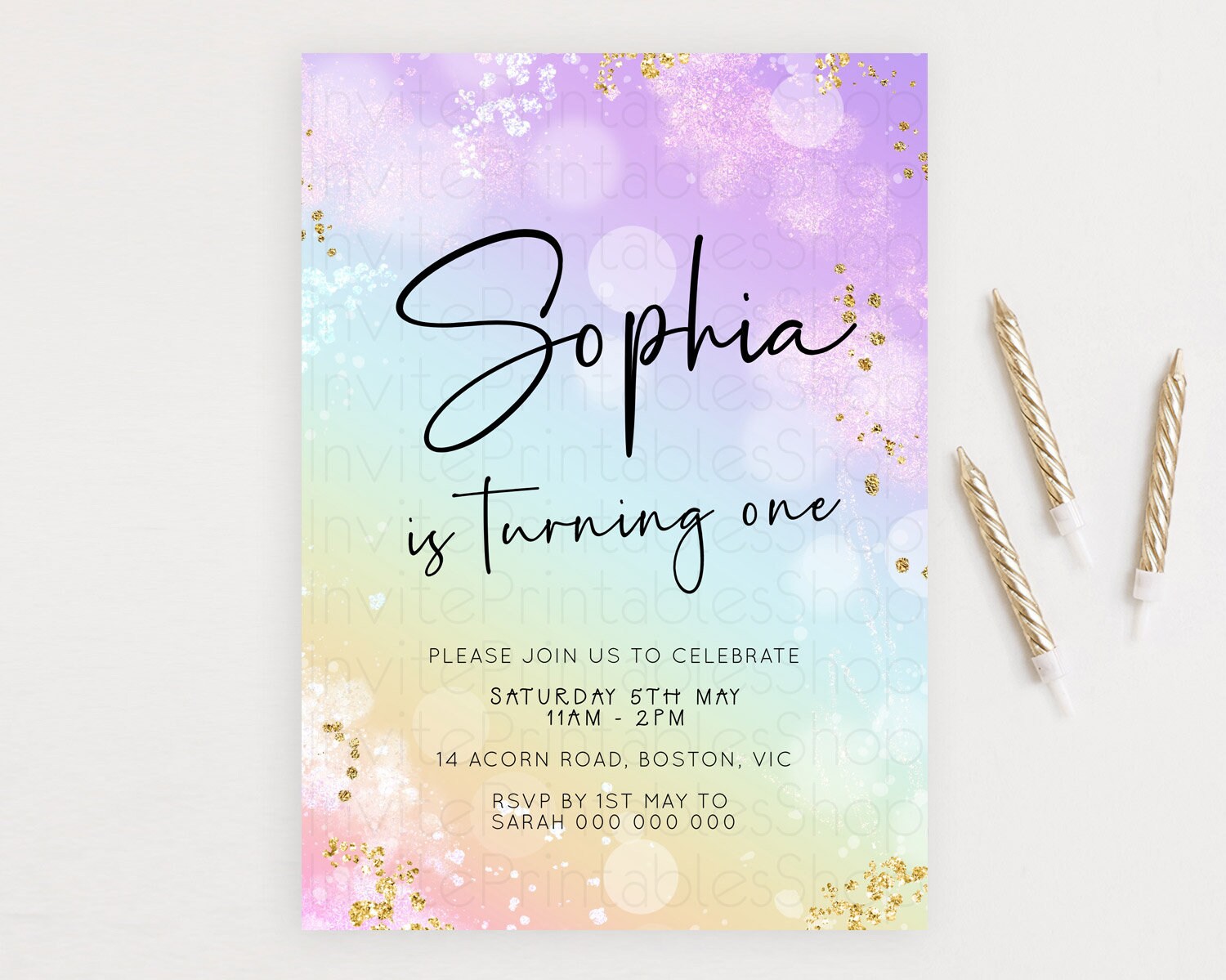 Pastel Birthday Invitation Ombre Watercolor Birthday Invitation Glitter Rainbow Color Splash 1st 2nd 3rd Birthday Invitation D23107