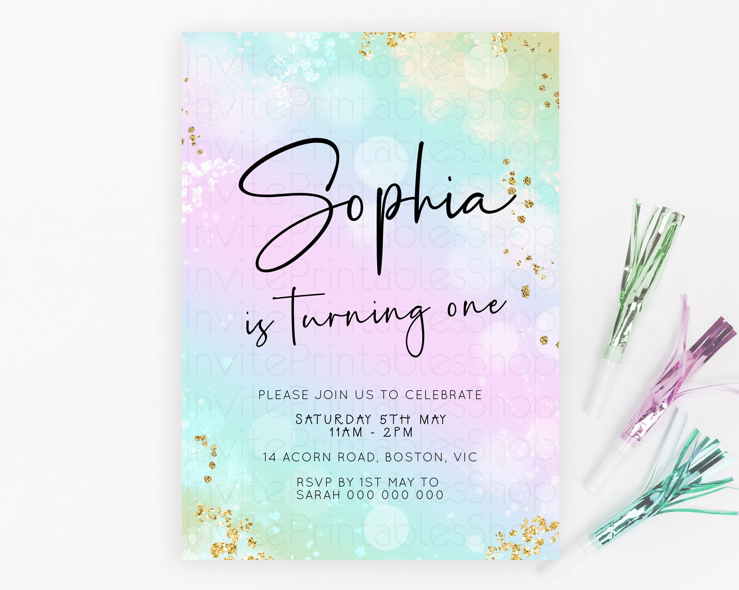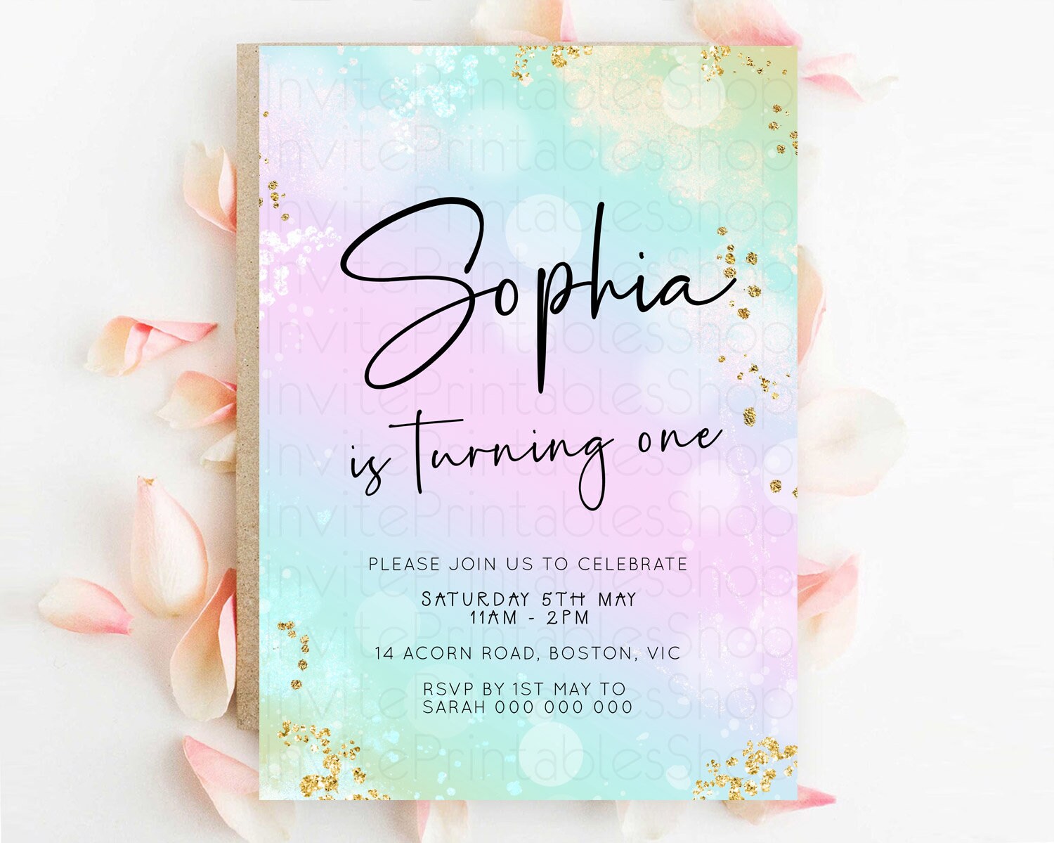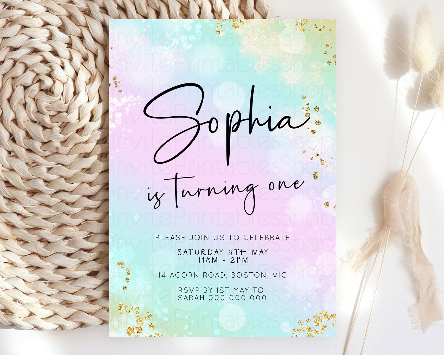 Pastel Birthday Invitation Ombre Watercolor Birthday Invitation Glitter Rainbow Color Splash 1st 2nd 3rd Birthday Invitation D23108