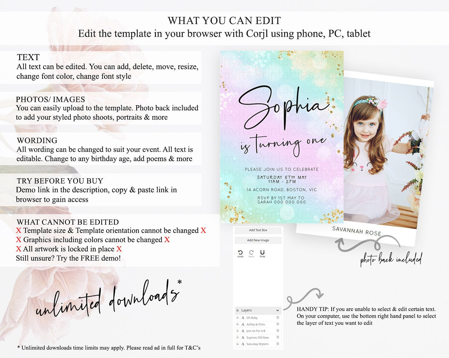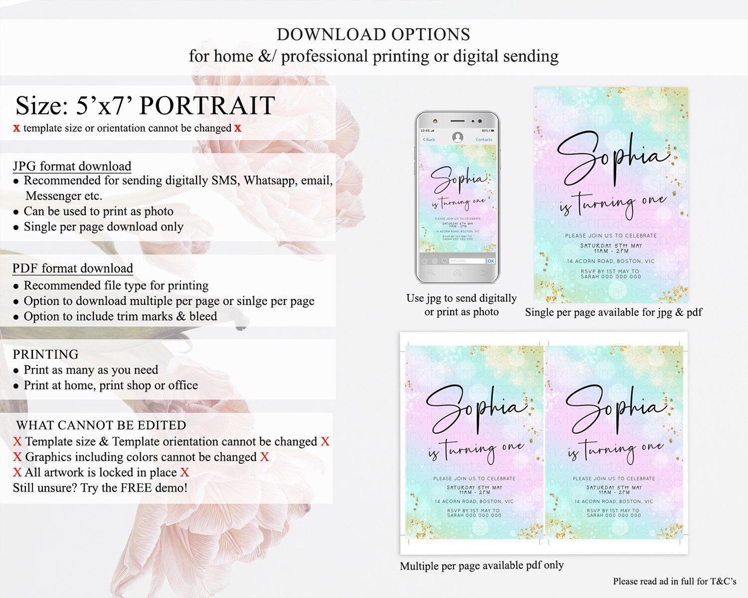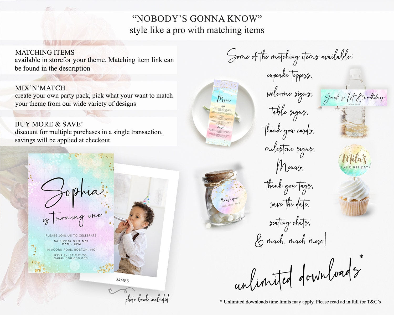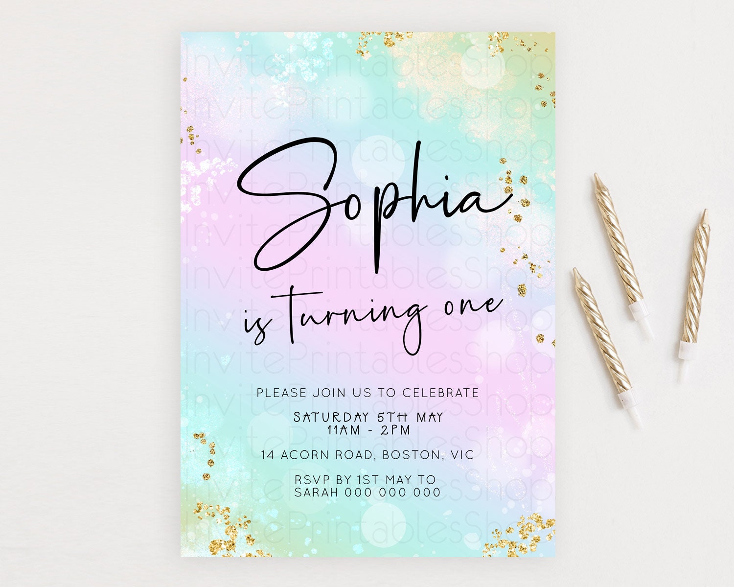 Pastel Birthday Invitation Ombre Watercolor Birthday Invitation Glitter Rainbow Color Splash 1st 2nd 3rd Birthday Invitation D23108
