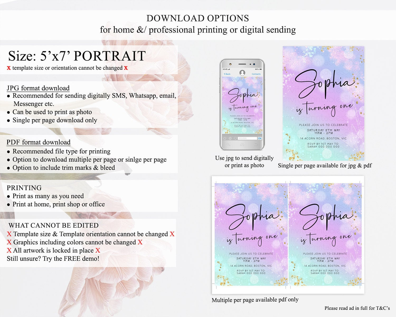 Pastel Birthday Invitation Ombre Watercolor Birthday Invitation Glitter Rainbow Color Splash 1st 2nd 3rd Birthday Invitation D23109