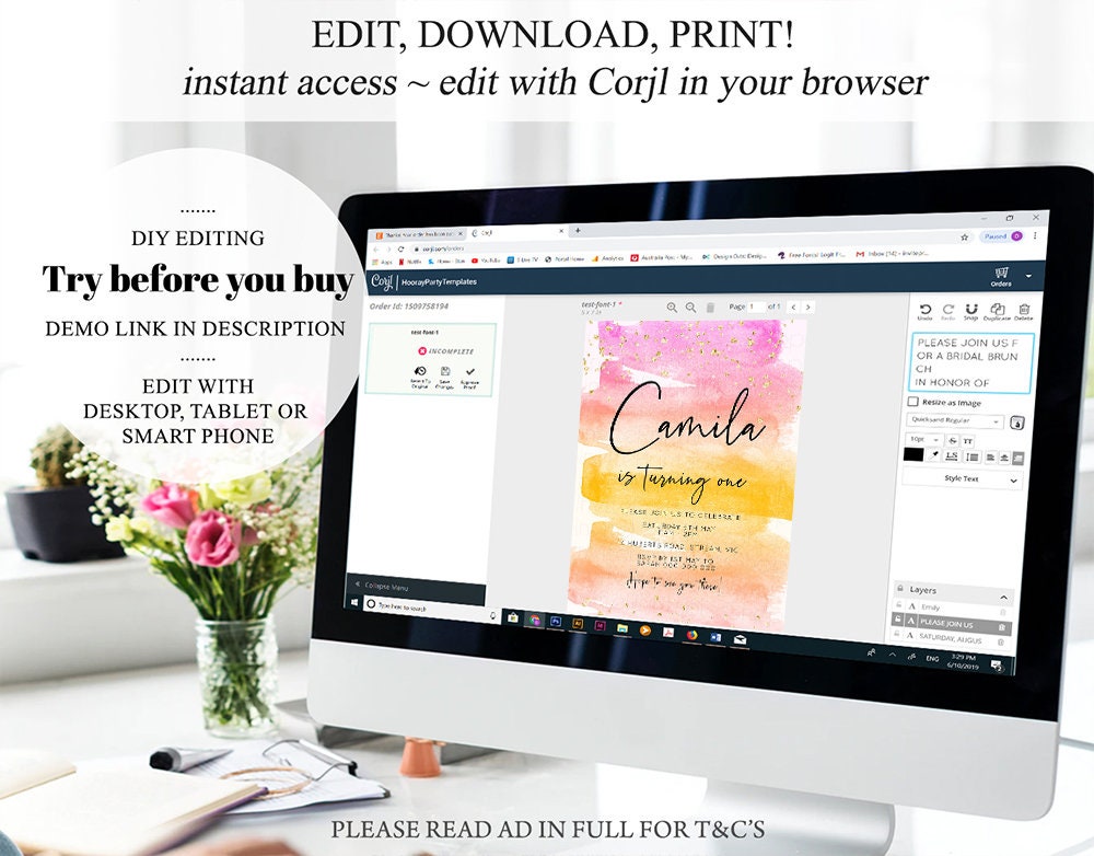 •Try before you buy! • DEMO LINK- https://www.corjl.com/d/36C7BE PLEASE READ AD IN FULL!! •Digital file. No physical item will be shipped •Do it yourself Editing. Edit online with Corjl or Edit with your mobile ITEM DETAILS Invitation size: 5’x7’ File type: PDF, JPEG Resolution: 300DPI PDF FILE OPTIONS: •Recommended for printing •Ability to print multiple per page (if size permits) •Option to include bleed/ trim marks JPG FILE OPTIONS: •Recommended for MMS/ SMS/ Electronic send out •Can be used to print as photo •Option to include bleed/ trim marks EDITING • Do it yourself editing • Mobile editing is available • Google chrome is the recommend browser for Corjl. Please download here for FREE: https://www.google.com/chrome/ • Using other browsers may not show all of Corjl's editing features • Editing on a desktop/ laptop computer is recommended to access all of Corjl features • Mobile editing is available, please use a desktop/ laptop computer to access all of Corjl features DOWNLOADS & EXPIRY •Maximum 3 downloads on the same edit •Link expires 30 days after purchase DOWNLOAD NOTICE •Once you have reached your download limits &/ “approve proof” in Corjl. You will not be able to request further downloads on your design. Further download requests are not permitted WHAT IS EDITABLE •Text - colours, fonts, size, move, delete & rotation. •Please see demo link for what you can and can’t do WHAT YOU CAN’T EDIT •Template size •Template orientation •Graphics CAN NOT BE deleted, moved, or changed in colour •Please see demo link for what you can and can’t do HOW TO 1. Choose design template & checkout on Etsy. 2. Email will be sent from Corjl. Follow link to access template 3. Edit, save & print INSTRUCTIONS •Instructions on how to edit your design have been written by Corjl and will be available with your purchase. PRINTING •Colours can vary depending on the monitor, printer & cardstock •Can be printed at home •Home printing will require you to select the high quality print settings, select appropriate paper thickness & click "Actual size" prior to you printing •This design was test printed on 100 gsm paper •Can be printed at local print shop. Please check printing requirements & any printing restrictions prior to purchase PERSONAL USE ONLY. This item cannot be shared, re-sold, or used commercially for profit. REFUND POLICY •We are unable to provide a refund/ exchange on commenced & completed work, instant downloads or self-editing link templates. Please use the demo link to work out if this product is right for you. Copyright © 2018 by InvitePrintablesShop PTY LTD All rights reserved. This file or any portion thereof may not be reproduced or resold without the express written permission of the publisher (including edits to the design). Our files are provided as high-resolution PDFs – the end result is dependent upon the printer and paper used. If using a professional printing company, InvitePrintablesShop are not responsible for their specific printing requirements, paper or colour quality. Any changes required to the template are not included with your purchase – the files come as described in the listing only and cannot be changed. Thank you for visiting Invite Printables Shop:)