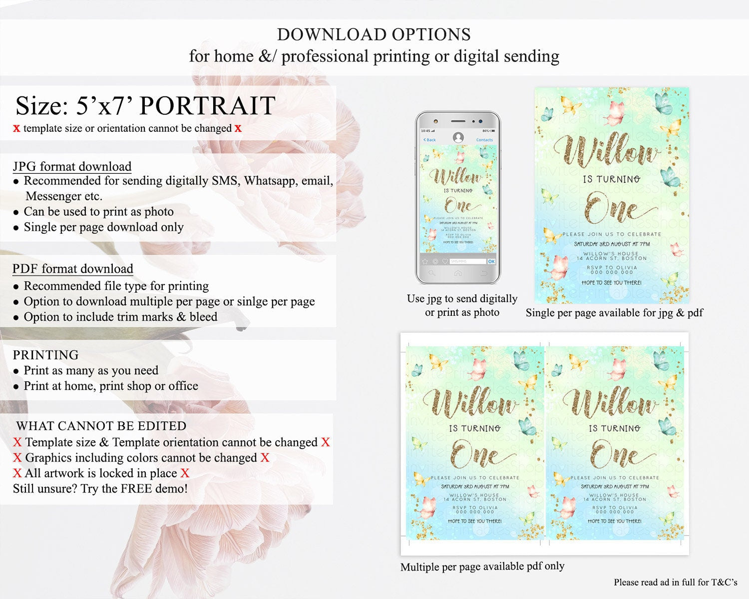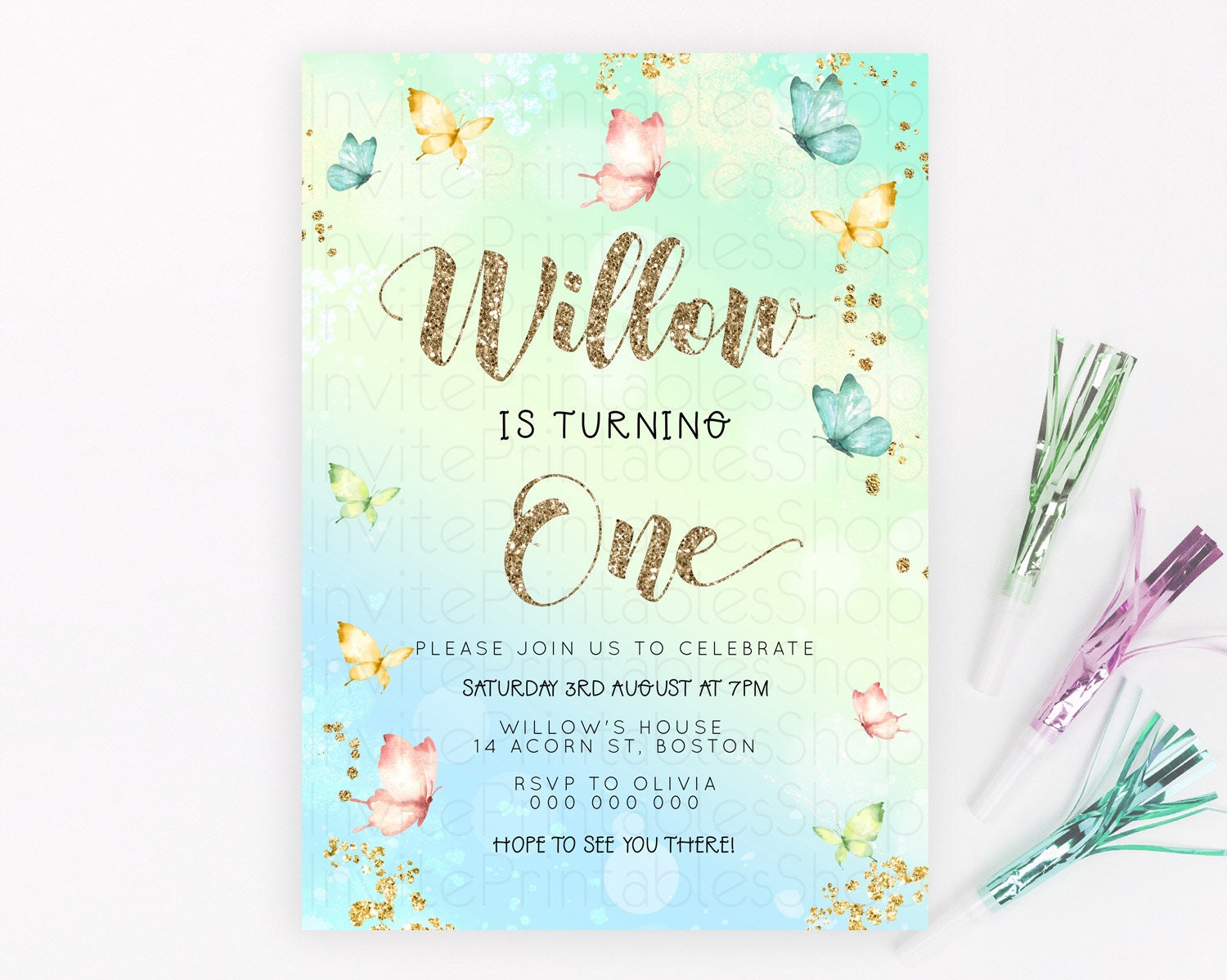 Pastel Butterfly Birthday Invitation Butterfly Birthday Invitation Colorful Splash Glitter Butterfly Garden 1st 2nd Birthday D23078