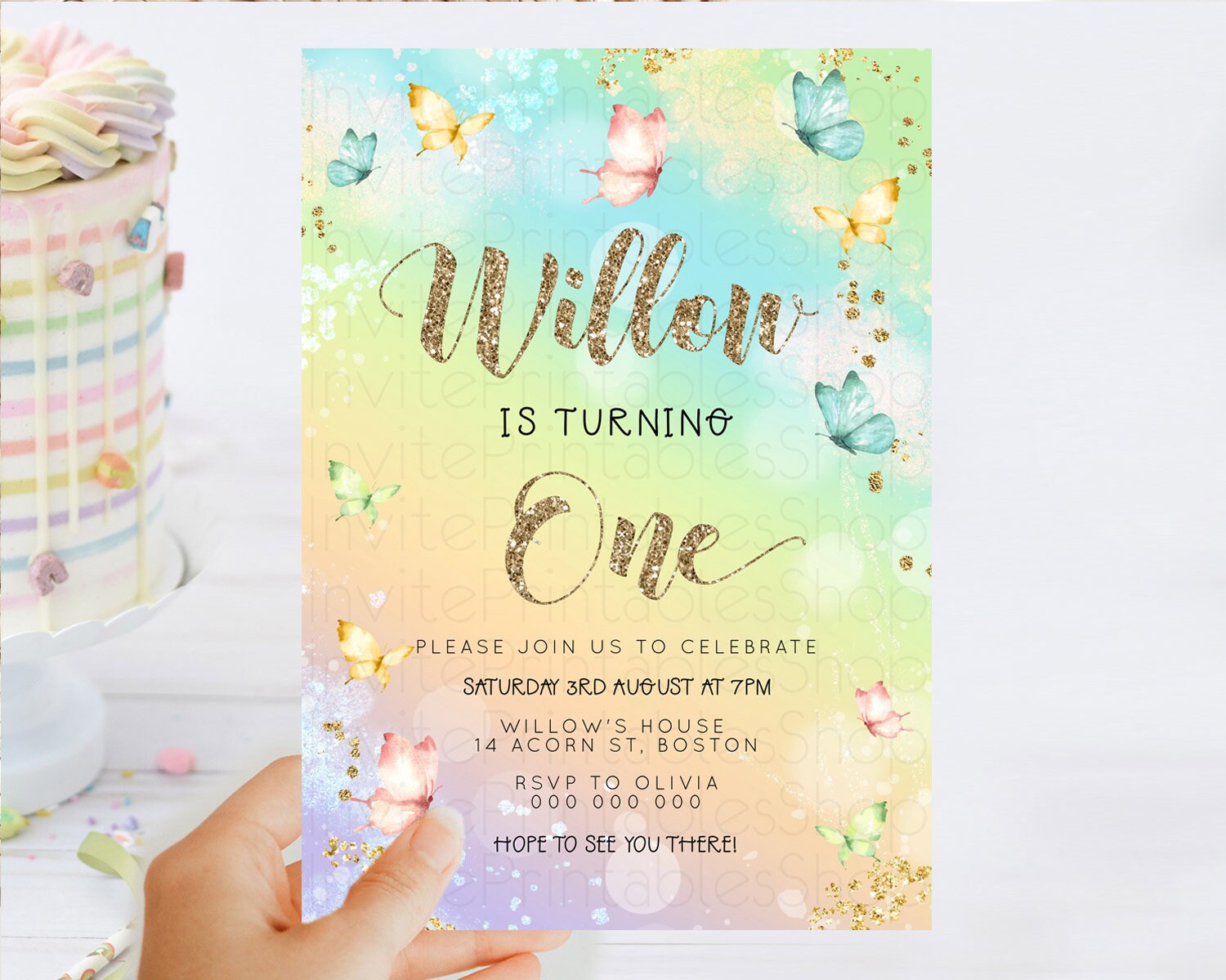 Pastel Butterfly Birthday Invitation Butterfly Birthday Invitation Colorful Splash Glitter Butterfly Garden 1st 2nd Birthday D23083