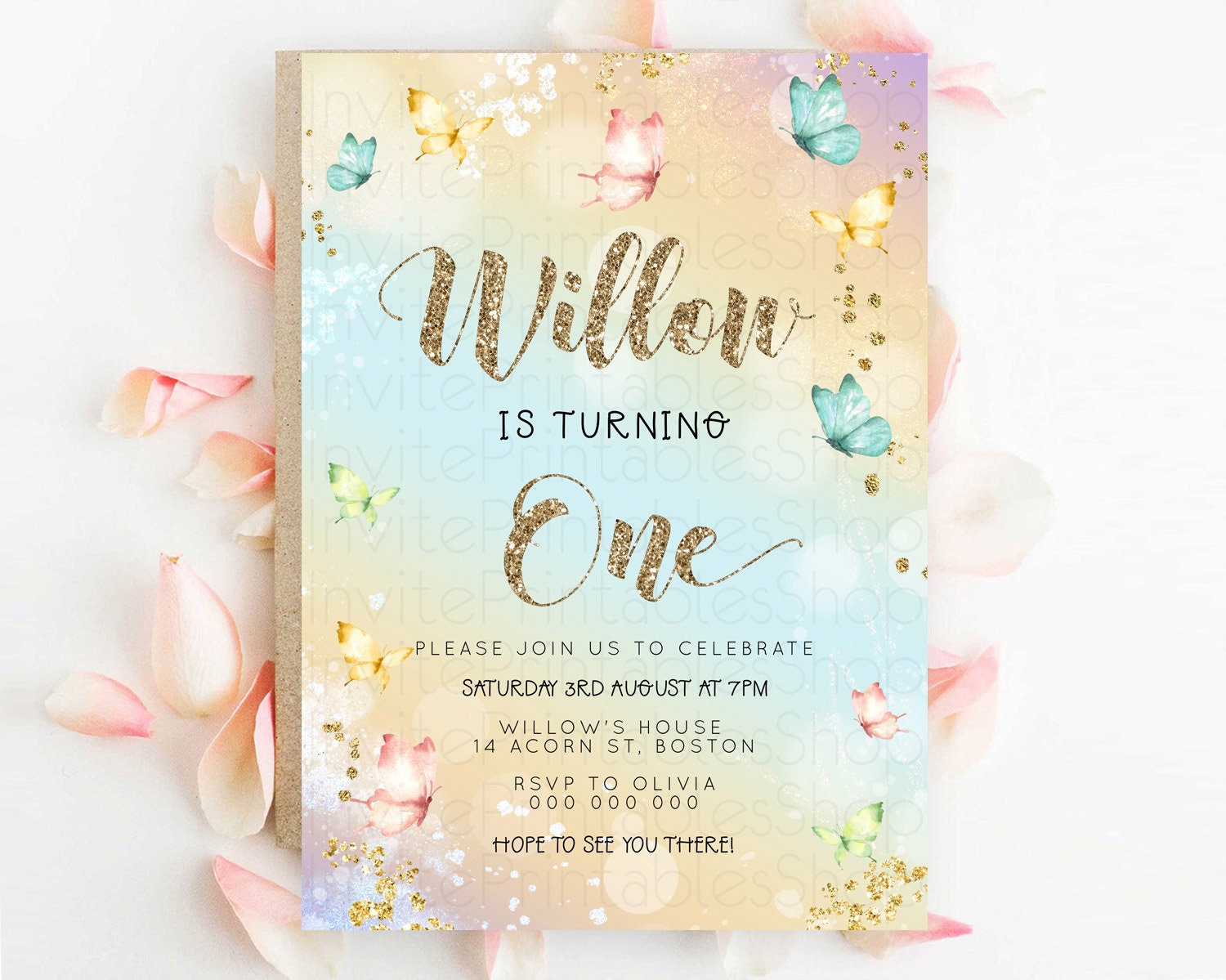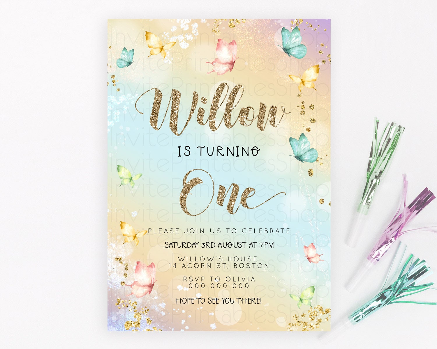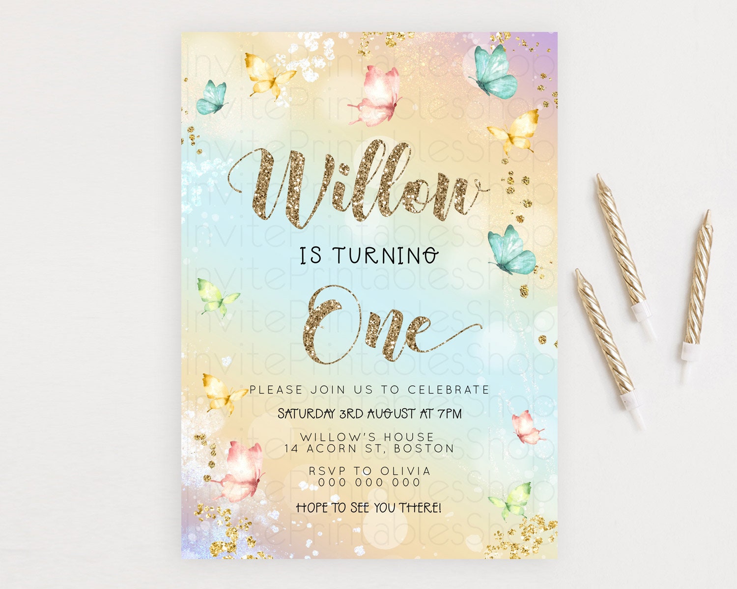 Pastel Butterfly Birthday Invitation Butterfly Birthday Invitation Colorful Splash Glitter Butterfly Garden 1st 2nd Birthday D23087