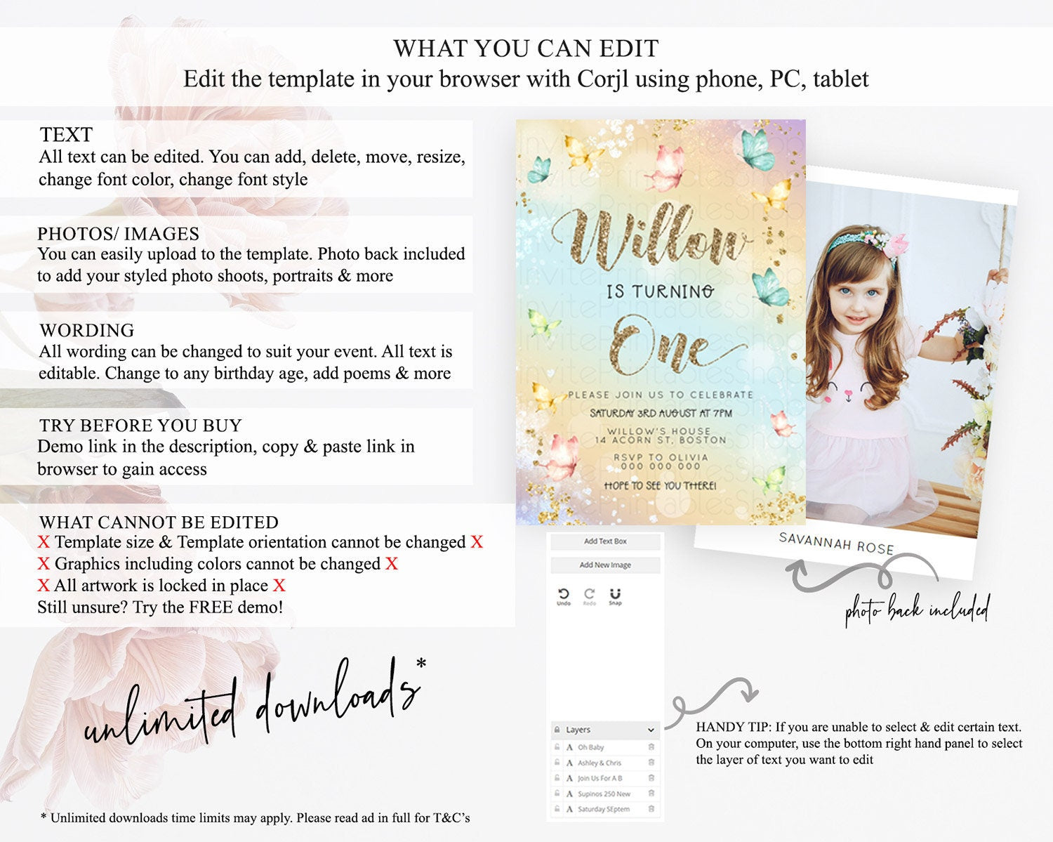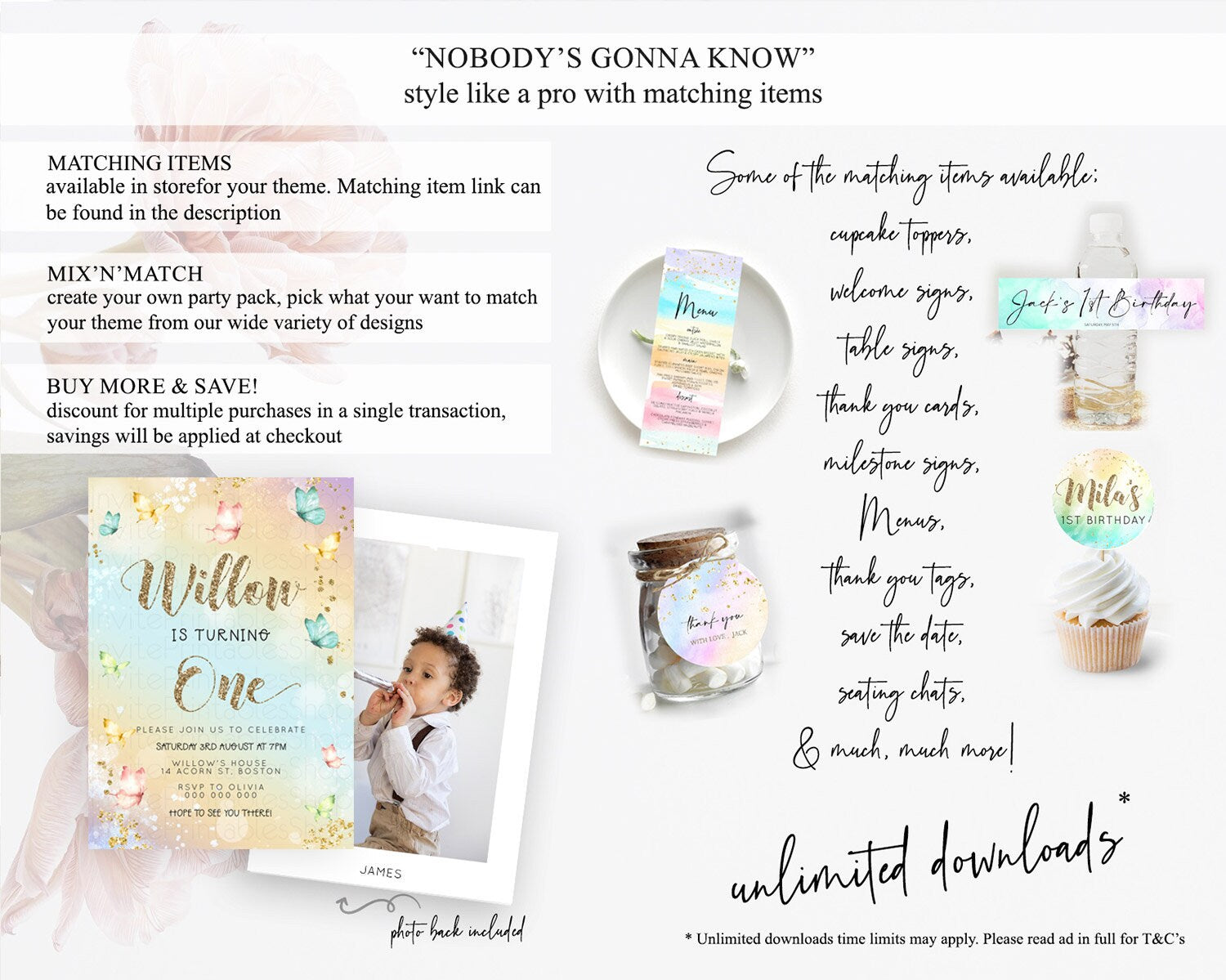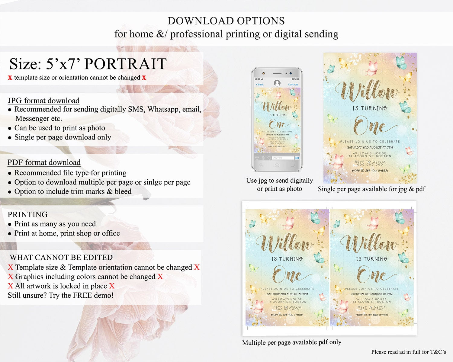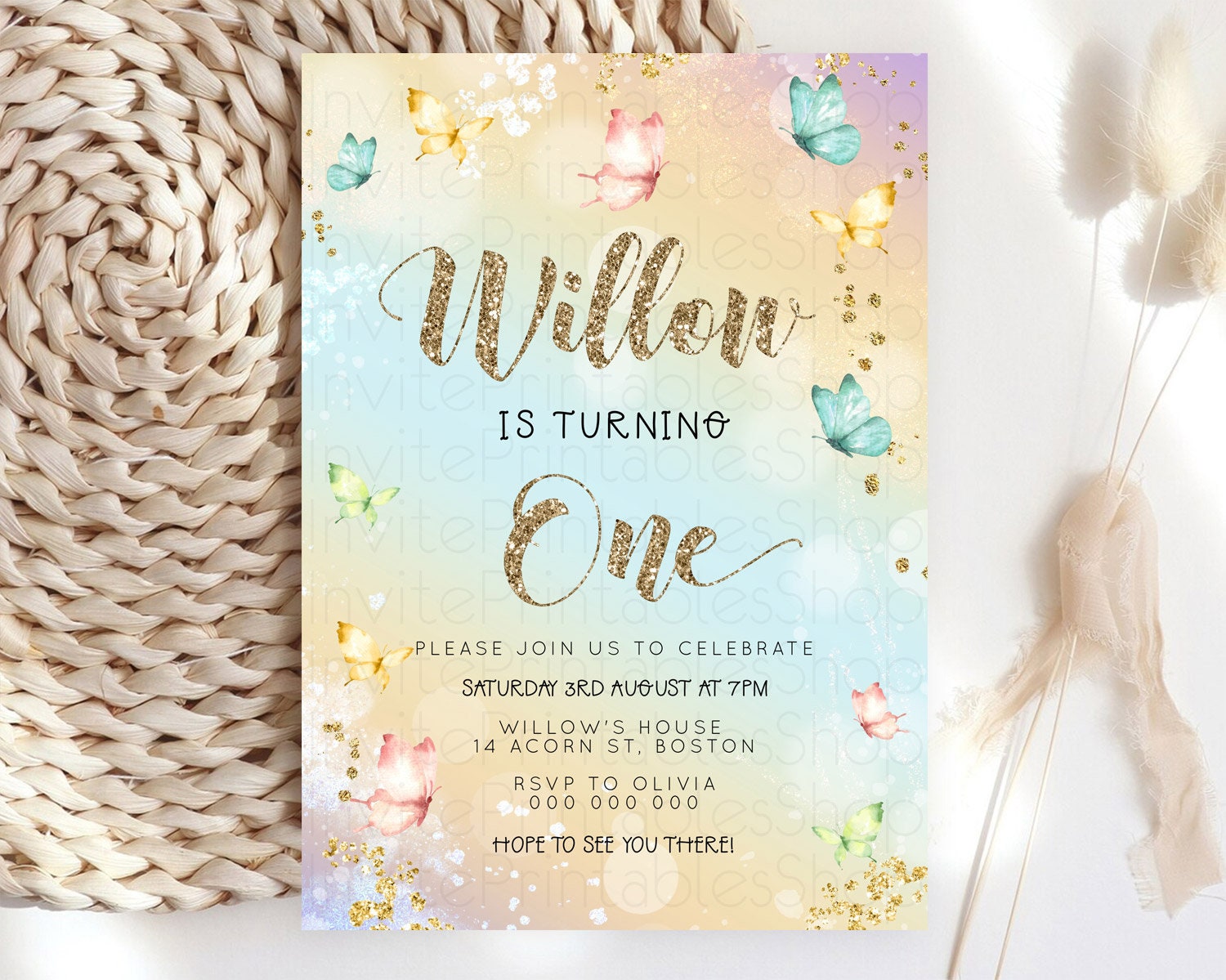 Pastel Butterfly Birthday Invitation Butterfly Birthday Invitation Colorful Splash Glitter Butterfly Garden 1st 2nd Birthday D23087