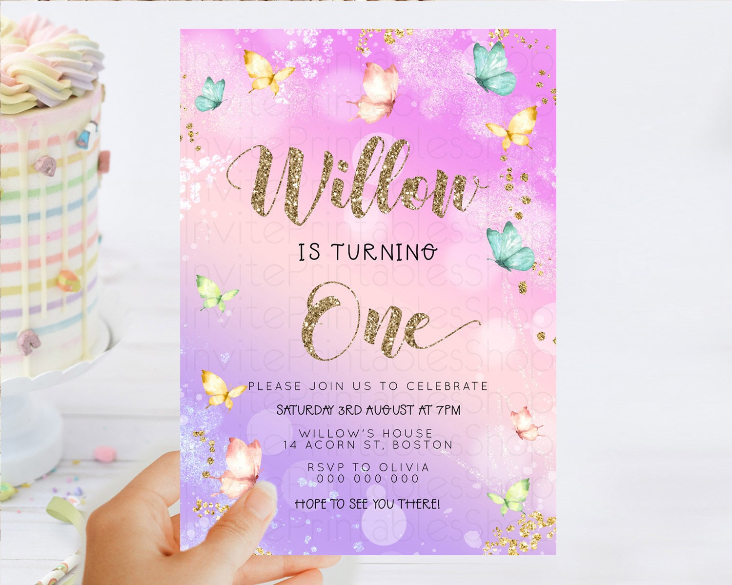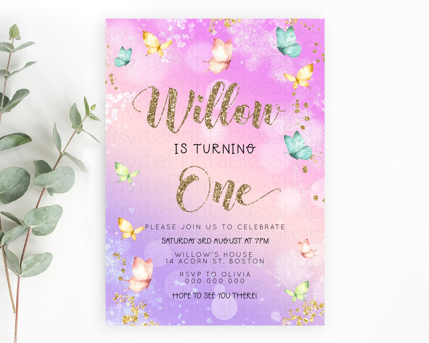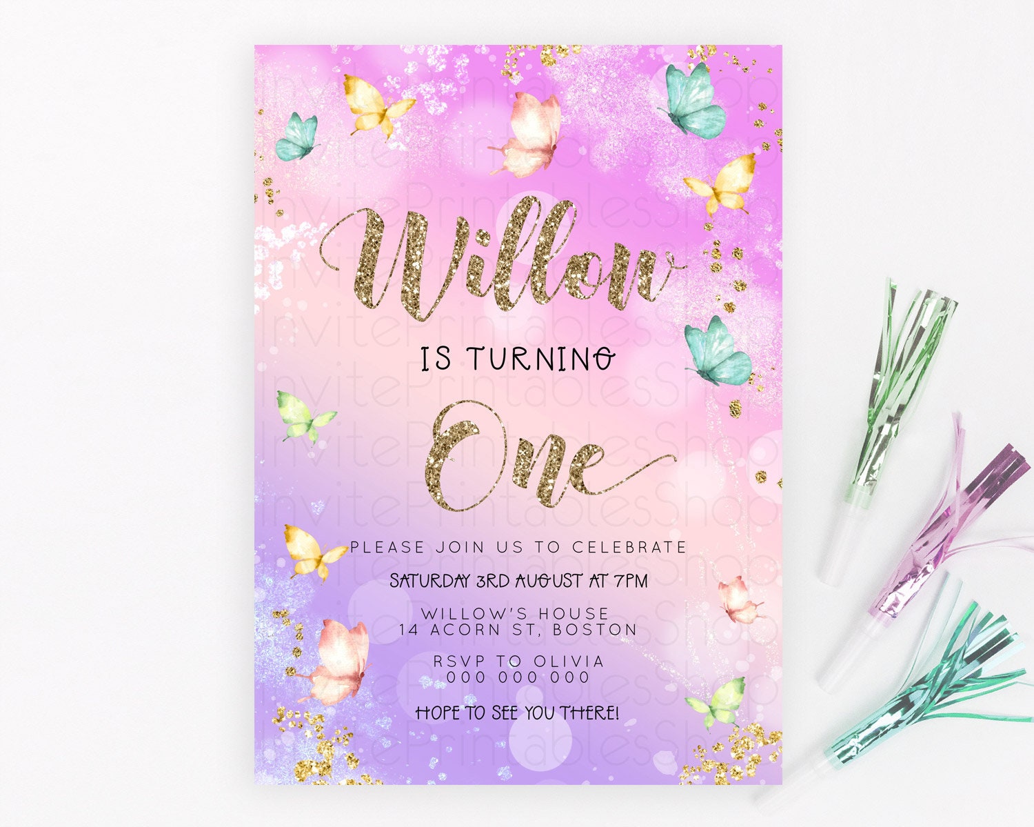 Pastel Butterfly Birthday Invitation Butterfly Birthday Invitation Colorful Splash Glitter Butterfly Garden 1st 2nd Birthday D23092