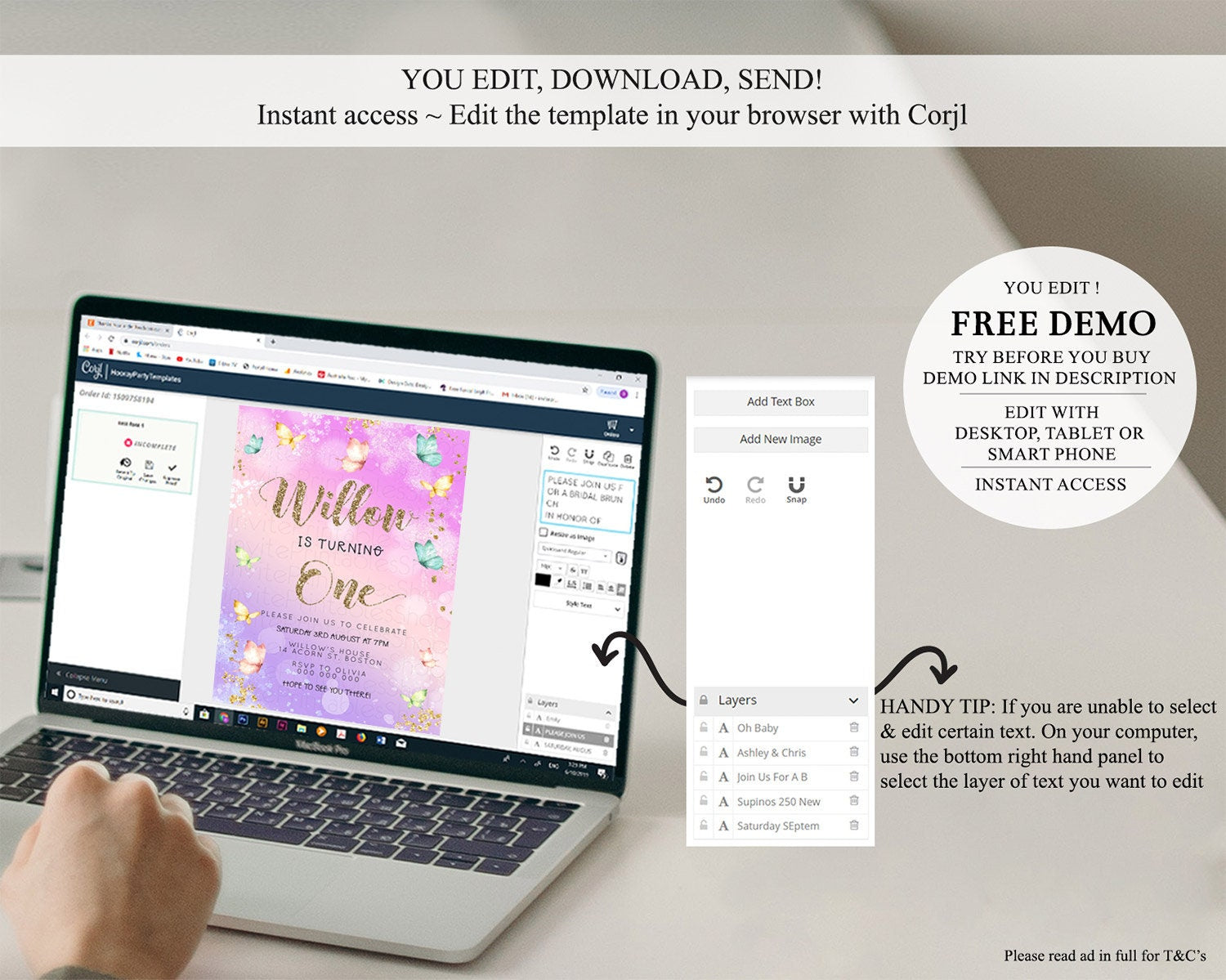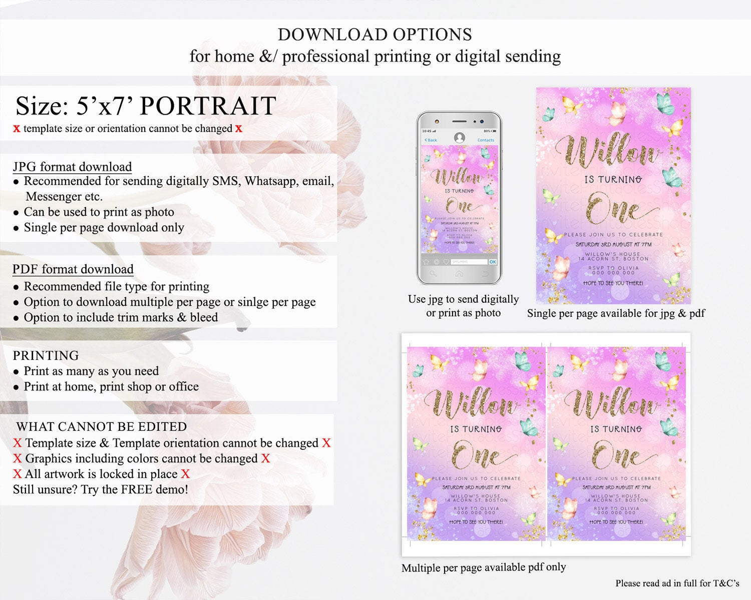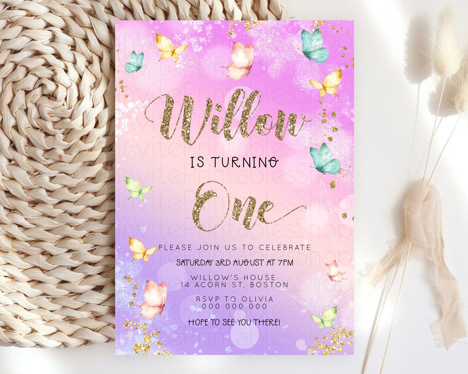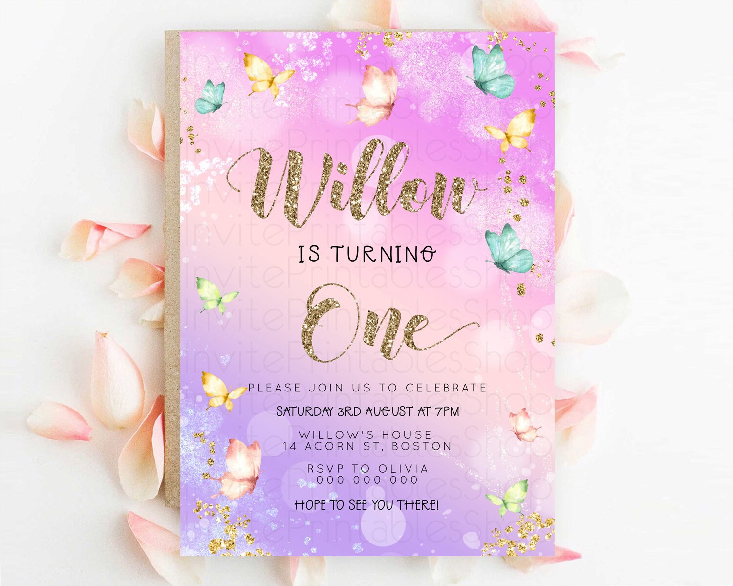 Pastel Butterfly Birthday Invitation Butterfly Birthday Invitation Colorful Splash Glitter Butterfly Garden 1st 2nd Birthday D23092