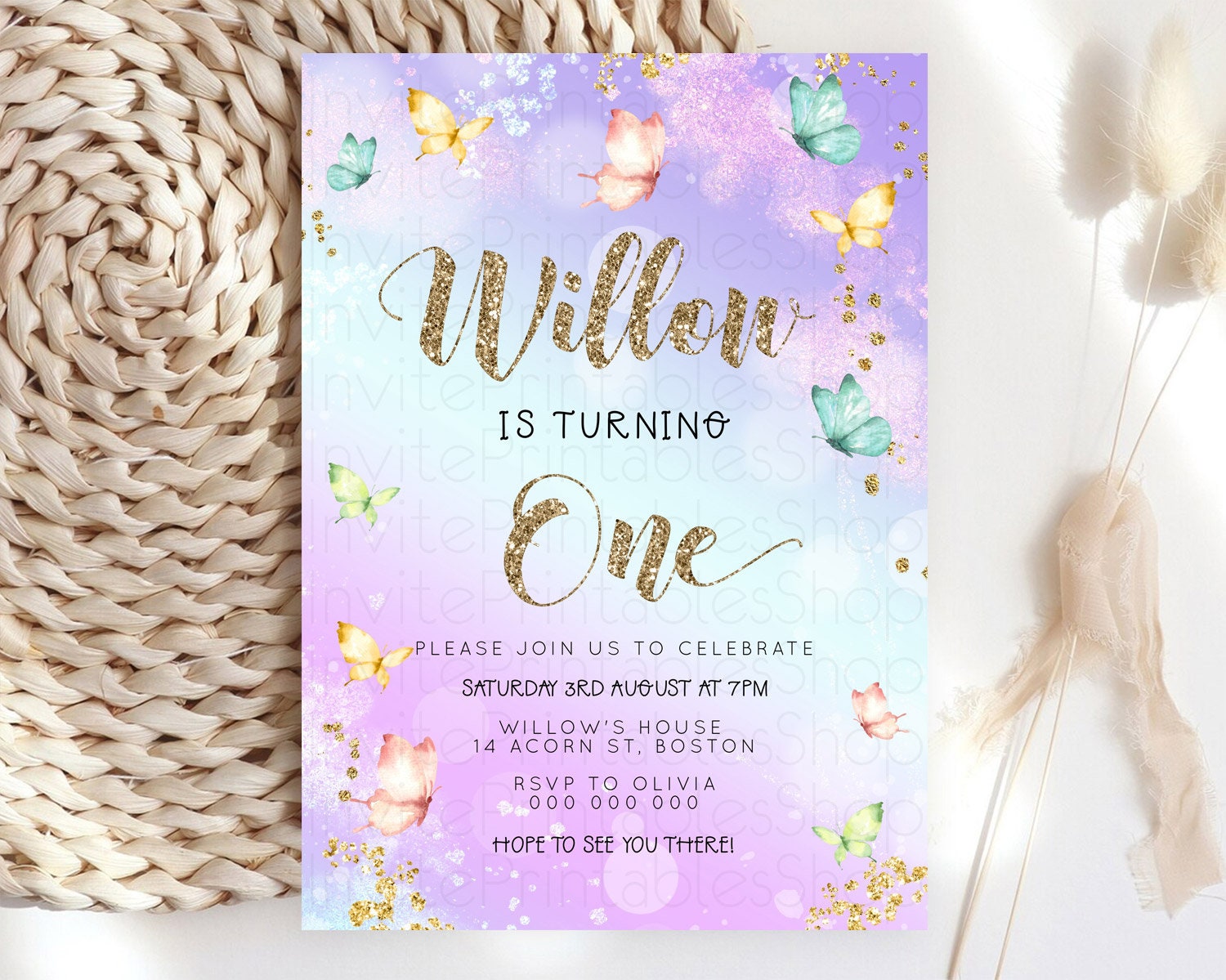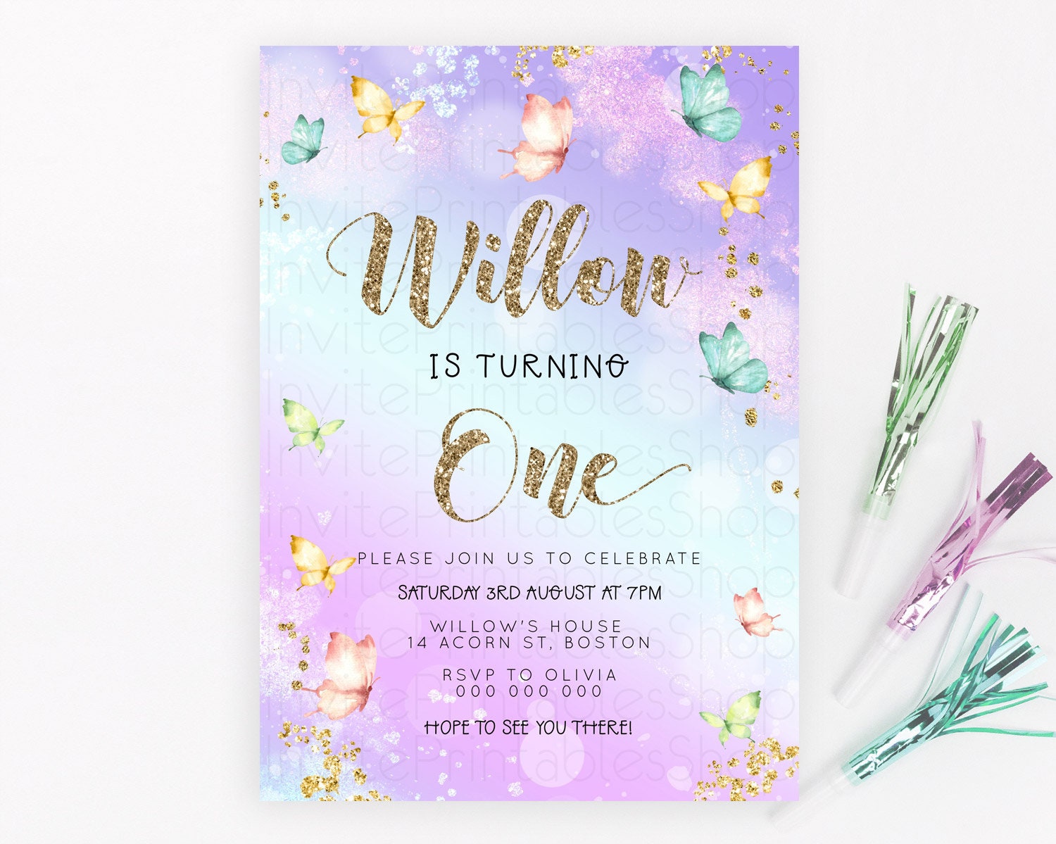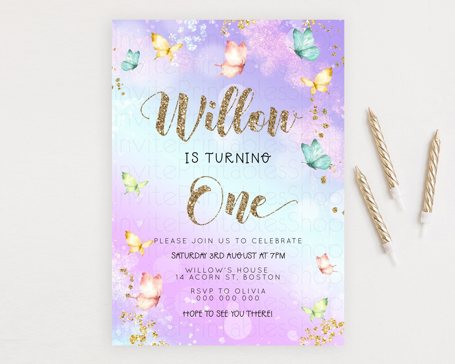 Pastel Butterfly Birthday Invitation Butterfly Birthday Invitation Colorful Splash Glitter Butterfly Garden 1st 2nd Birthday D23094